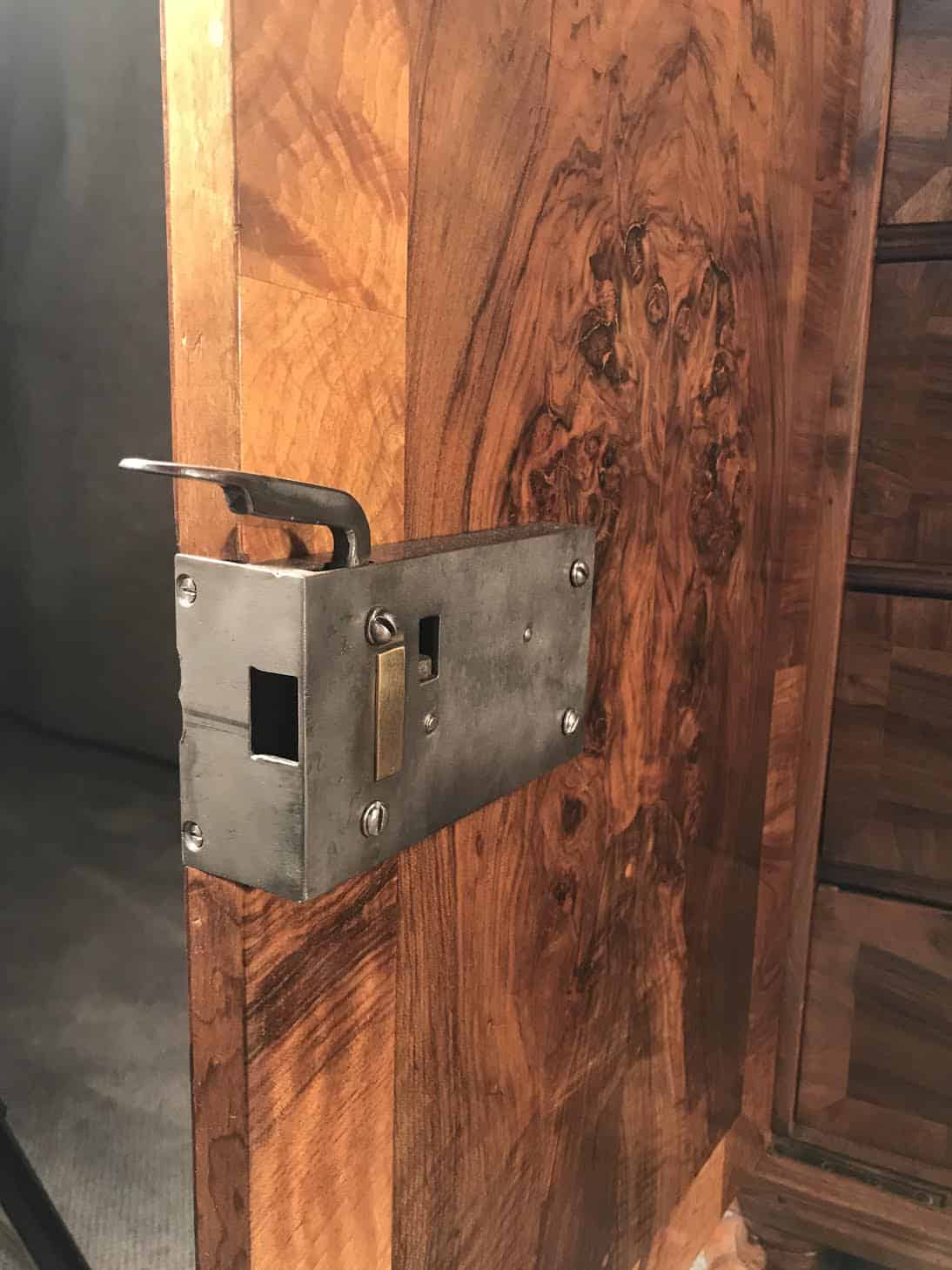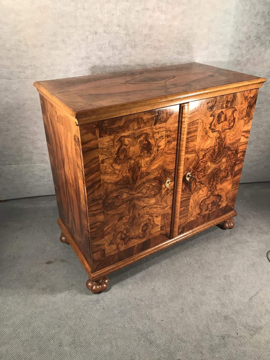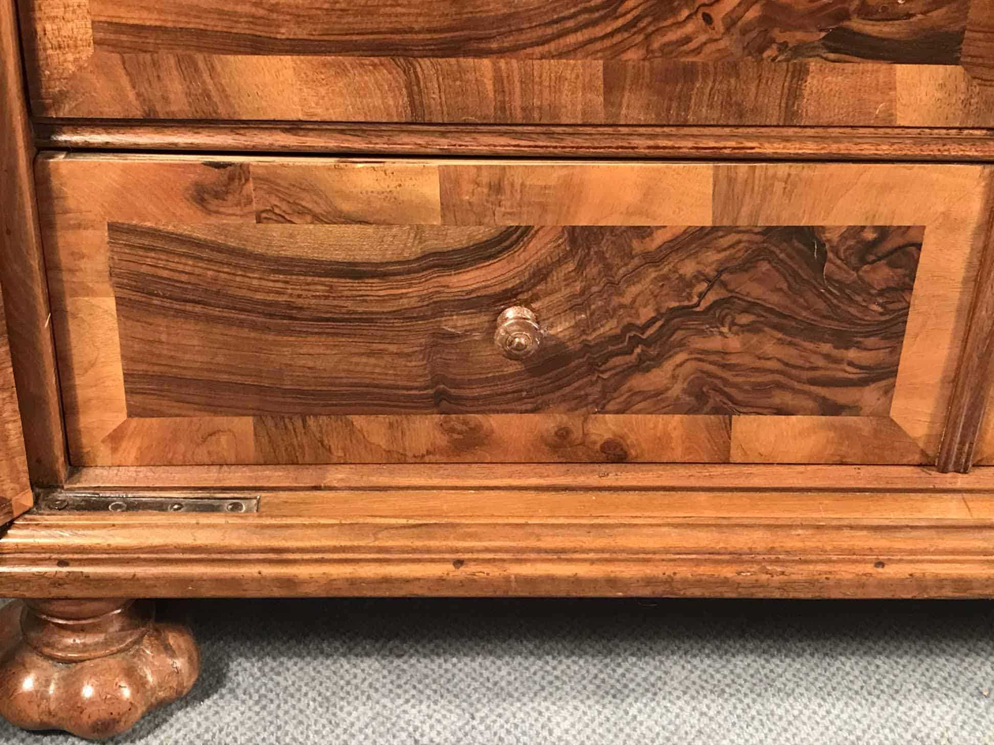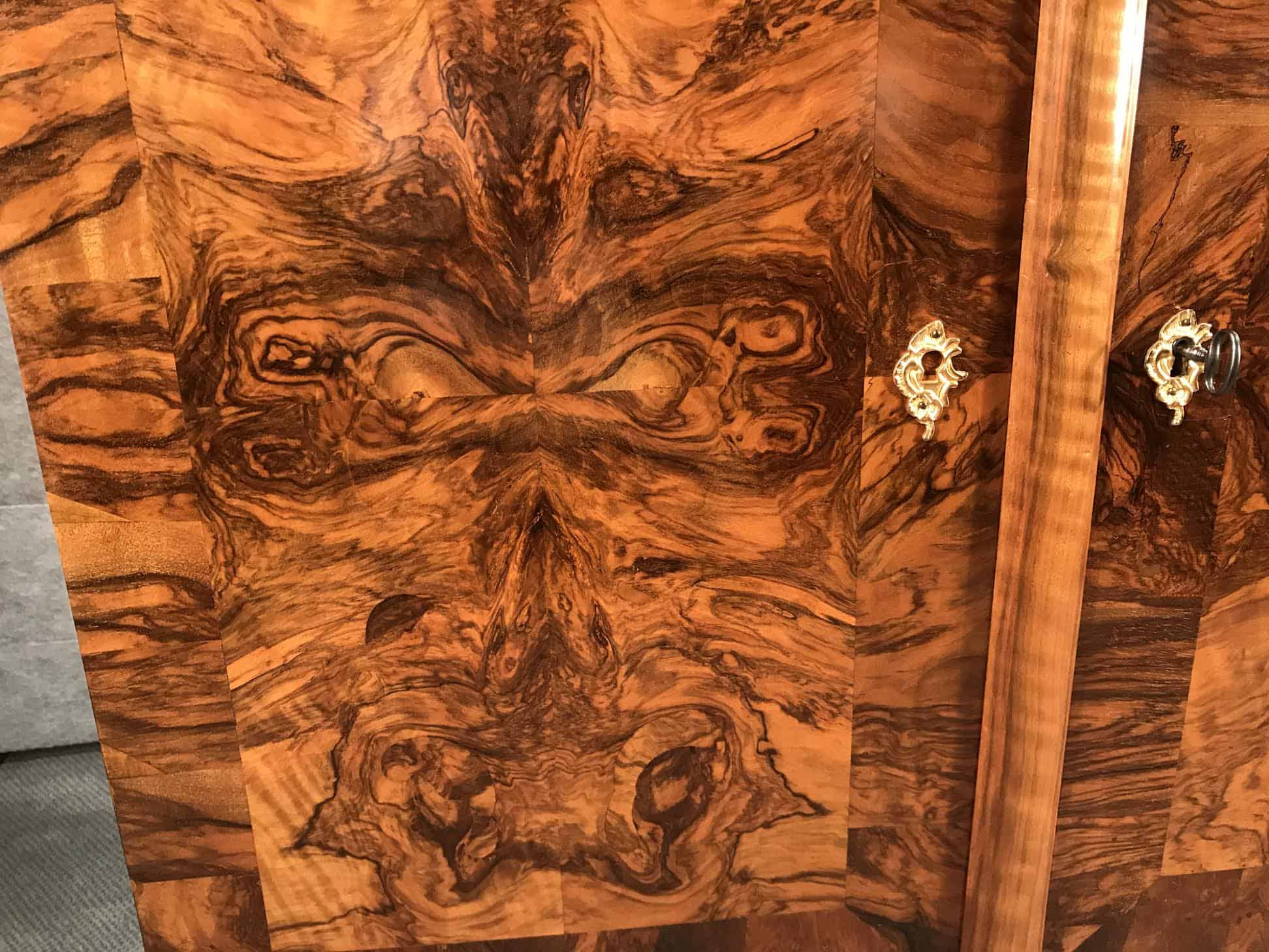 This Baroque sideboard dates back to the second half of the 18th century and comes from Switzerland. The cabinet has two doors, behind them are 9 smaller drawers. The drawers and the outside and inside of the doors have a gorgeous walnut veneer. Another special feature are the four unusual original Baroque feet. Top and sides are also embellished with walnut veneer.