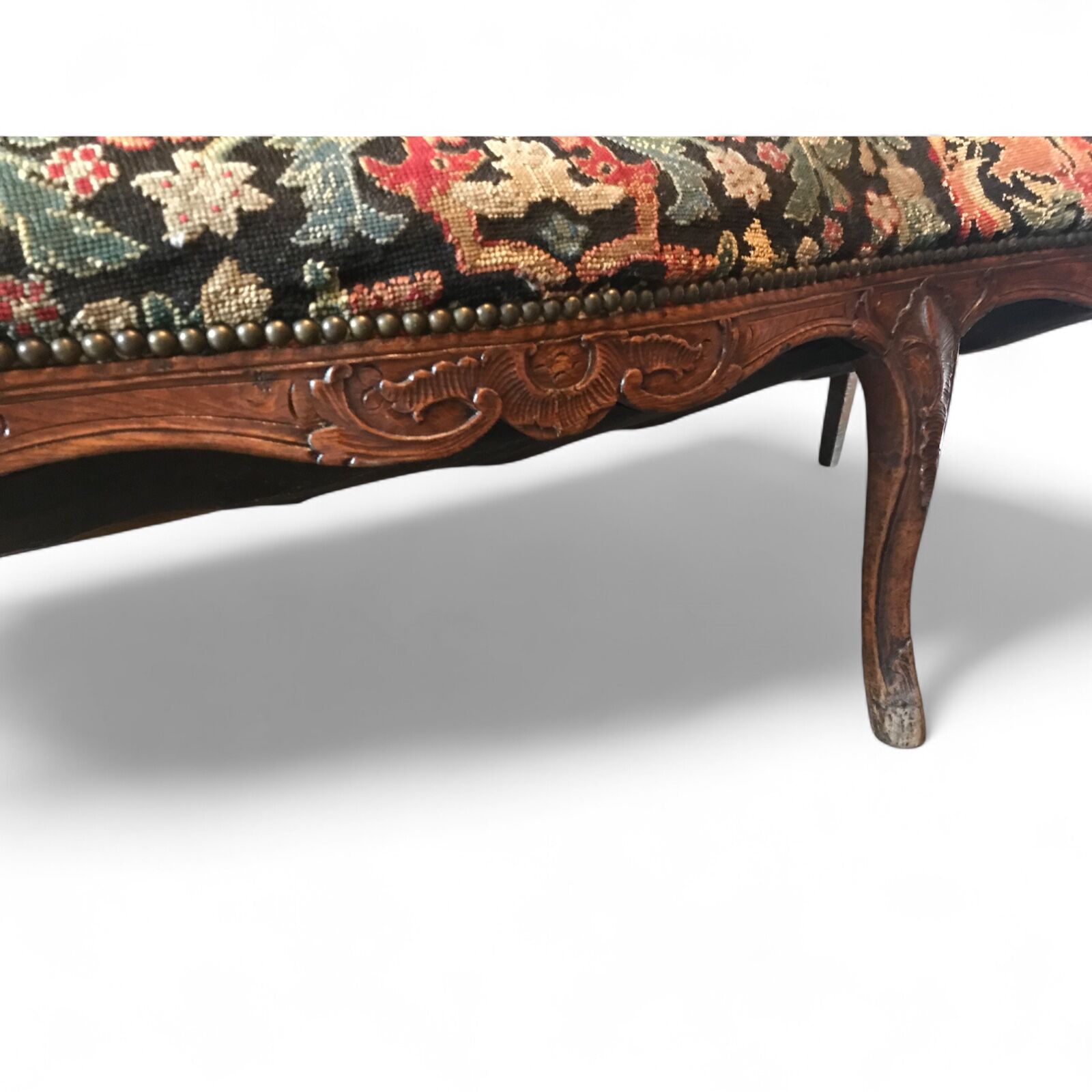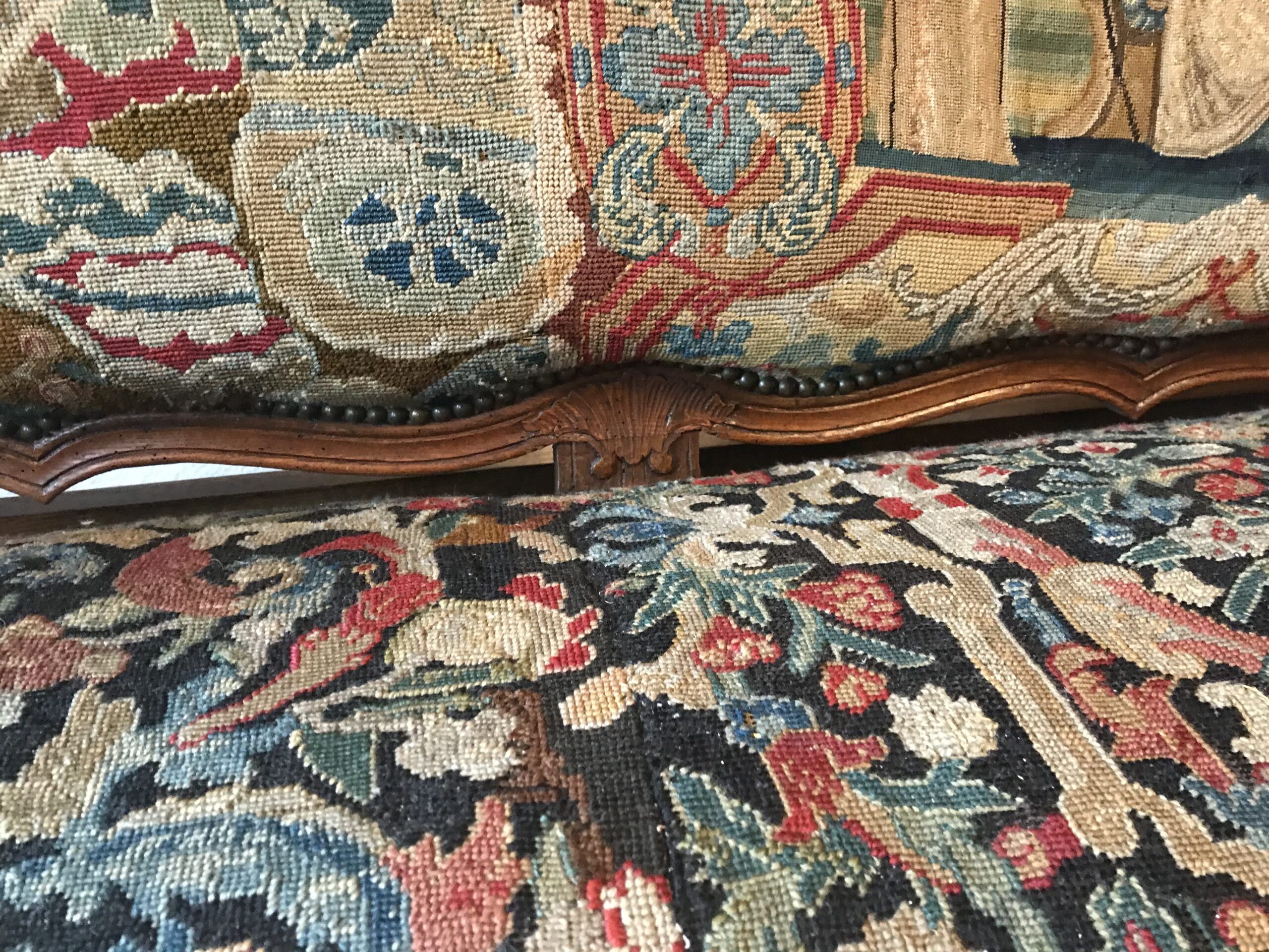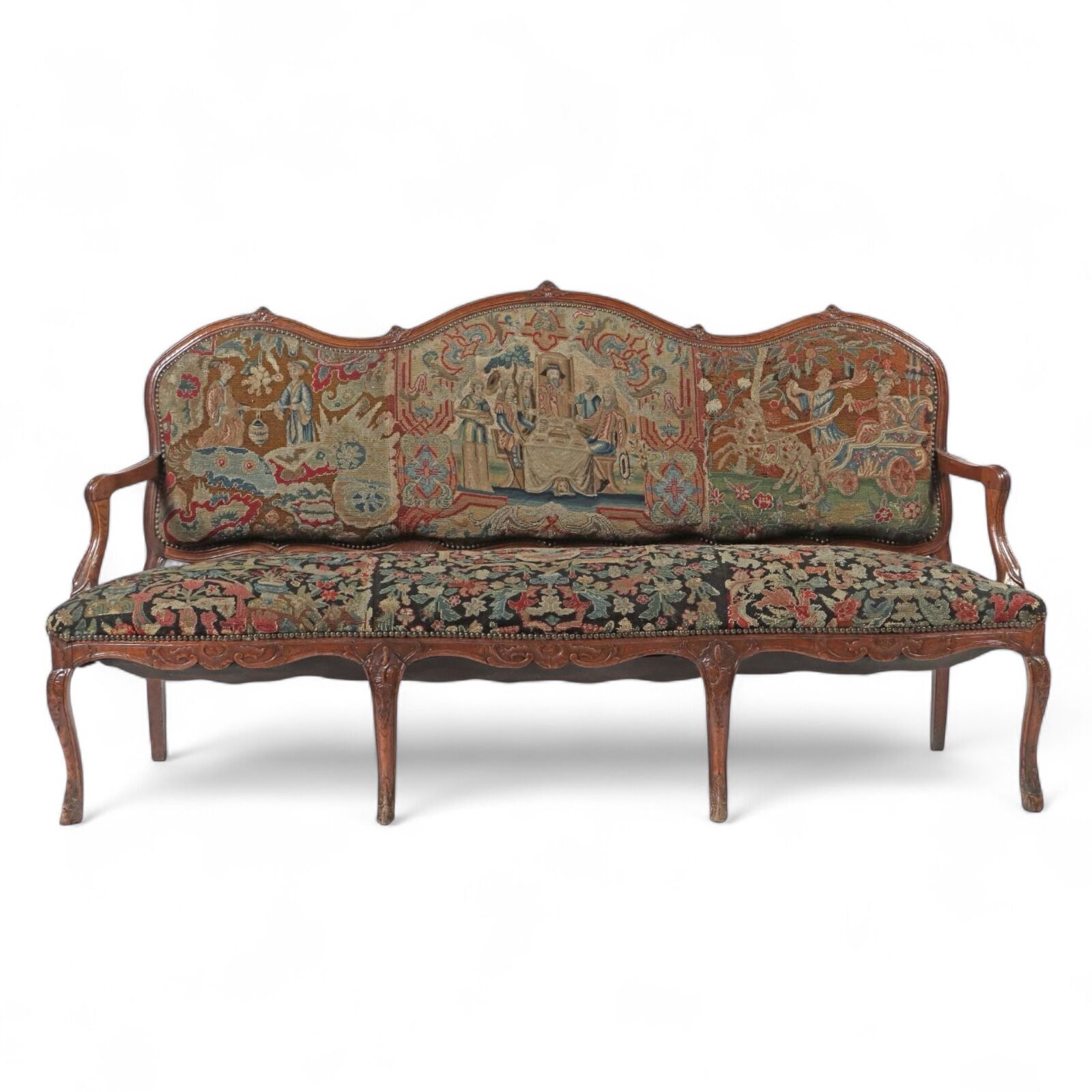 This exquisite Baroque sofa from Germany, circa 1750, features a finely hand-carved walnut frame with intricate details typical of the 18th century. The upholstery is an exceptional 18th–19th century needlepoint fabric of very good quality, richly decorated with mythological scenes and a central court motif on the backrest. The seat displays a vibrant floral design, adding both elegance and charm.
