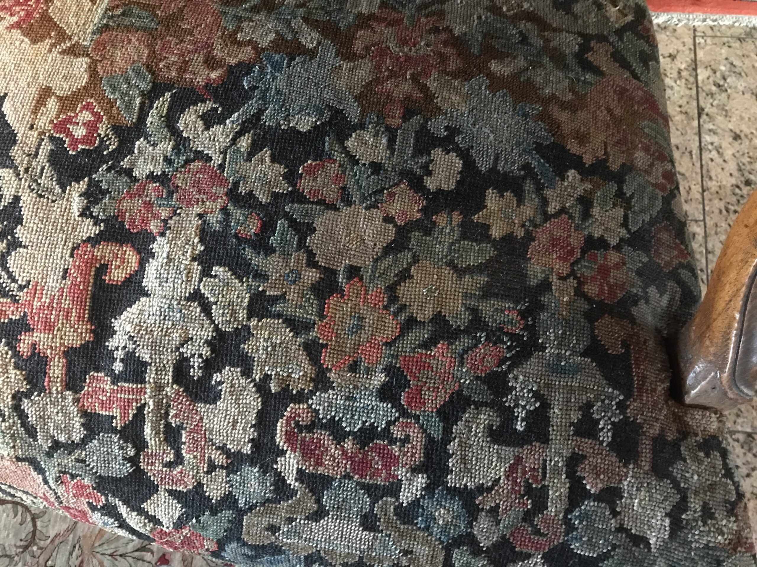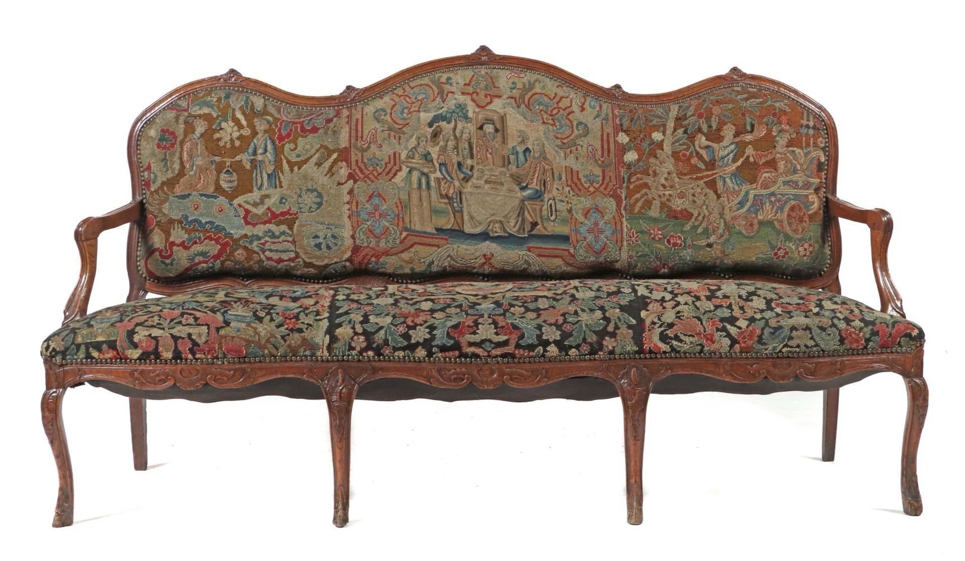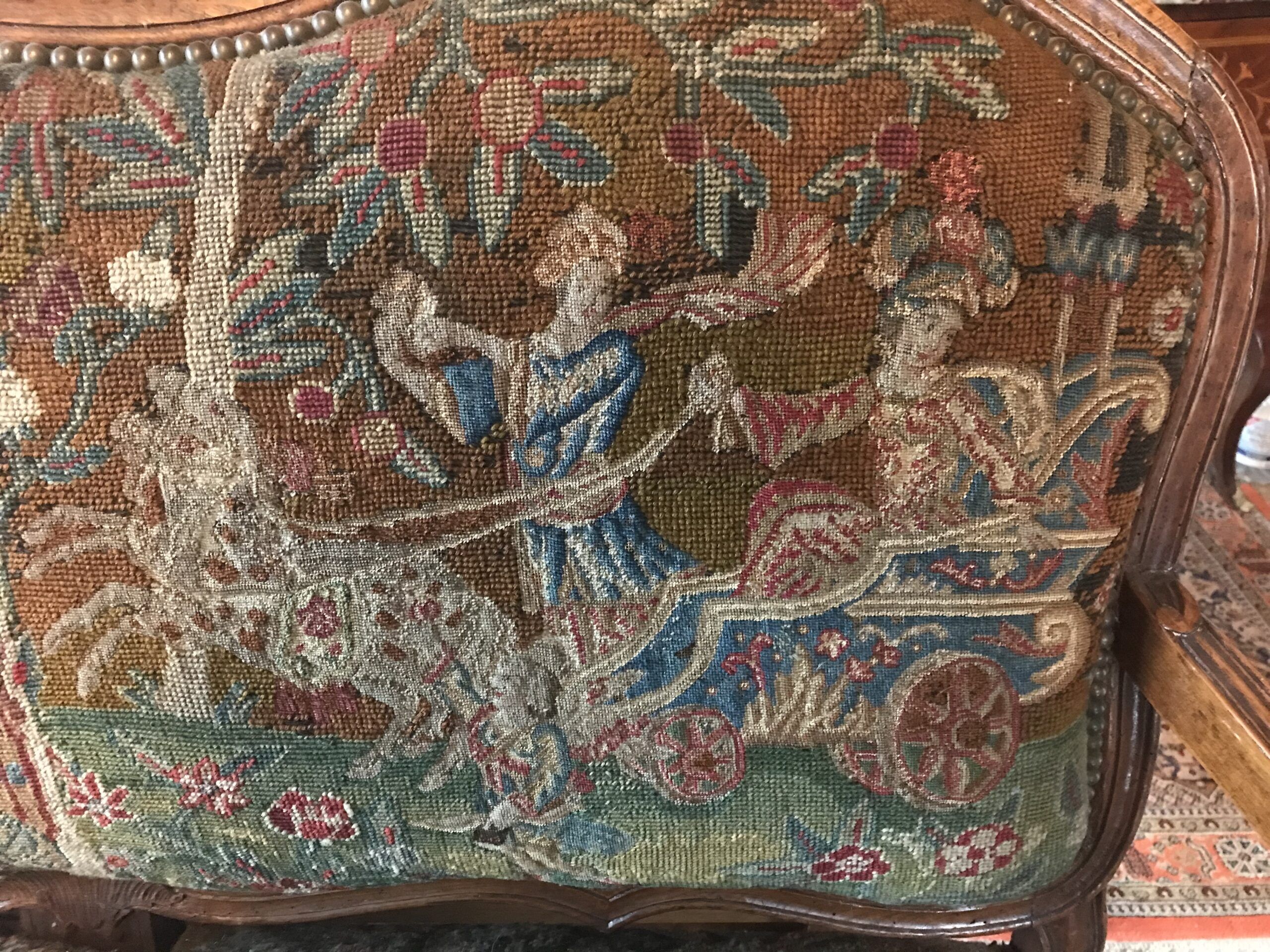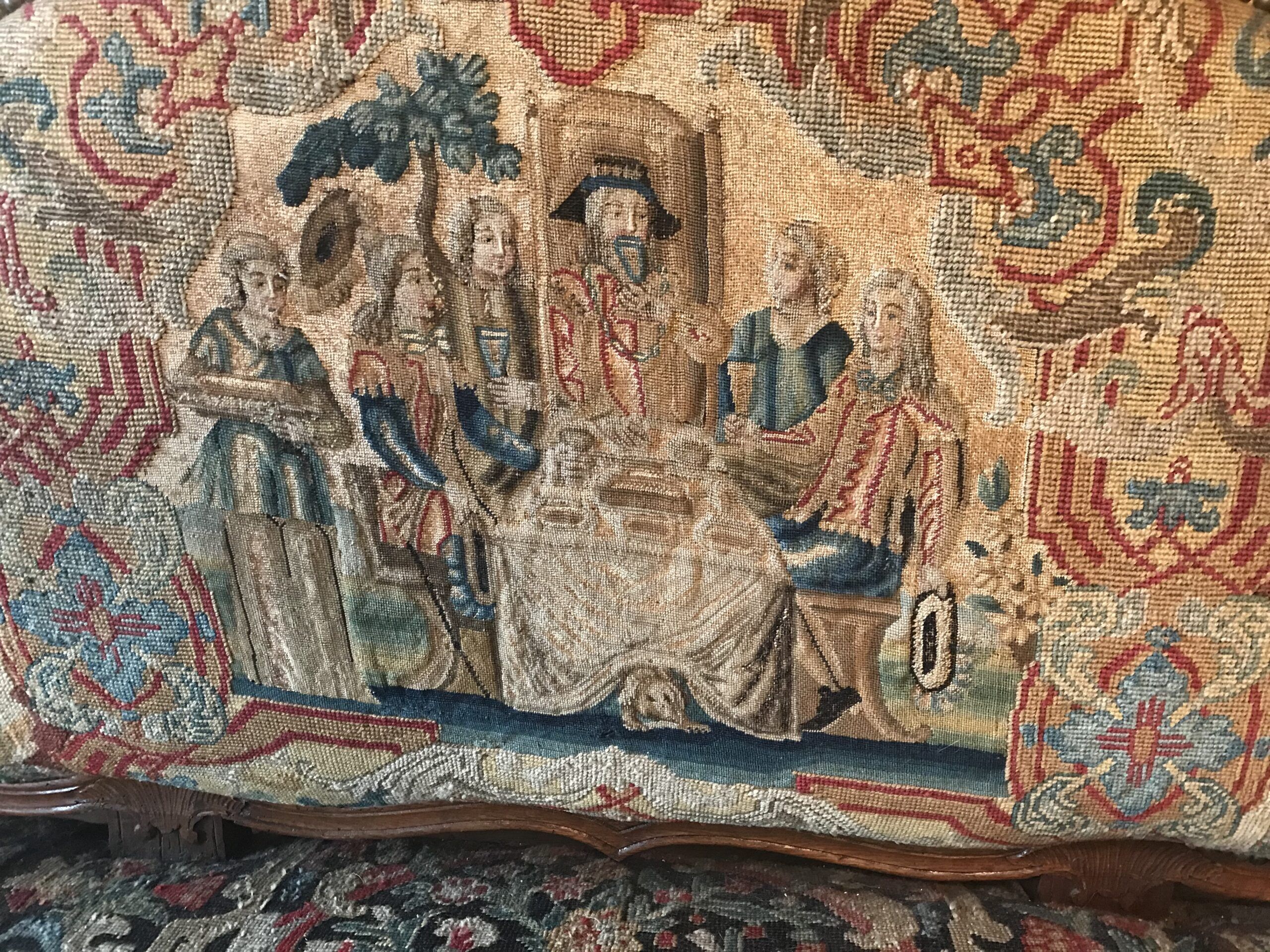 This exquisite Baroque sofa from Germany, circa 1750, features a finely hand-carved walnut frame with intricate details typical of the 18th century. The upholstery is an exceptional 18th–19th century needlepoint fabric of very good quality, richly decorated with mythological scenes and a central court motif on the backrest. The seat displays a vibrant floral design, adding both elegance and charm.