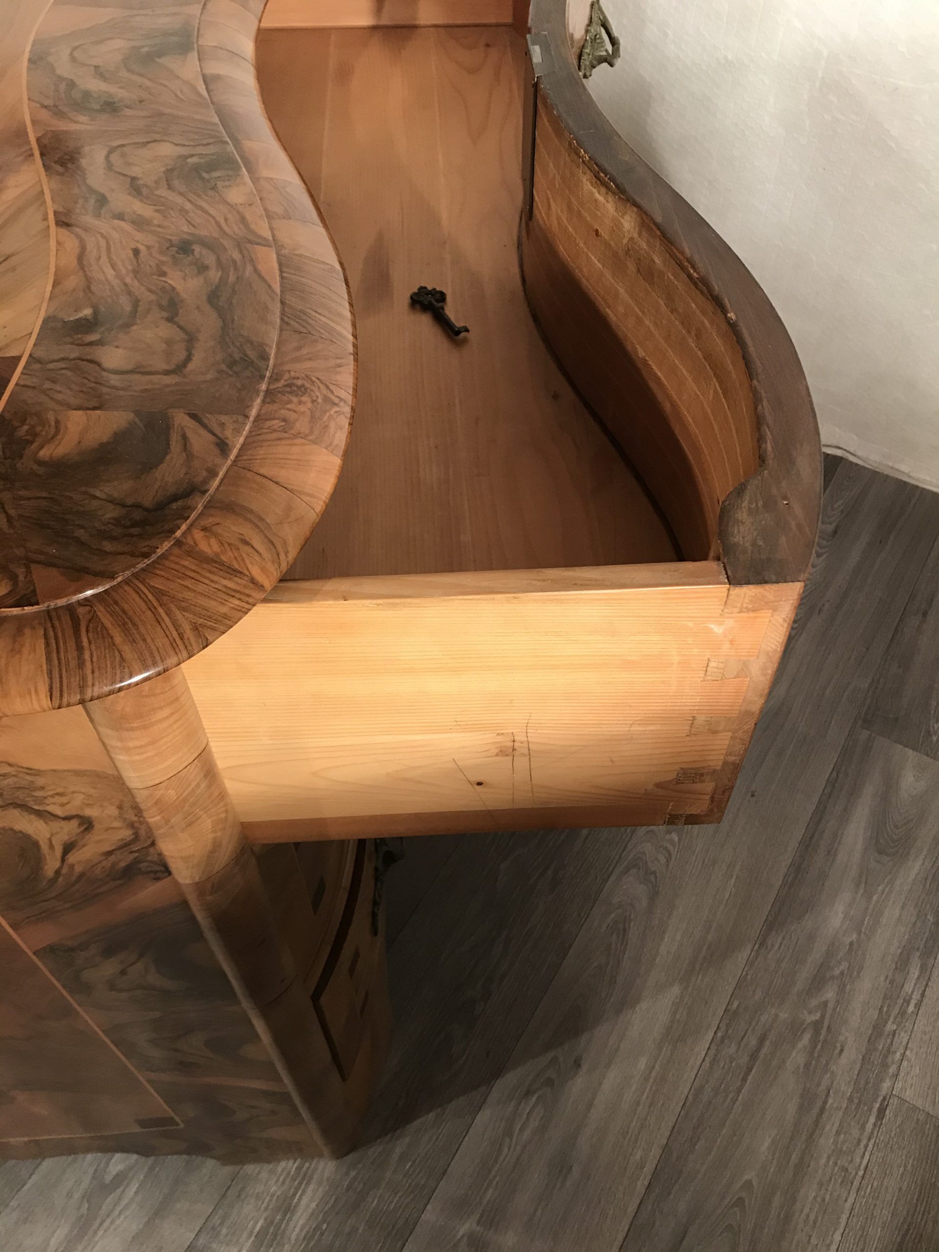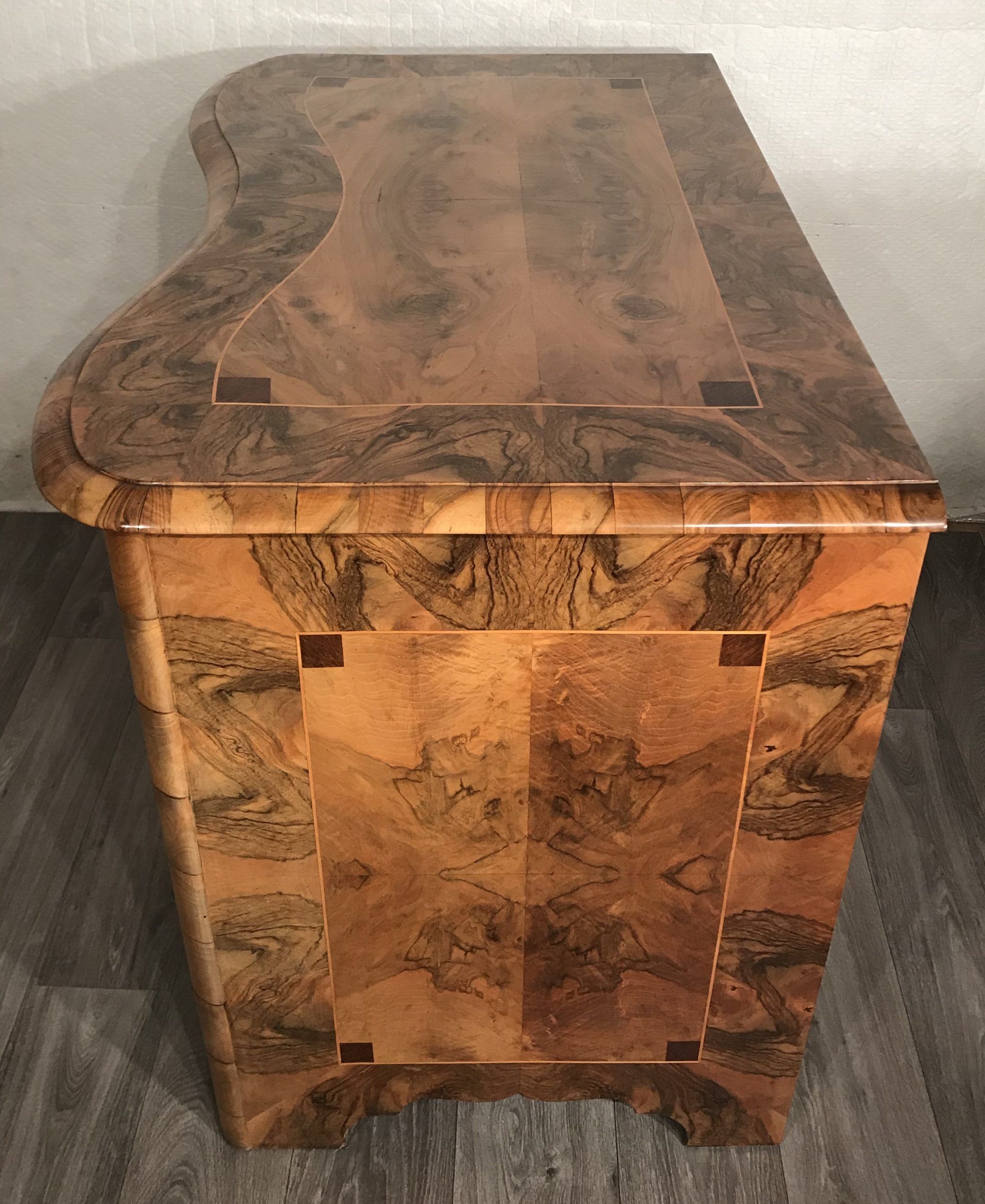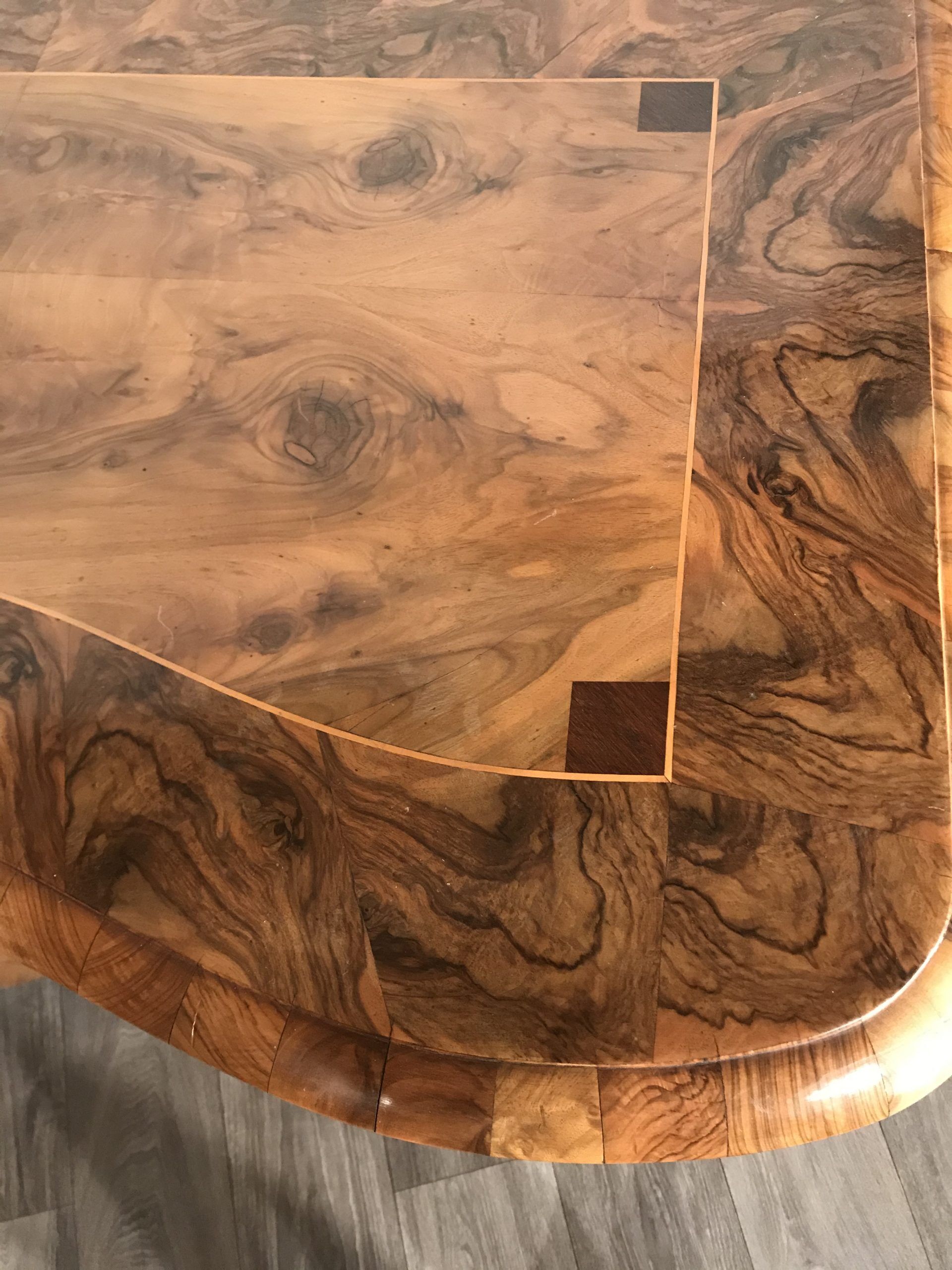Walnut veneer and mahogany intarsia.