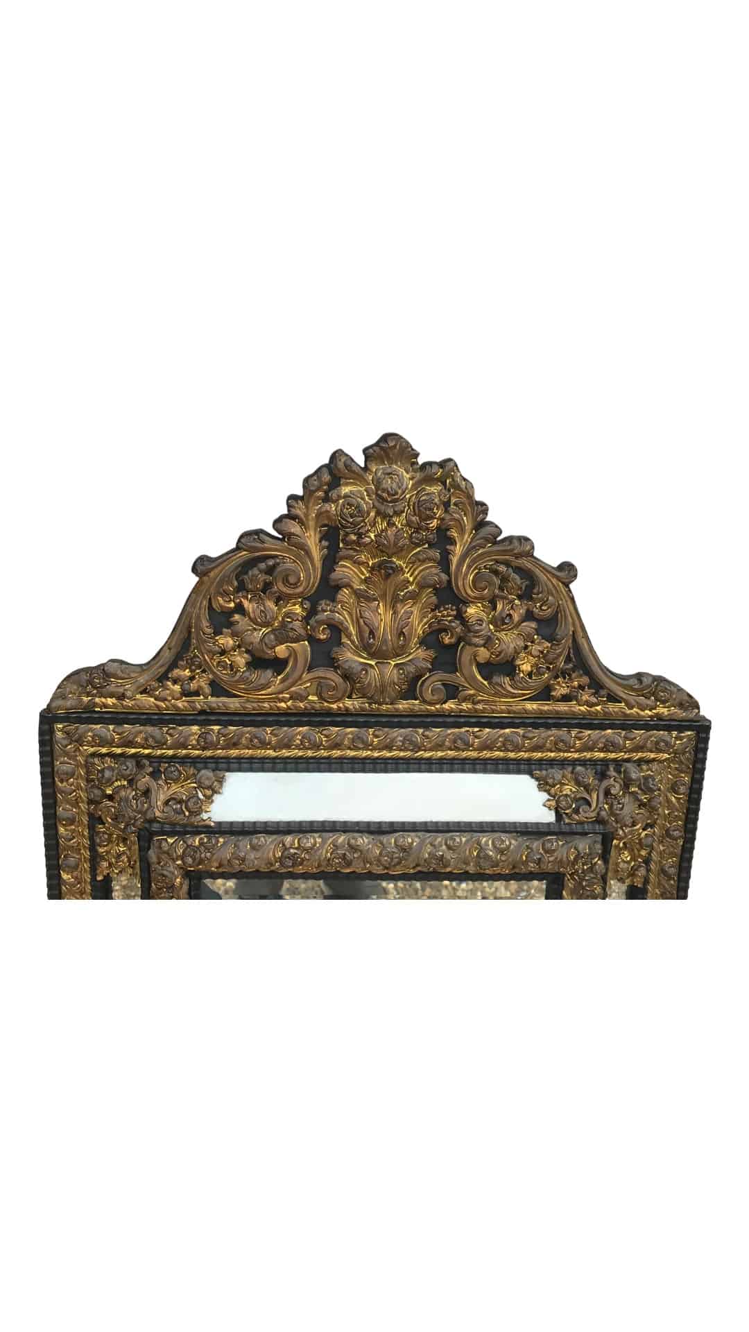 This beautiful unique Baroque mirror was made in the 18th-19th century in Belgium. The frame features a hammered brass decor with flower and acanthus leave motifs. The mirror glass is original. The Baroque wall mirror is in good original condition. It is a very decorative piece.