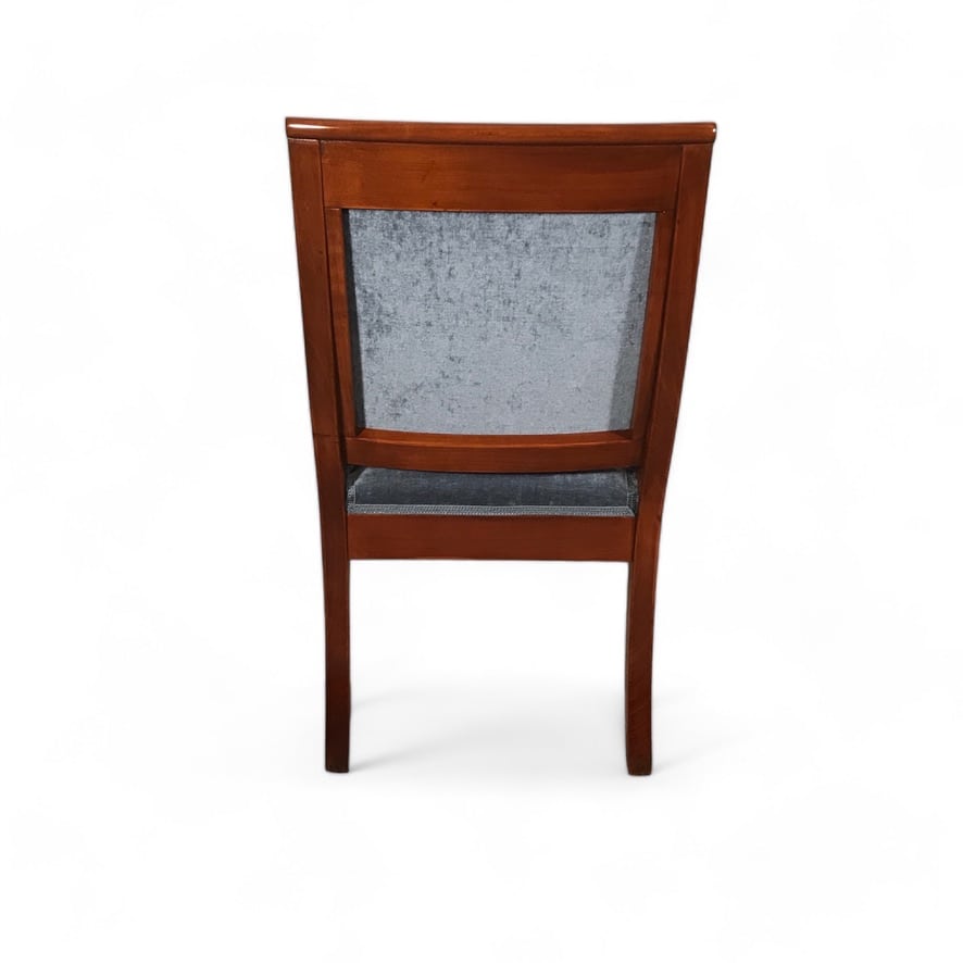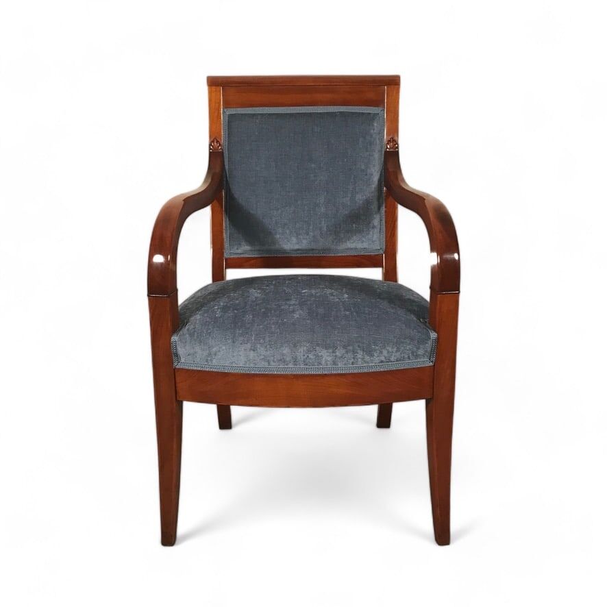 Discover a stunning Biedermeier armchair, exuding timeless elegance and originating from southern Germany around 1820. This exquisite armchair boasts a beautiful cherry veneer, adding to its sophisticated charm. Crafted with attention to detail, the armchair features gracefully curved armrests adorned with intricate seashell decorations on the upper ends, showcasing the artistry of the era. Standing gracefully on protruding legs. Recently expertly refinished, the armchairs now gleam with a shellac hand polish, restoring their original allure and ensuring lasting beauty. The chairs also boast a brand-new upholstery, luxuriously covered in a blue velour fabric, which enhances their comfort and complements their timeless design. Experience the blend of history, artistry, and refinement with these tasteful Biedermeier armchair a perfect addition to any discerning collector’s or connoisseur’s space.
