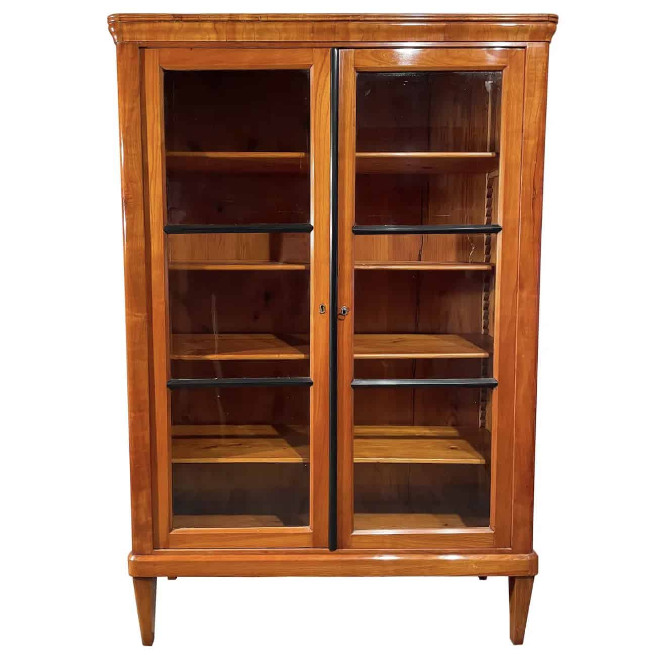 This Biedermeier Bookcase showcases the warm glow of a cherry wood veneer. A glass-doored library cabinet, the bookcase features 4 continuous shelves, providing a wealth of storage in a refined 19th century middle-class style.