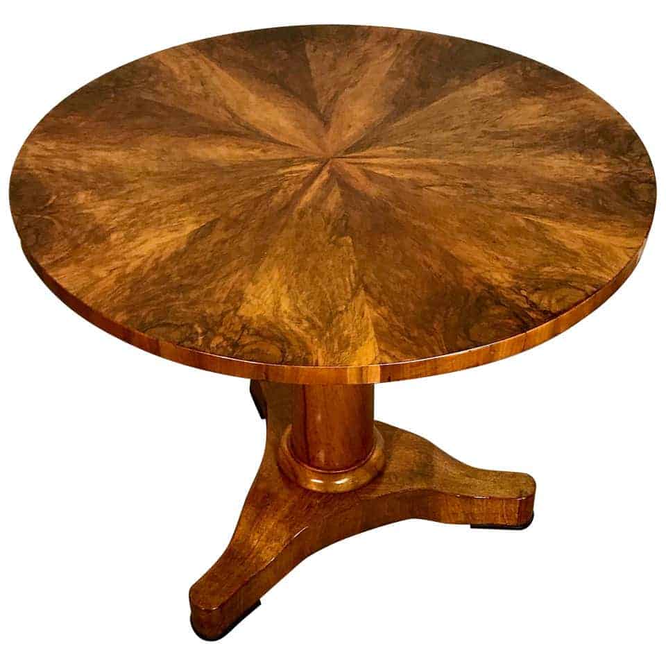 This original Biedermeier center table has a gorgeous walnut veneer. The top has a nicely figured piecrust veneer. The table is raised on a cylindrical foot which stands on a trefoil base. Walnut veneer also decorates foot and base. This table could also used as a dining table for up to four chairs. It would also be a nice table for a breakfast nook.