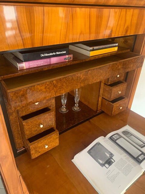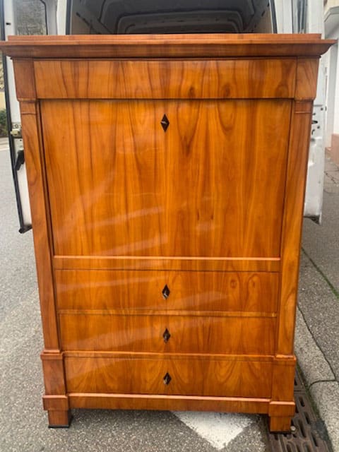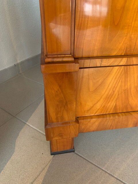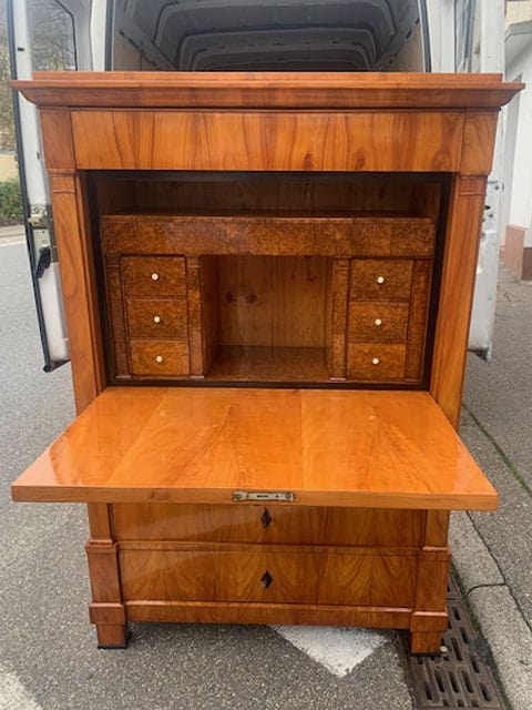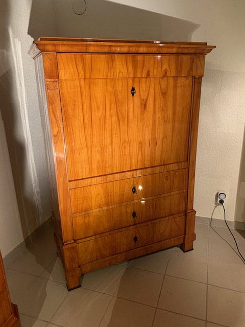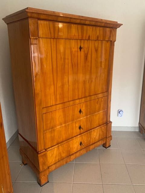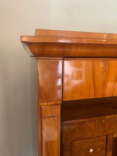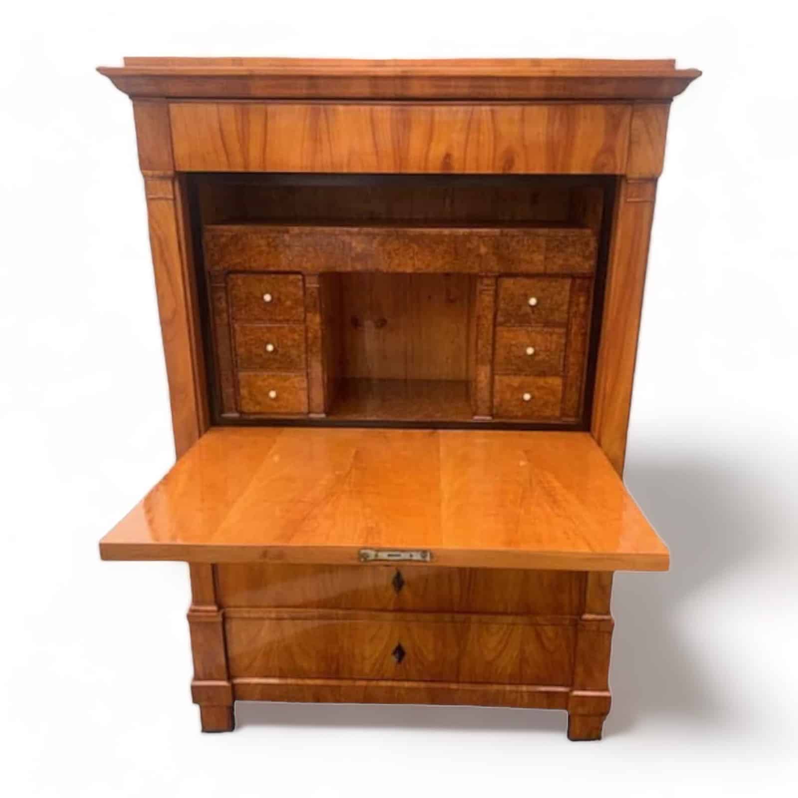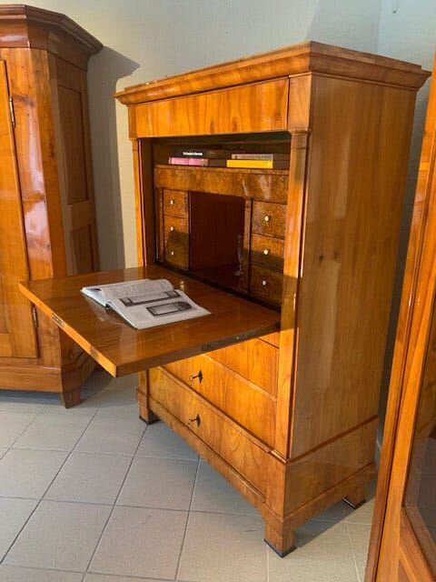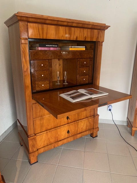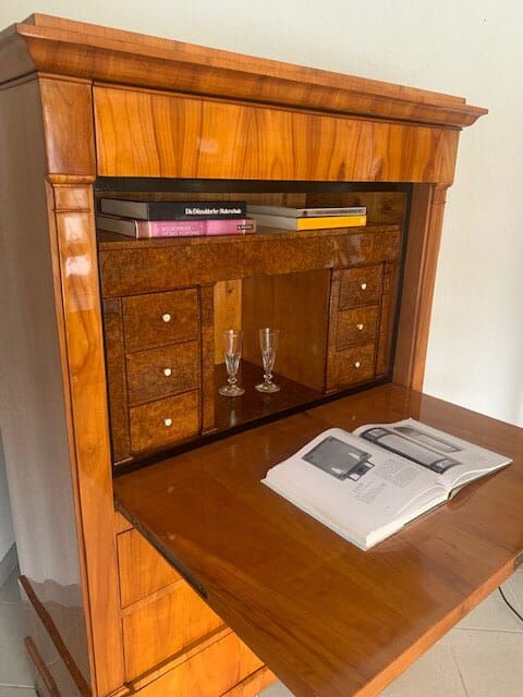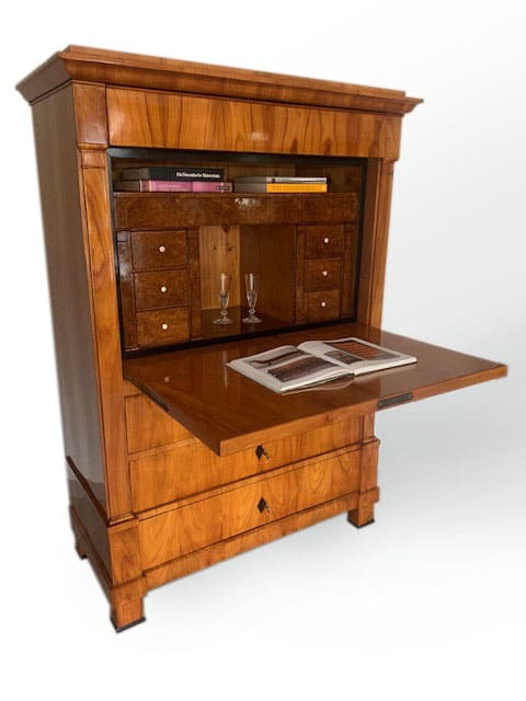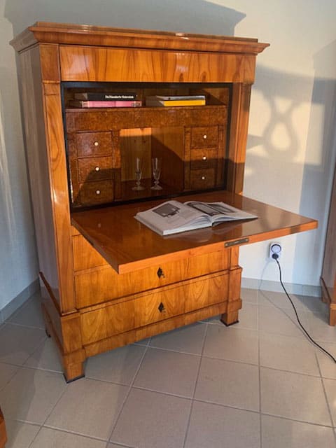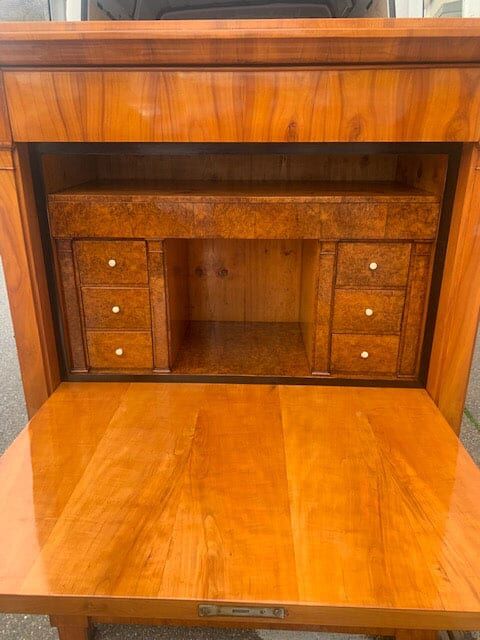 This rare cherry wood secretary desk stands out for its very pretty continuous mirrored cherry veneer picture. The writing flap is flanked by flat pilasters. The interior has a Thuya burl veneer. The secretary desk comes from South Germany and dates back to around 1820.