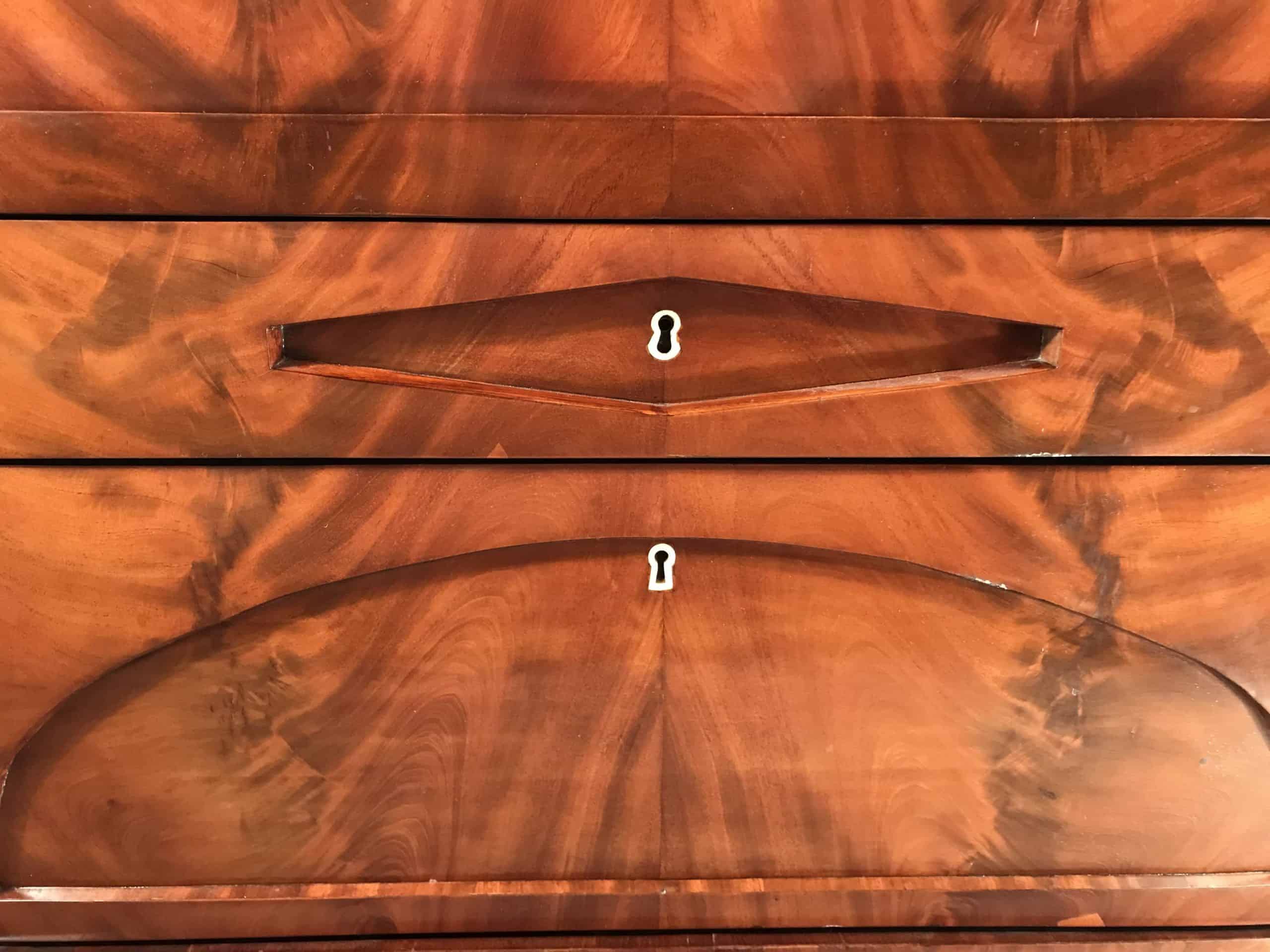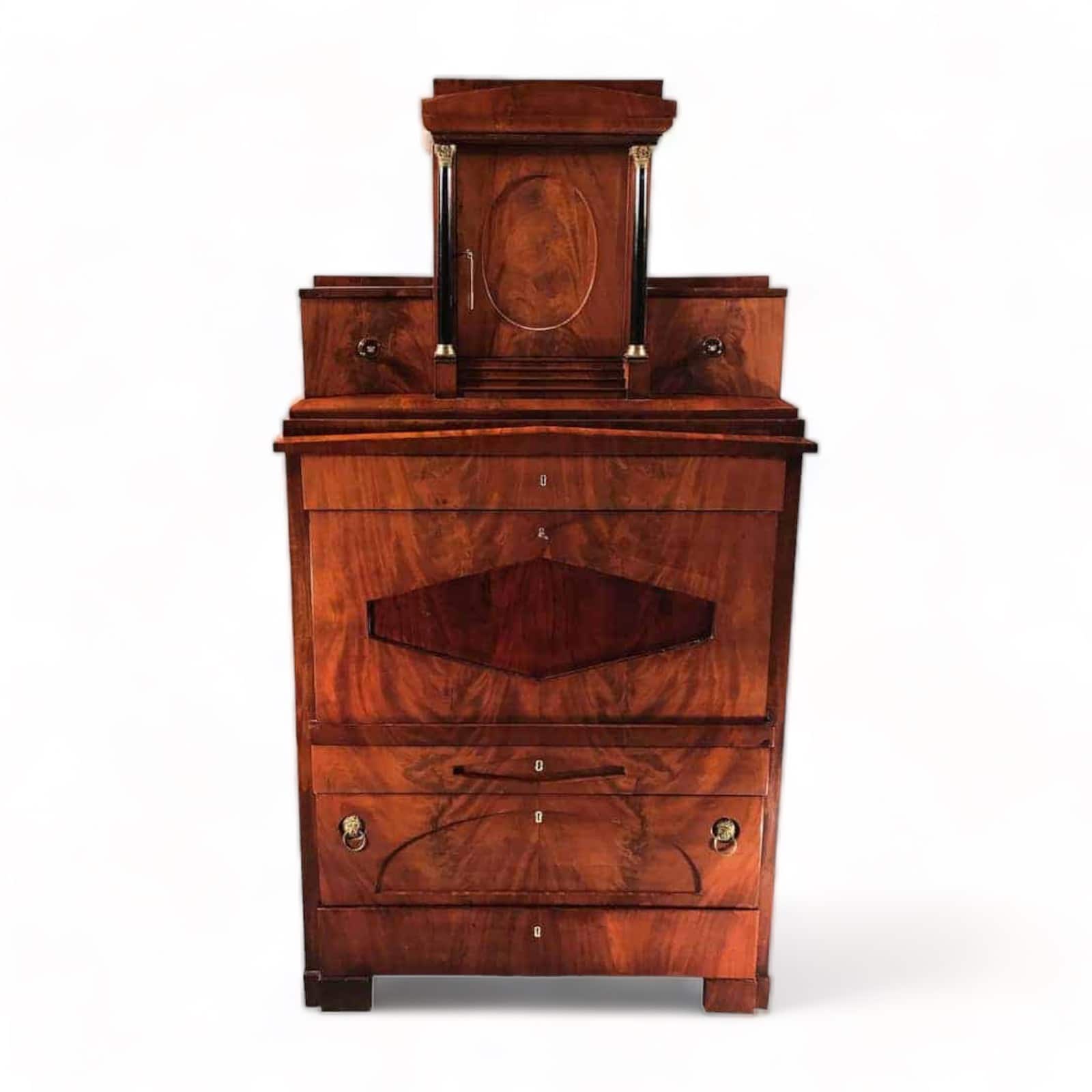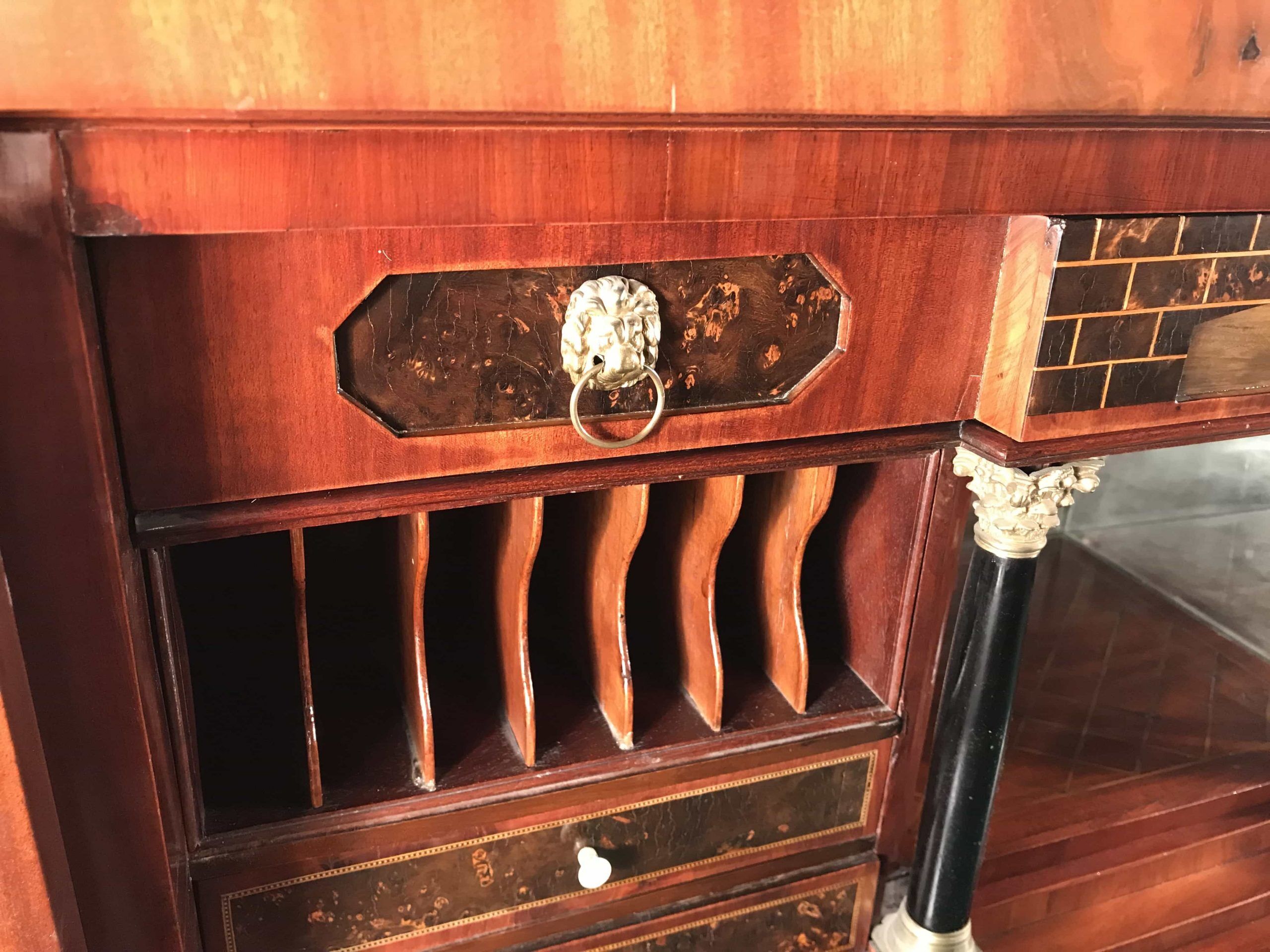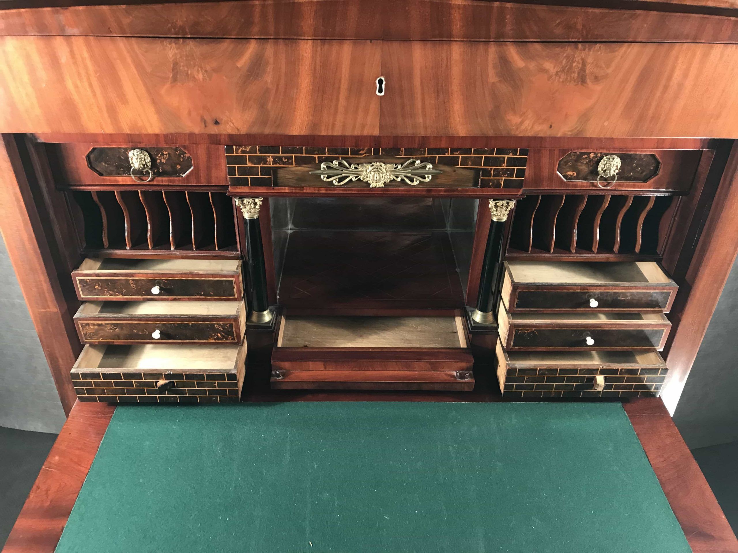 This exceptional Biedermeier drop front secretary desk has an exquisite interior. The maker used mahogany veneer with ebonized details. The interior of the writing desk shows the cabinetmaker’s love for detail. It has one central compartment surrounded by eight small, beautifully designed drawers and two compartments for letters or documents.