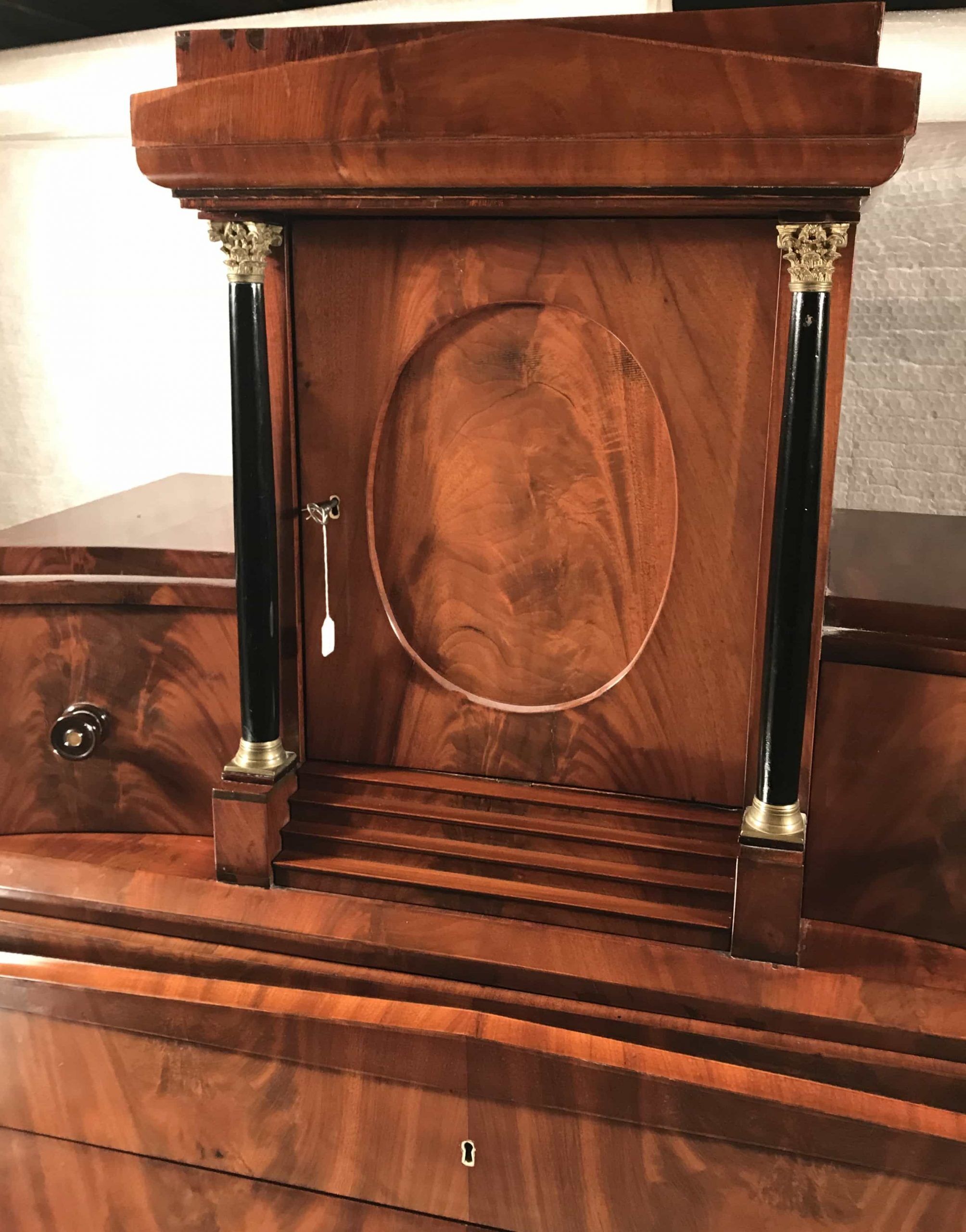 Biedermeier furniture was mostly produced in the austro-hungarian empire and in Germany. Stylistically, Biedermeier furniture softened the rigidity of the Empire style. The cabinet makers used light, native woods and avoided the use of metal ornamentation.