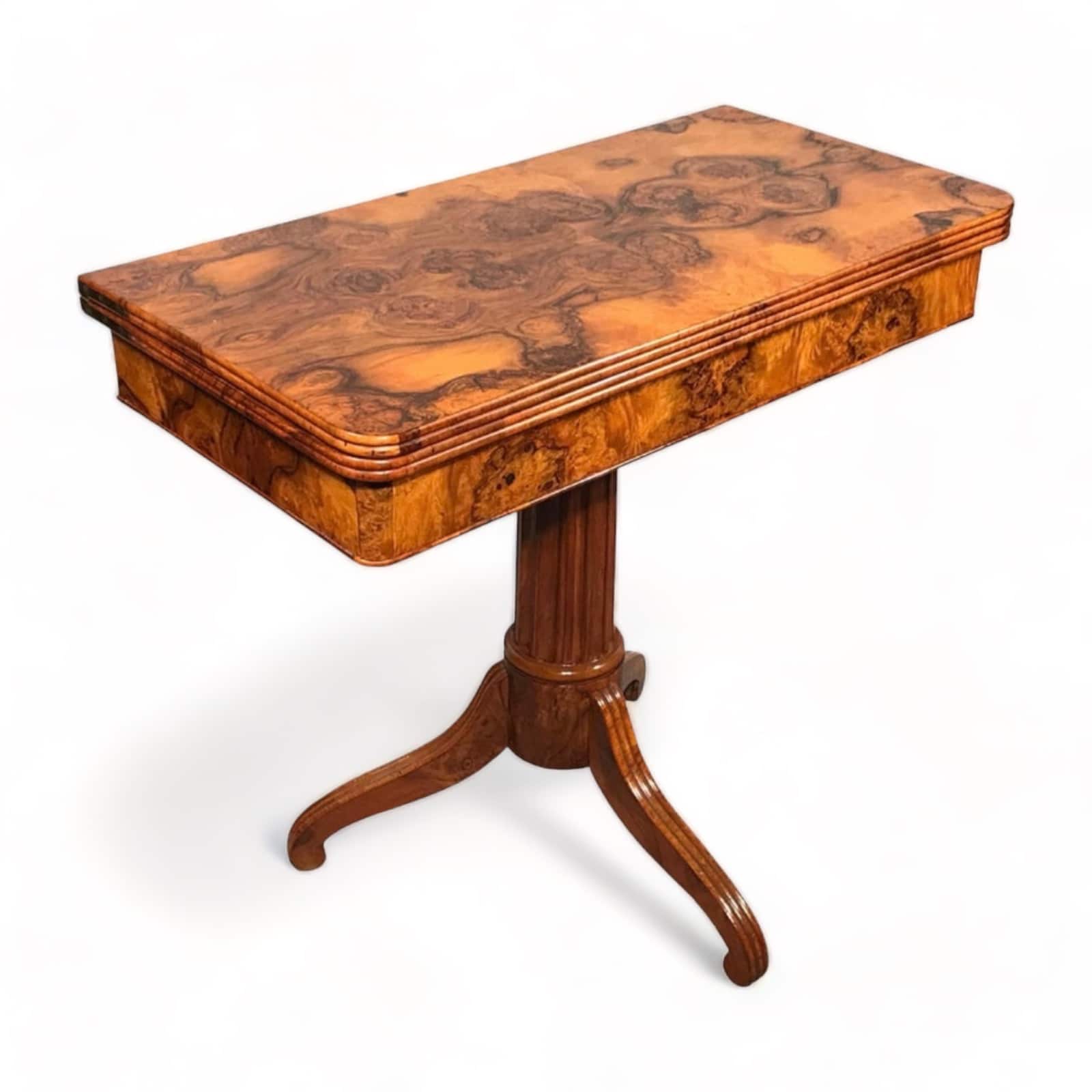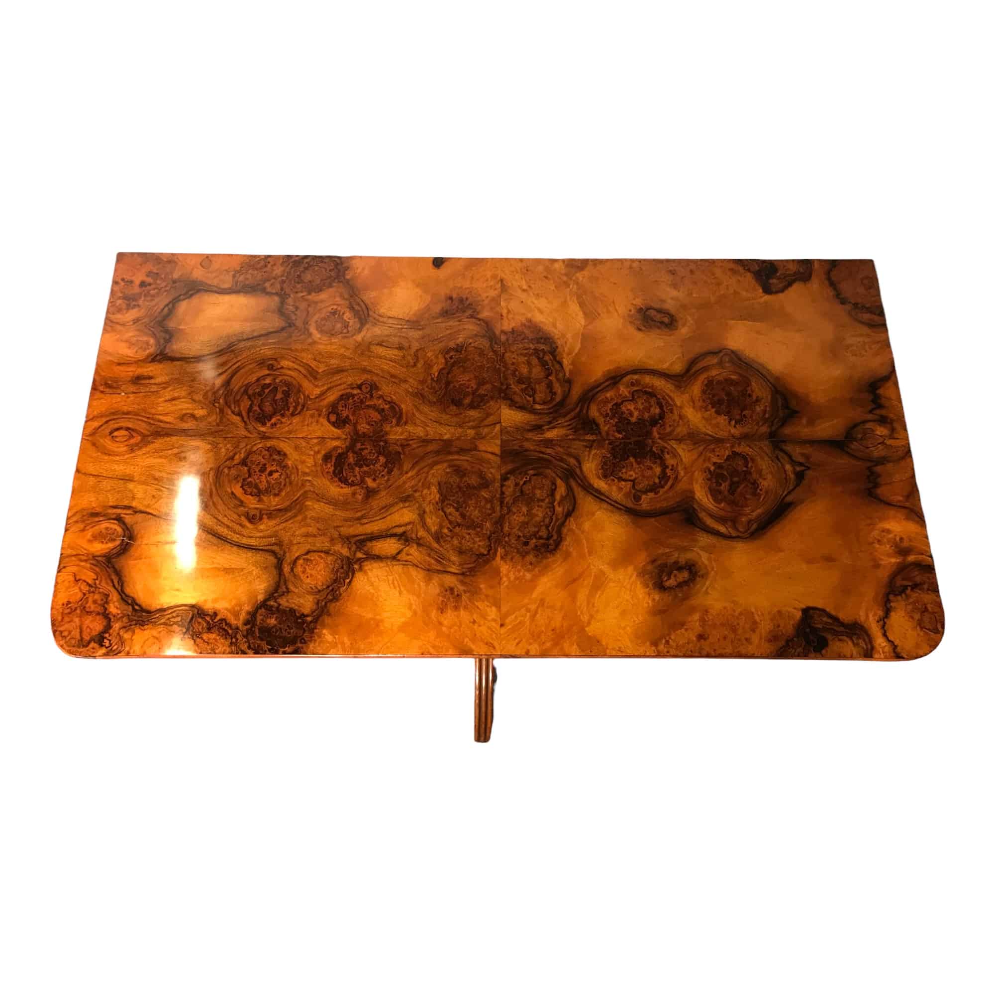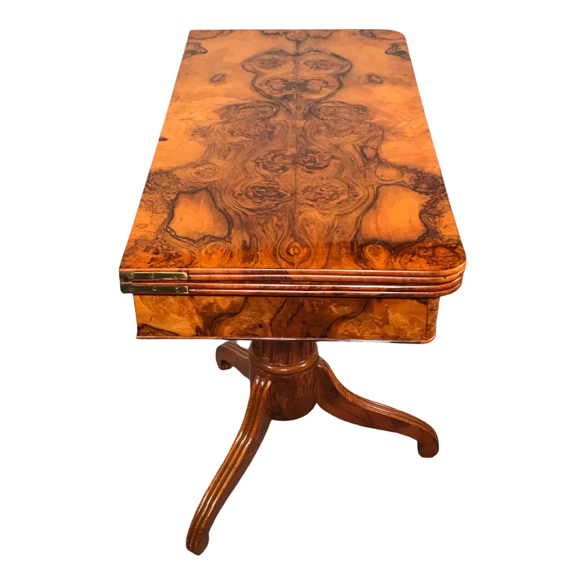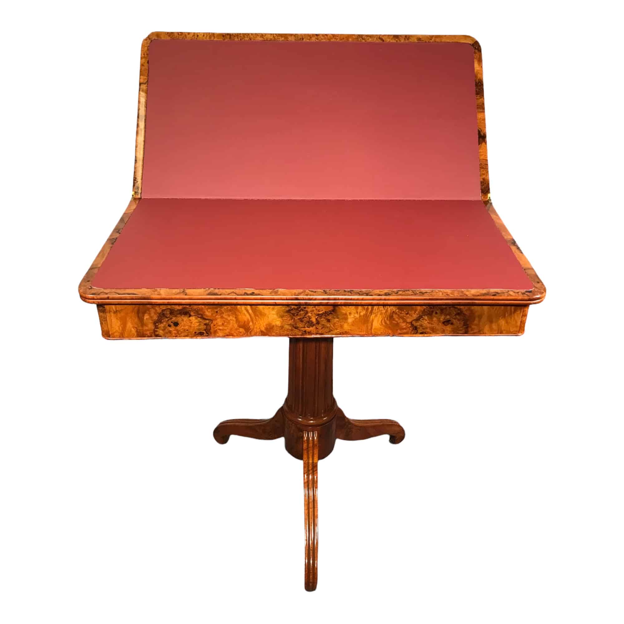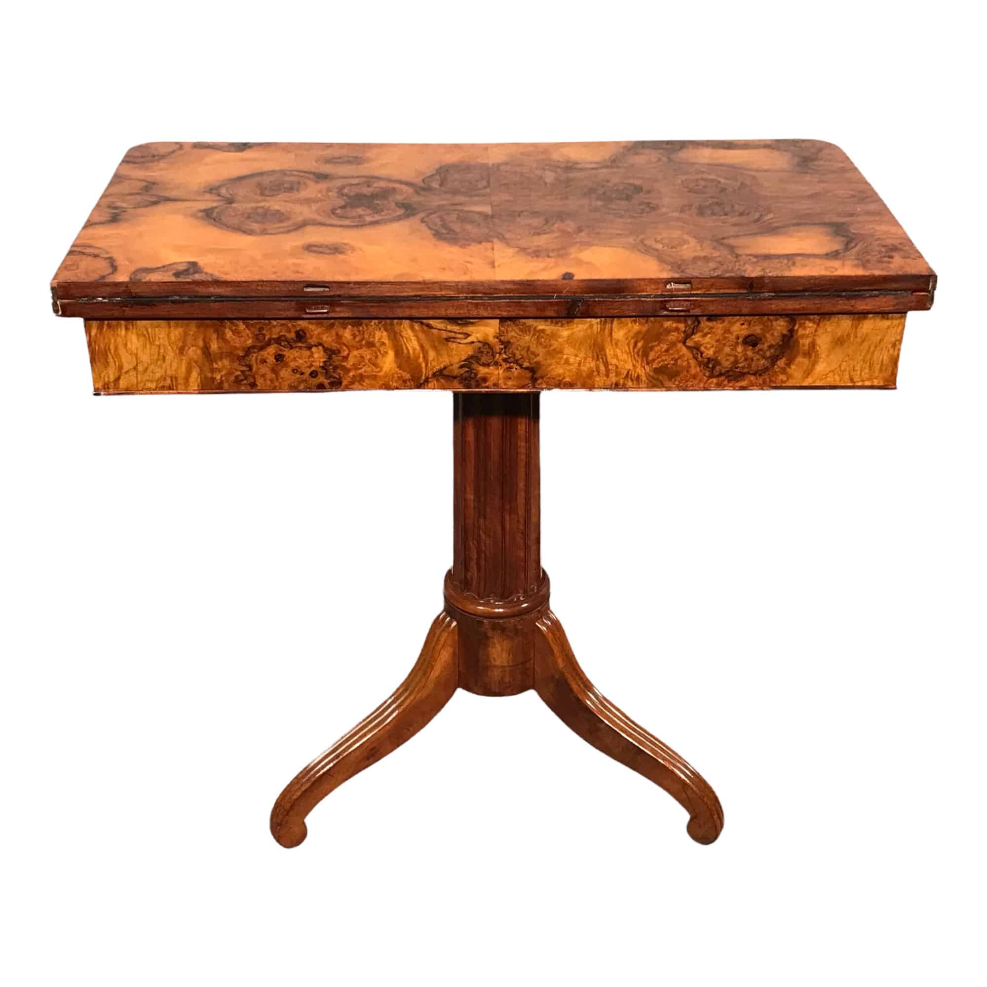 This unique Biedermeier game table dates back to the early phase of the Biedermeier period. It comes from Southern Germany. The game table has a beautiful walnut root veneer on top and apron. It stands on a central fluted column foot with a tripod base. The top flips open and turns to rest on the rectangular base. The open top is covered with leathered (replaced). The table is in very good refinished condition.