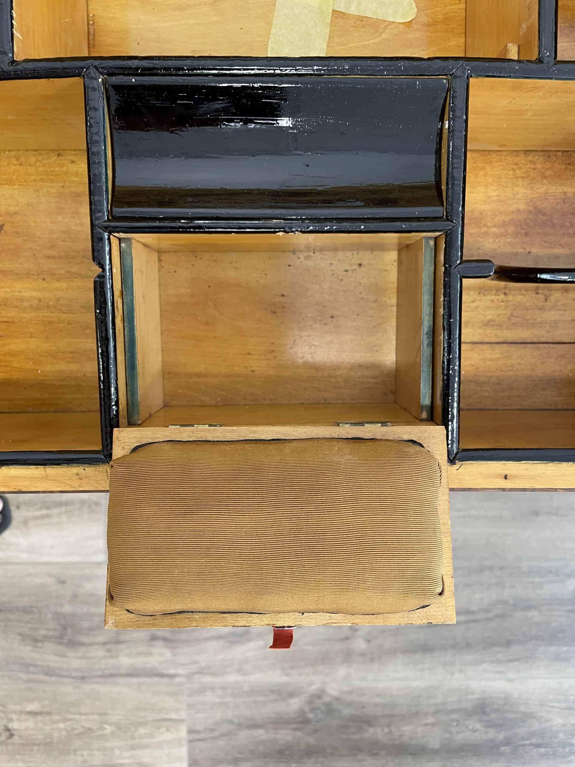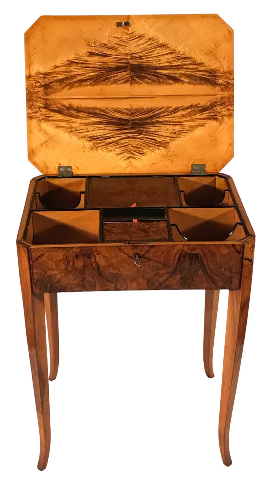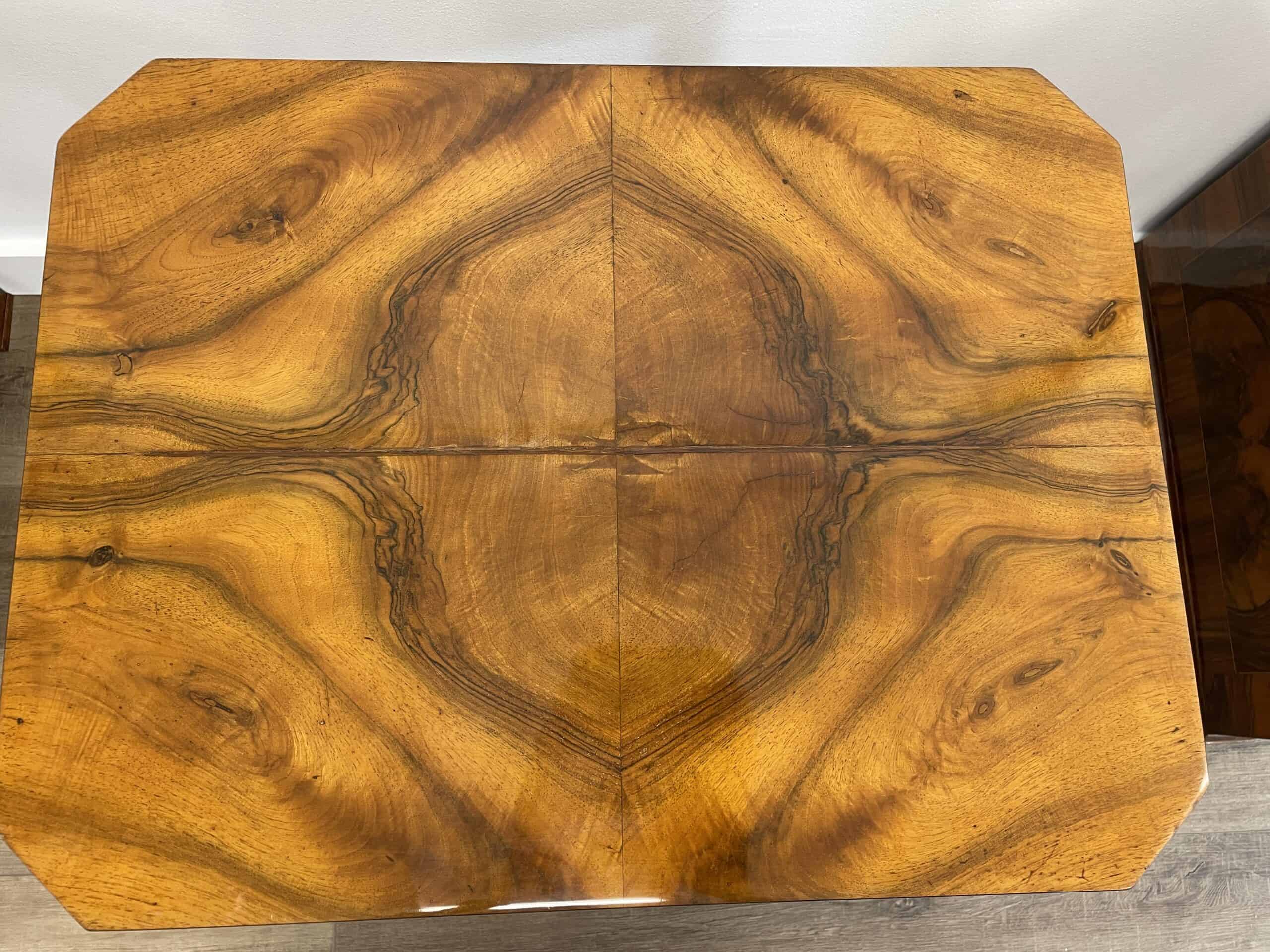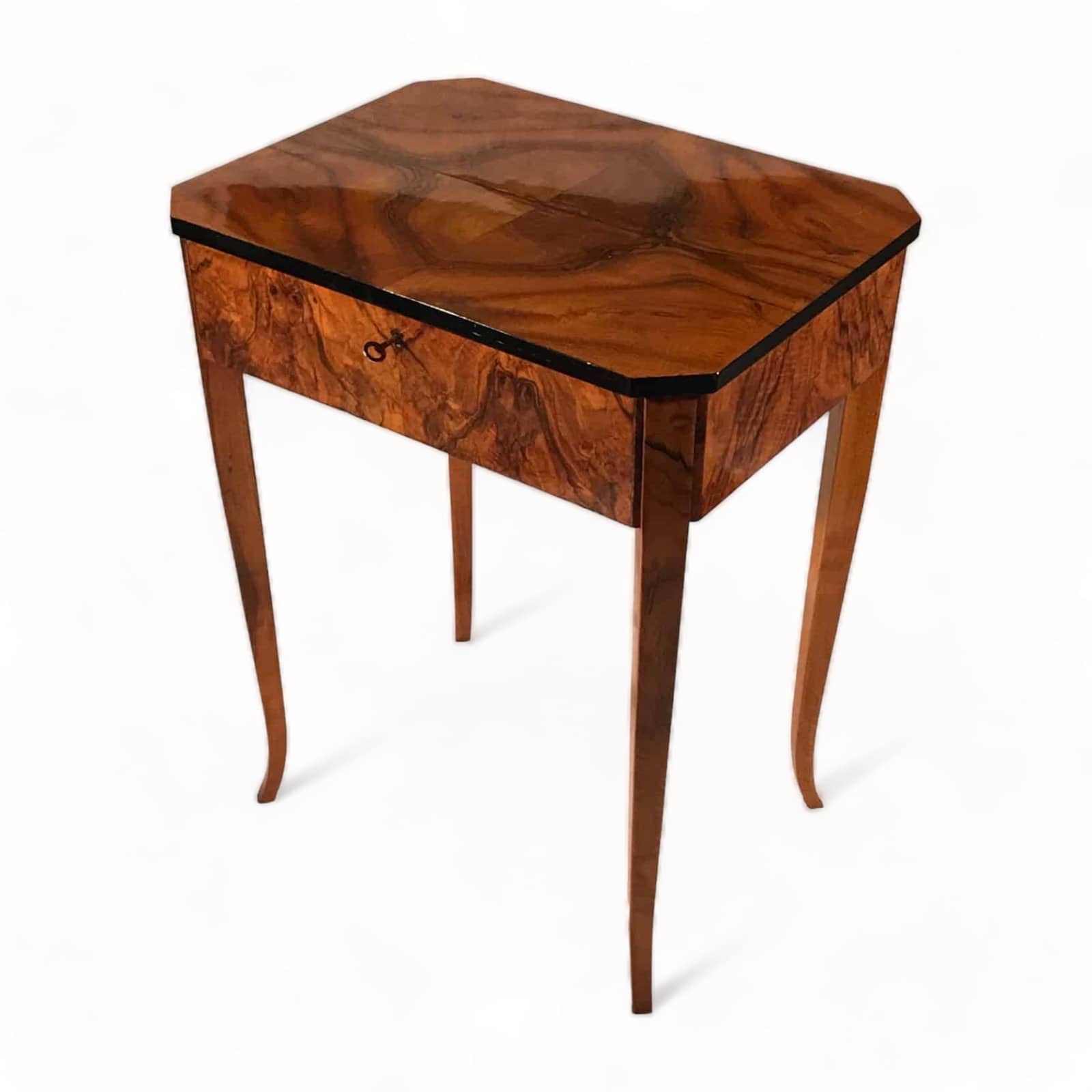 This remarkable Biedermeier sewing side table, believed to be from around 1820 in Germany, showcases the exquisite craftsmanship of Southern Germany. Skilled artisans carefully crafted this piece, using an enchanting walnut veneer to enhance its visual appeal. The table features a convenient flip-up top, multiple storage compartments, an integrated mirror for added functionality, and a pin cushion for your convenience. Additionally, this exceptional piece has been professionally refinished to restore its original splendor. The finishing touch is a meticulous shellac hand polish, also known as French polish, which highlights the table’s inherent natural beauty. Add a touch of timeless design and superior artistry to your space with this unique table.