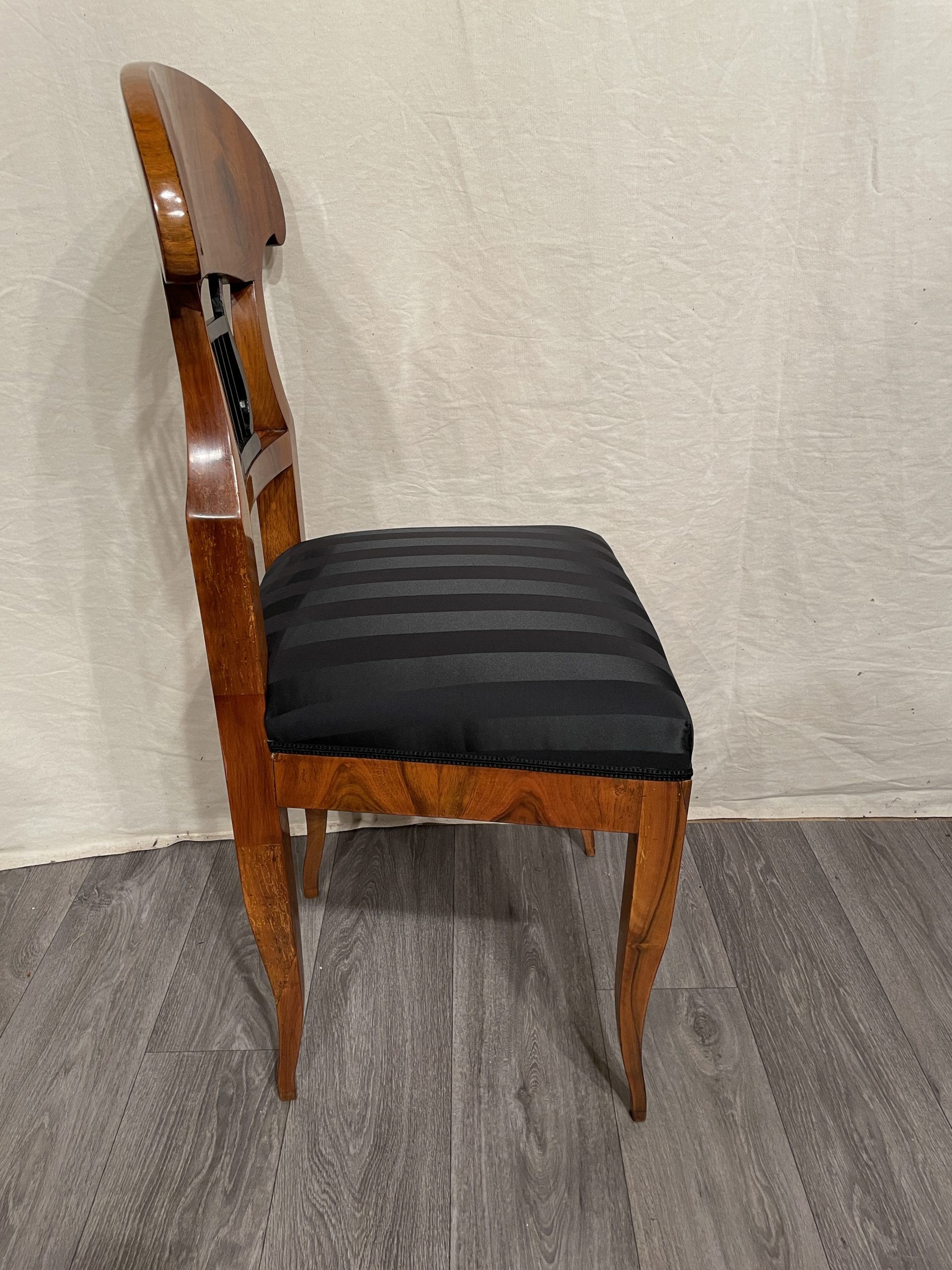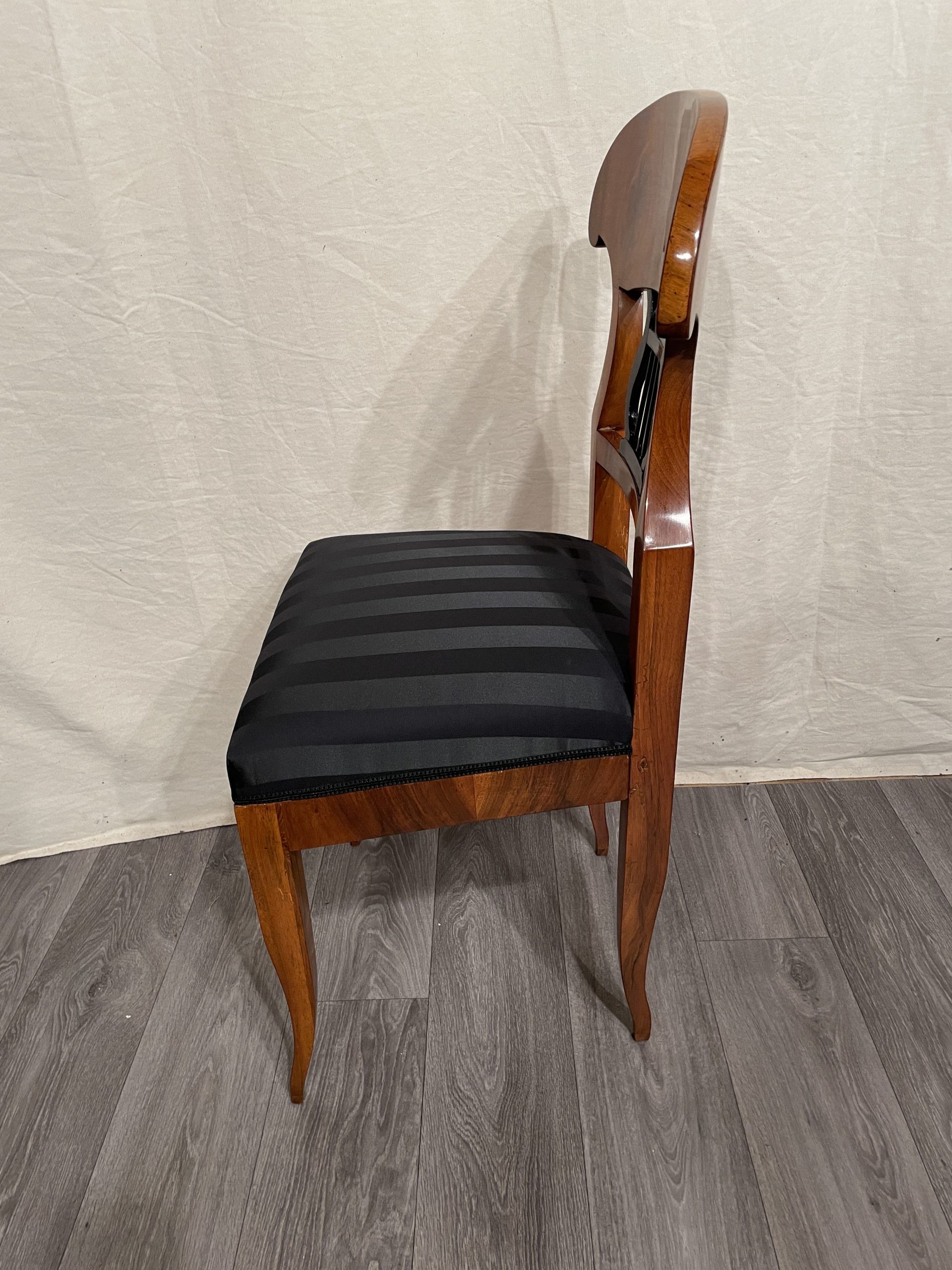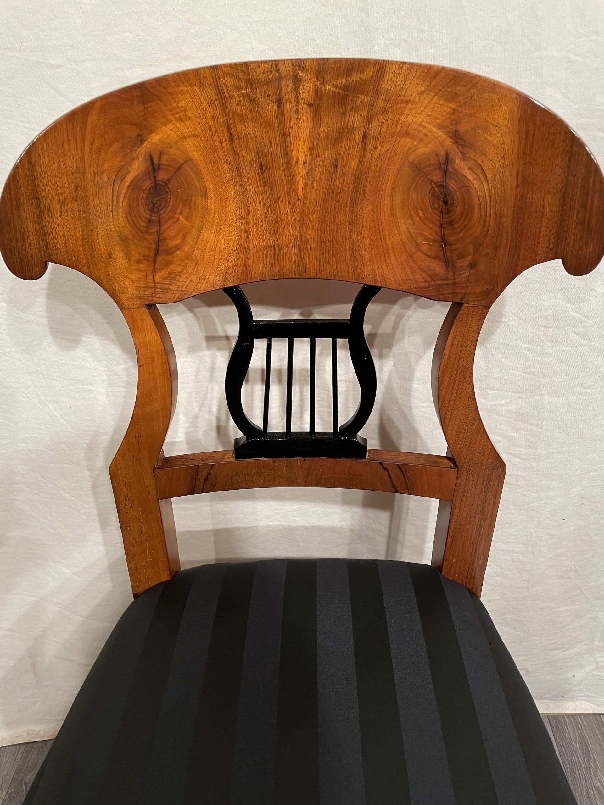 This beautiful Biedermeier chair is decorated with a pretty walnut veneer. The open work back is embellished with an ebonized lyre motif.