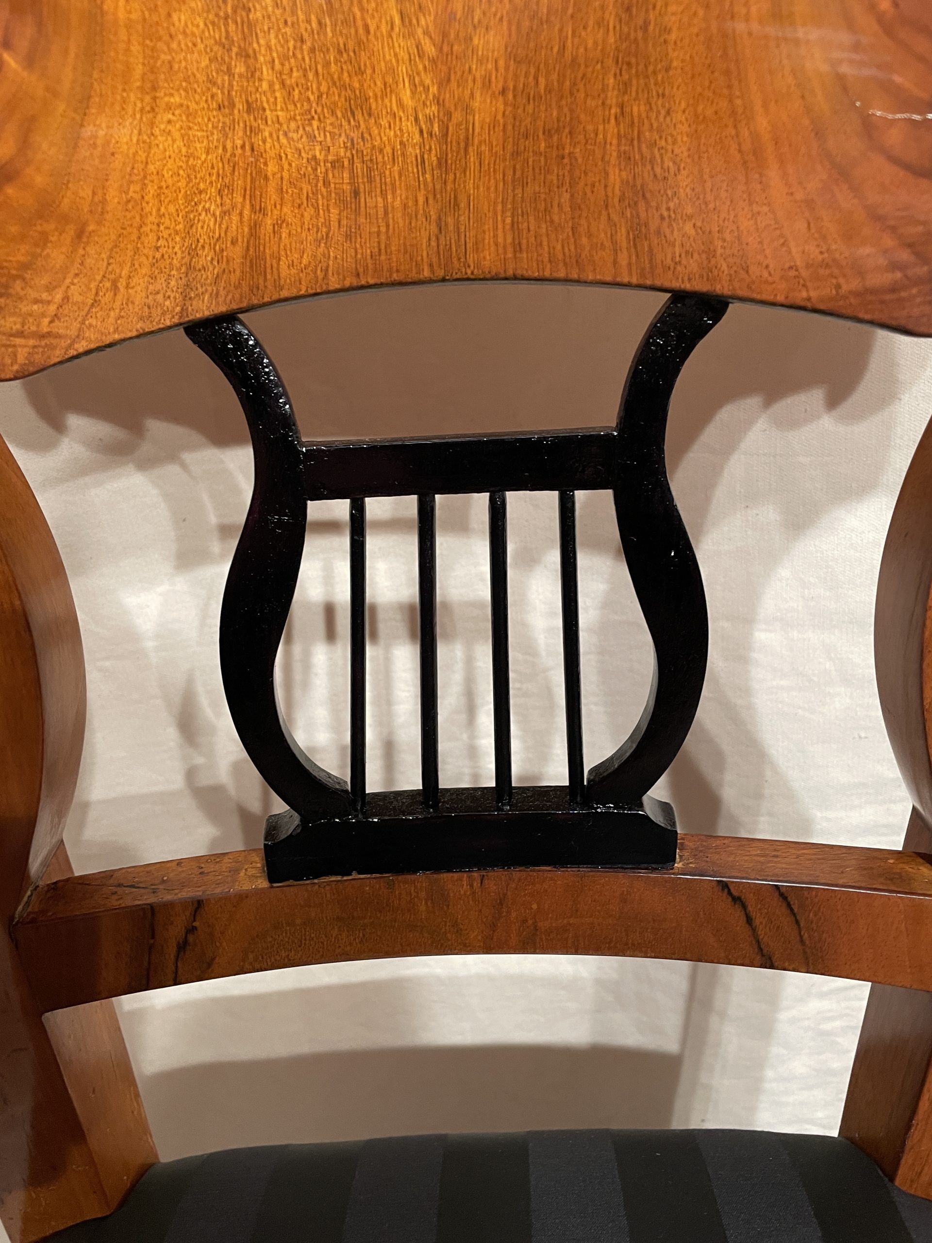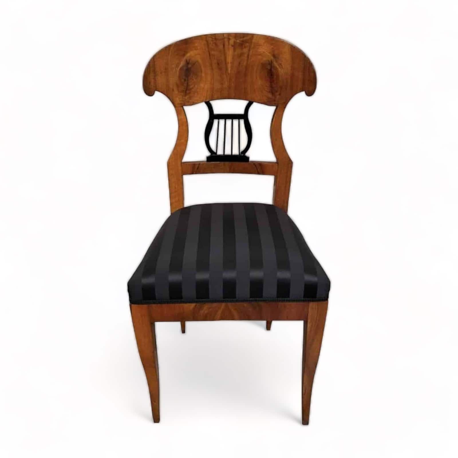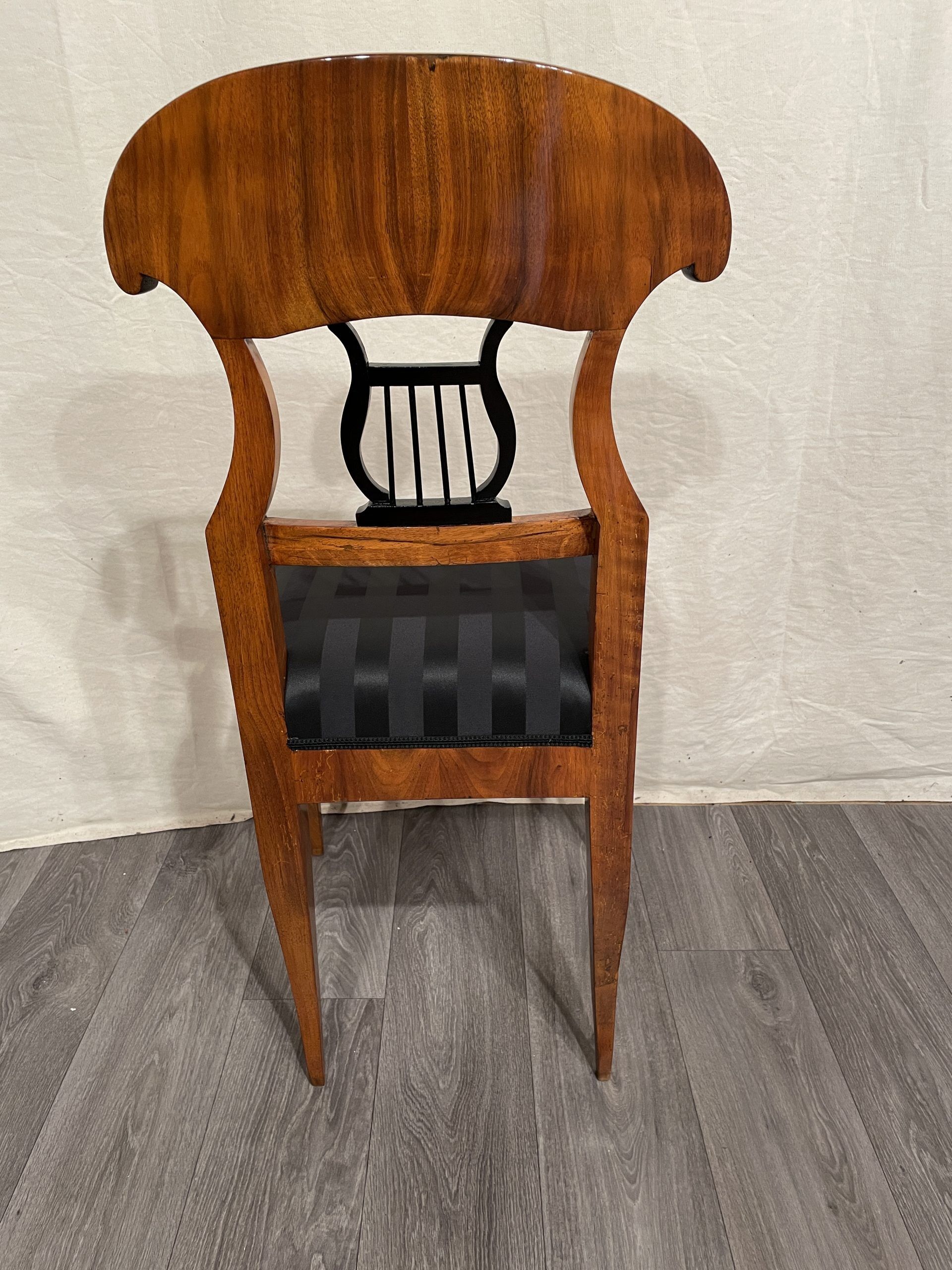 This beautiful Biedermeier chair is decorated with a pretty walnut veneer. The open work back is embellished with an ebonized lyre motif.