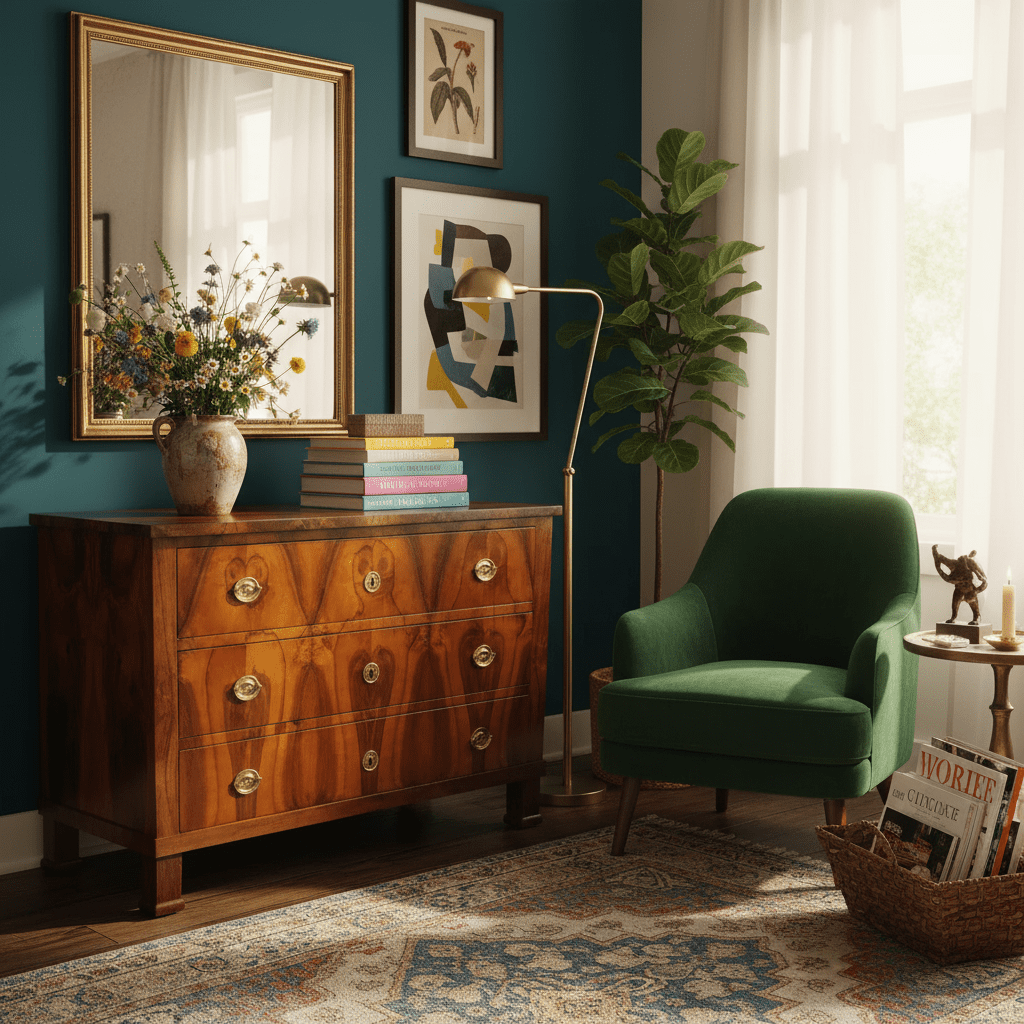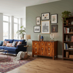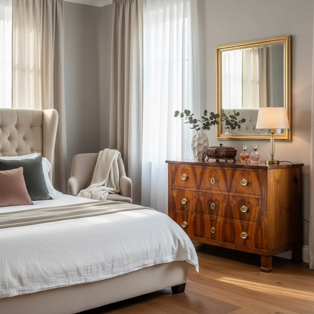 The three spacious drawers, the top and the sides feature a striking mirrored walnut veneer, highlighting the wood’s warm tones and intricate patterns. Recently professionally refinished with a French polish, the chest reveals an exquisite depth of color and sheen that enhances its timeless appeal.