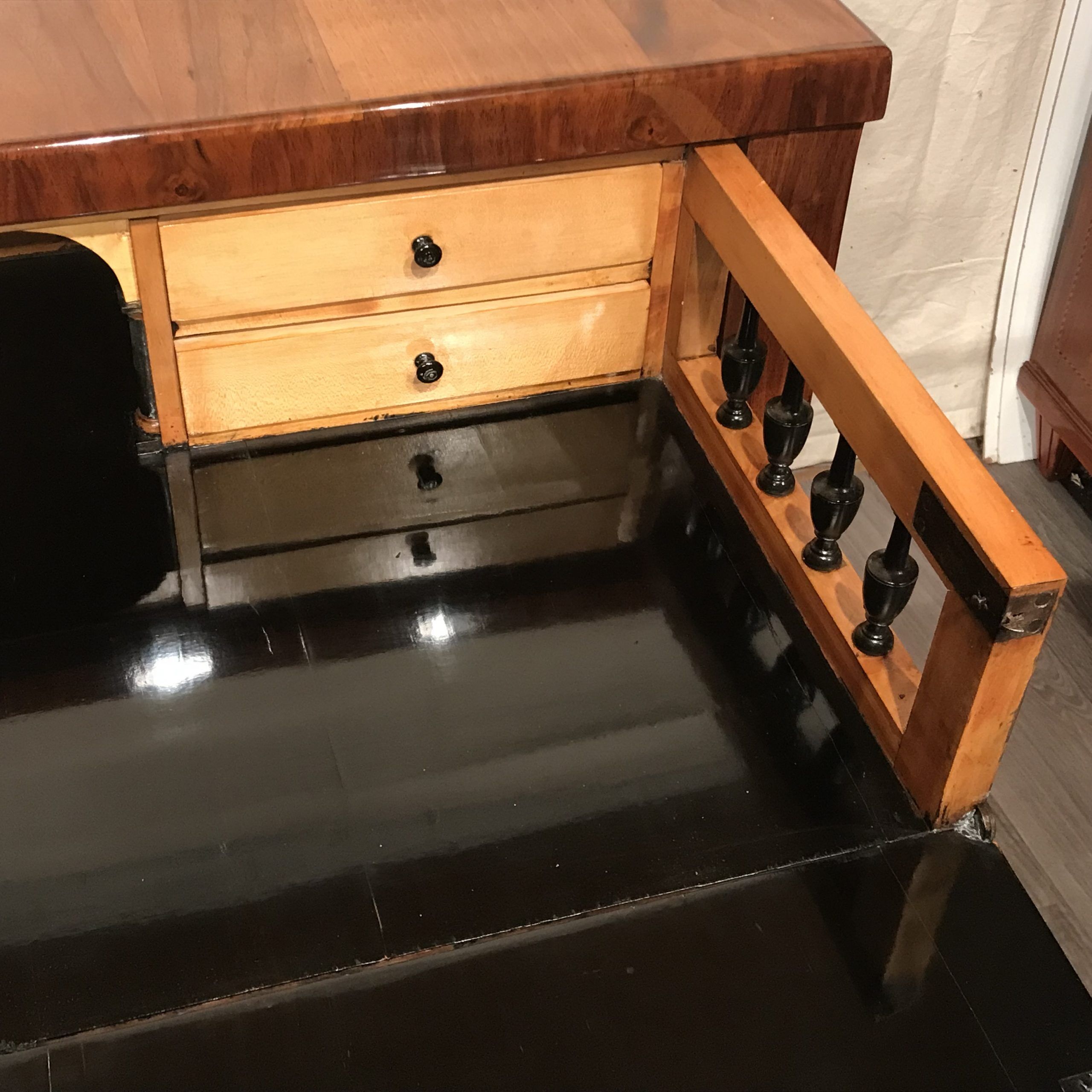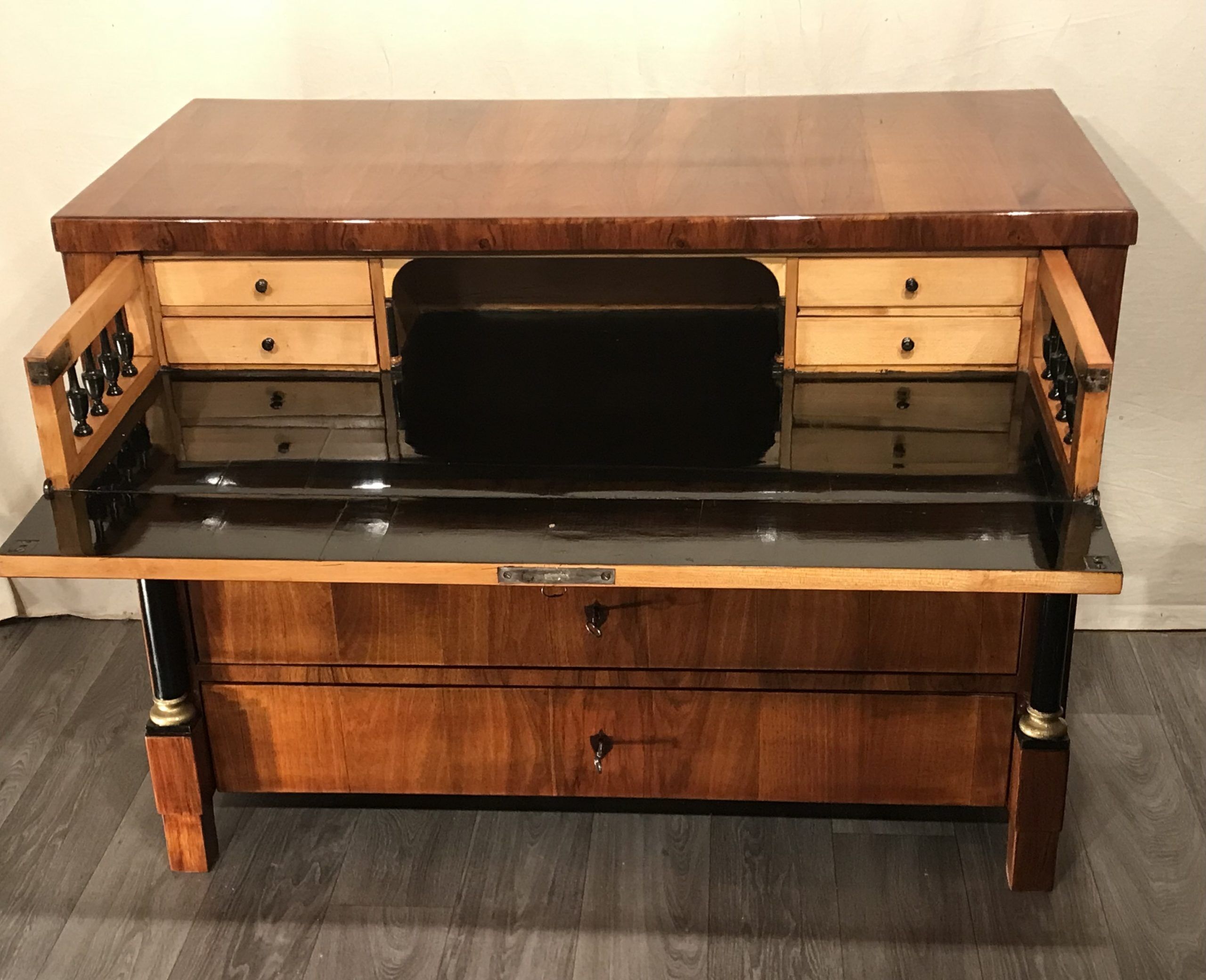 This elegant original Biedermeier walnut chest of drawers dates back to around 1820. It was made in southern Germany. The four drawer baker chest has a beautiful walnut veneer. A writing compartment is hiding behind the slightly protruding upper drawer. Once you pull it out you can flip down the front. Four small drawers and a central open compartment decorate the inside of this drawer. The writing surface is ebonized and the light beech veneer of the drawers create a pretty contrast to the darker walnut of the dresser and the black of the writing surface.