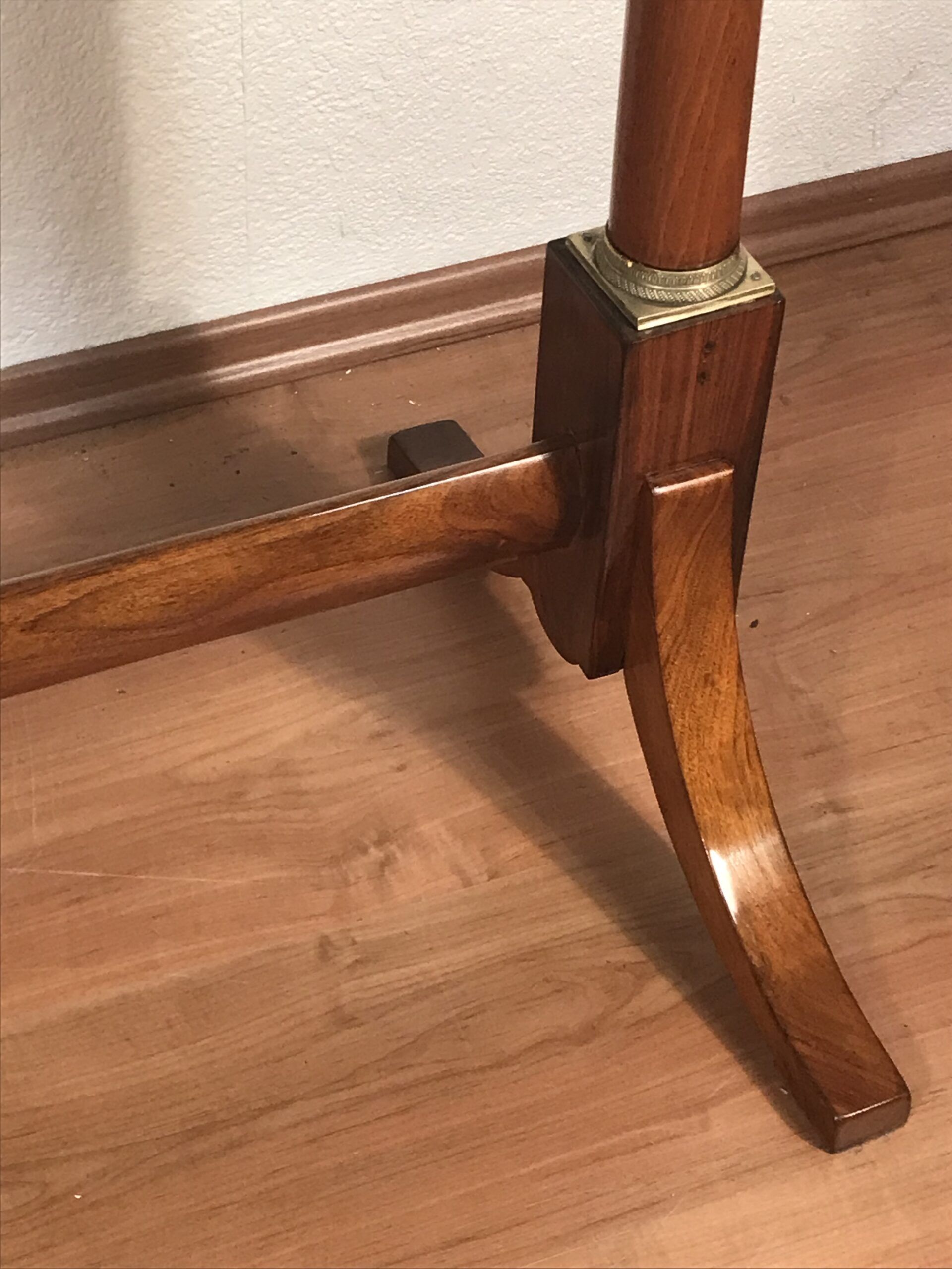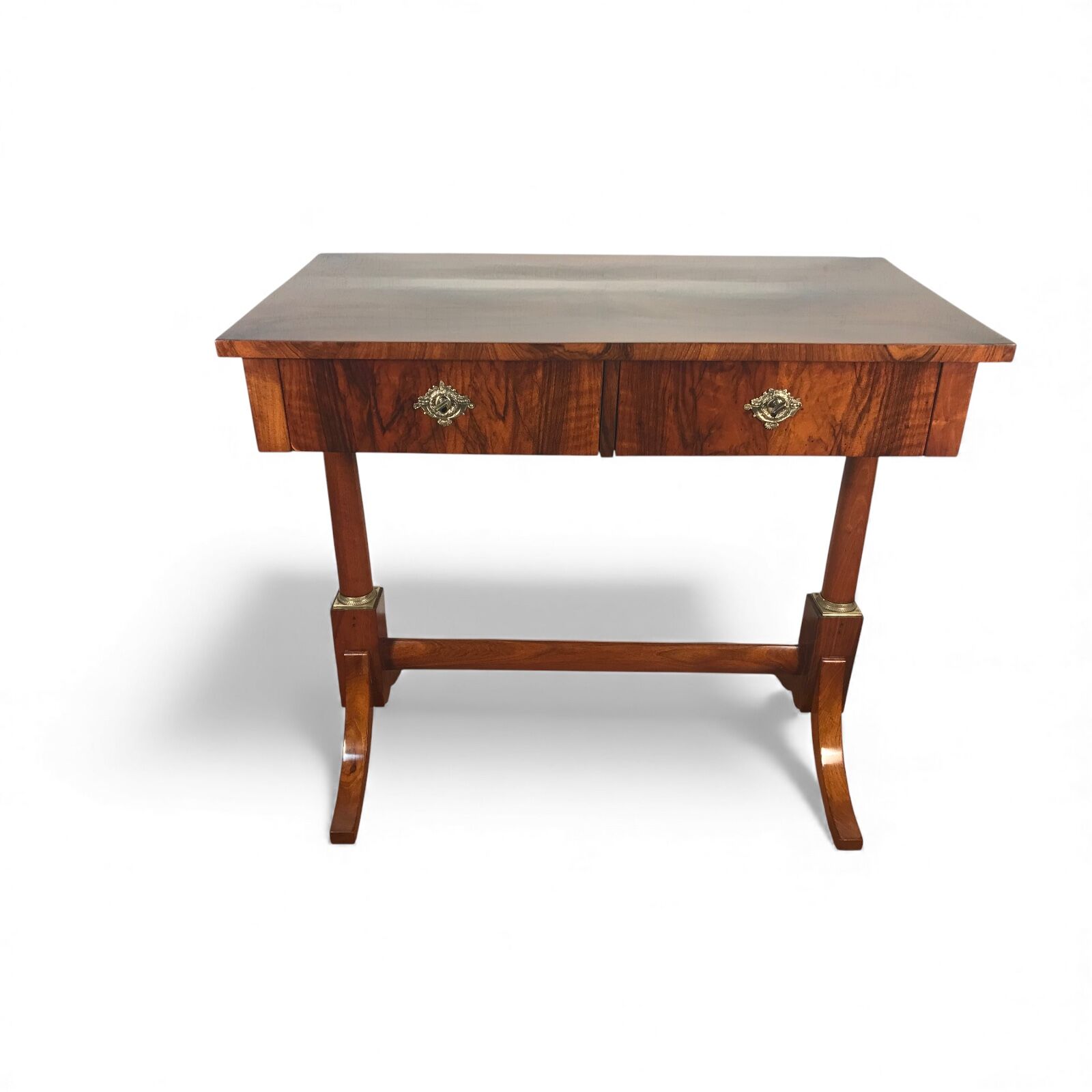 This elegant Biedermeier desk features a rectangular top and two practical drawers, supported by twin column legs connected with a central stretcher. The piece rests on a shaped base with curved feet, a hallmark of early 19th-century German design.