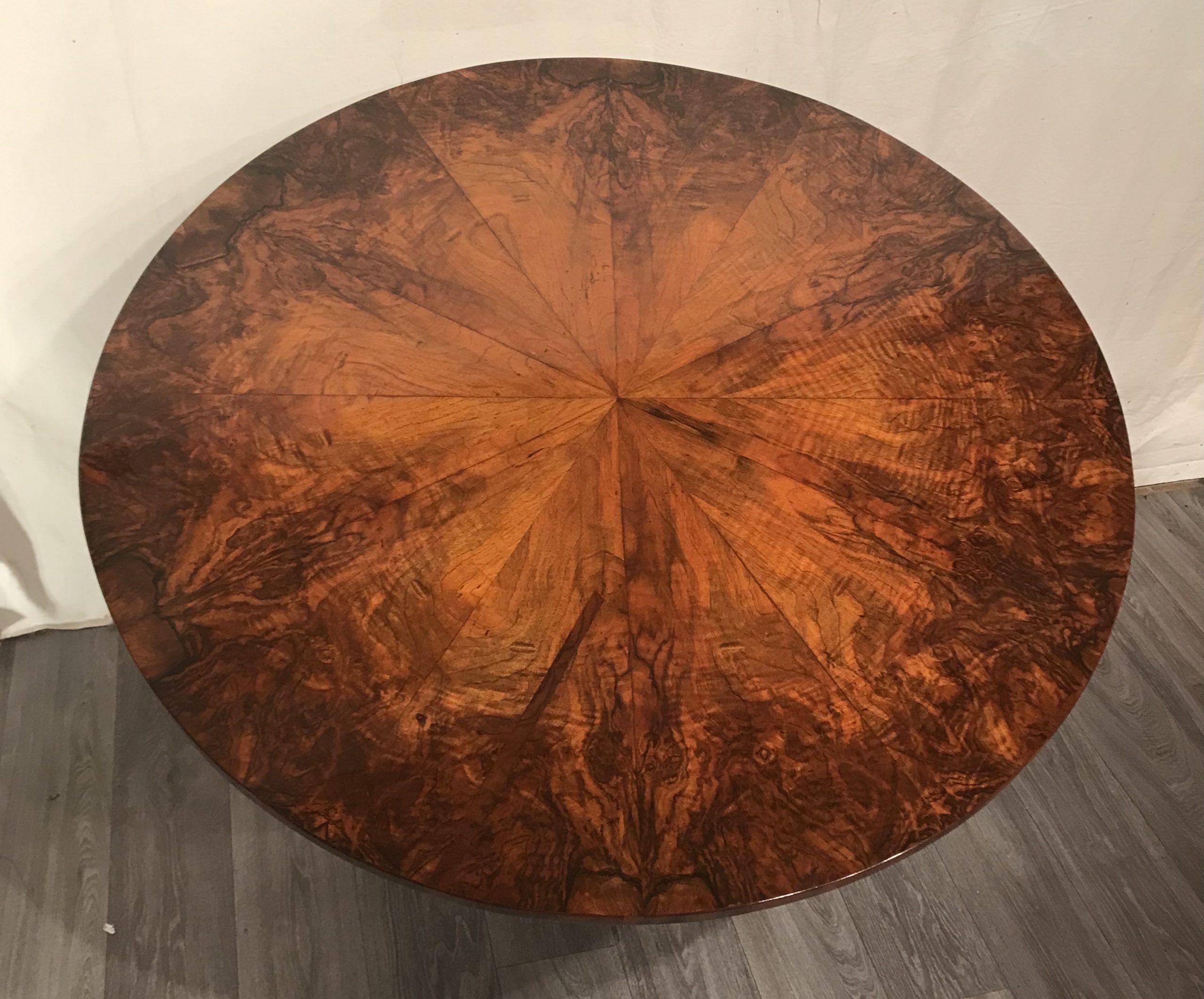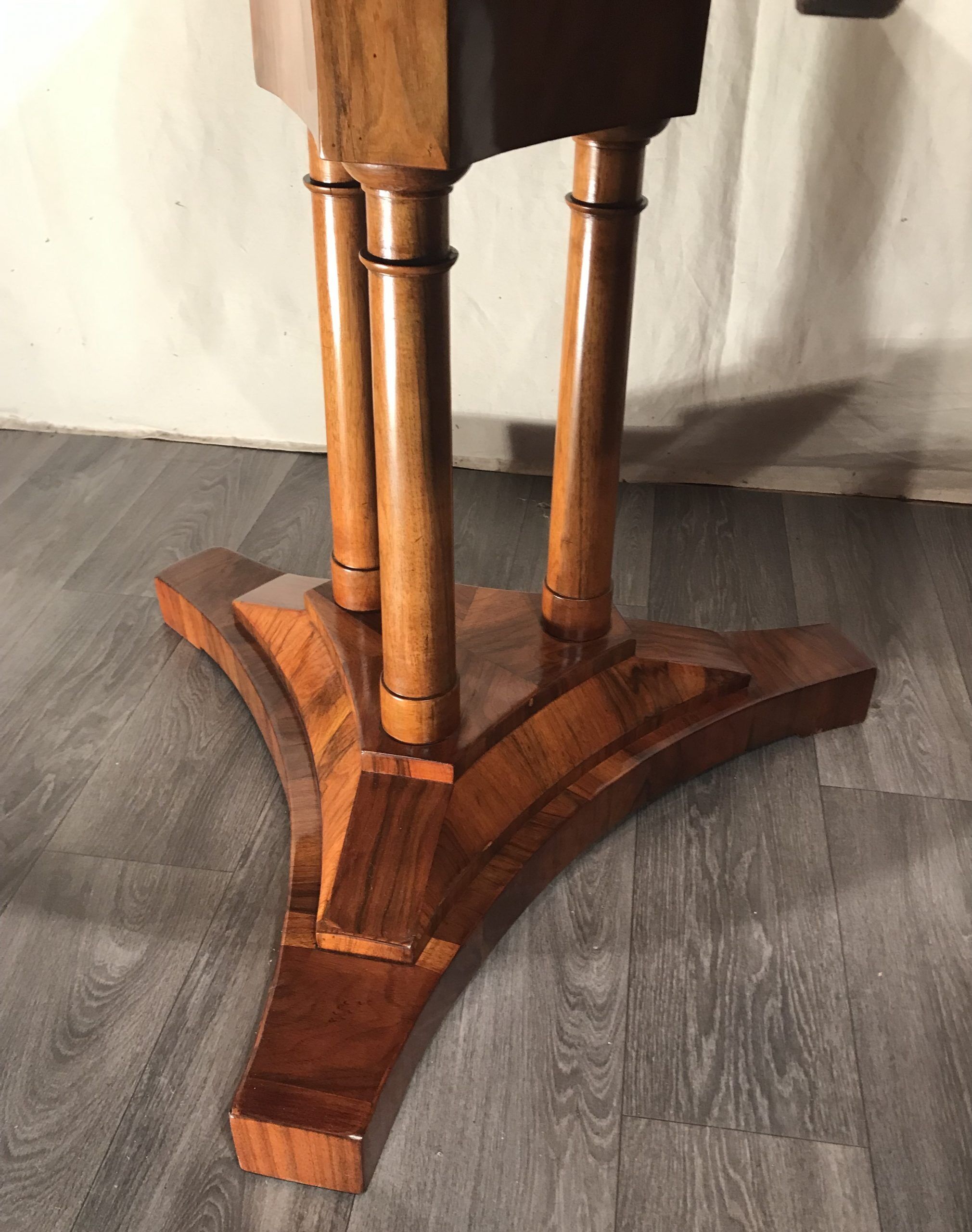 This is the ideal table for an elegant dining room setting. Combine it with original Biedermeier chairs or choose a completely different style of modern or vintage chairs. The sleek design of this table is easy to combine. You could also imagine it standing in a spacious entry hall decorated with a glass vase and a flower bouquet. The beautiful base and the gorgeous veneer pattern will definitely attract attention.