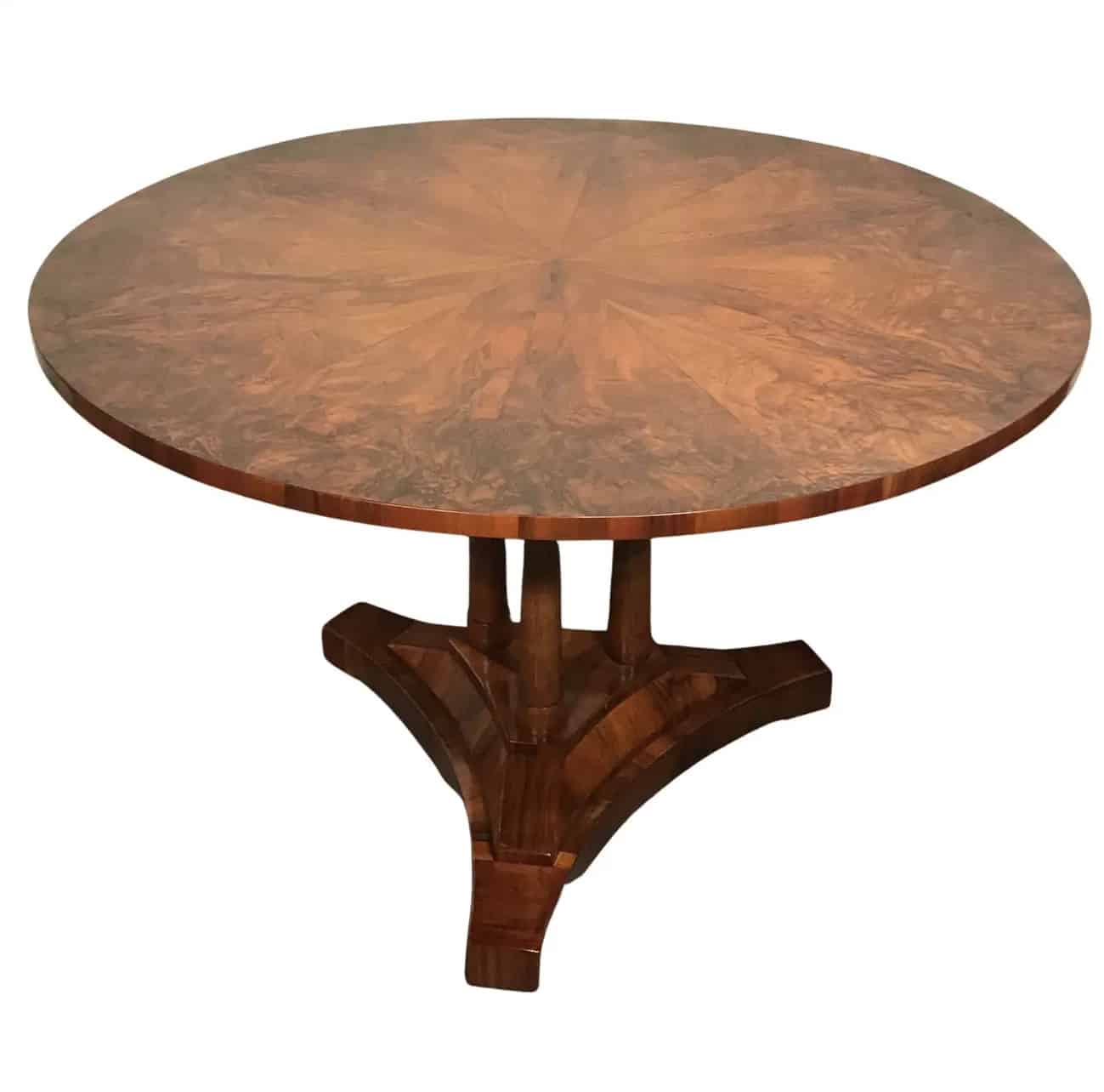 This unique original Biedermeier walnut dining table dates back to around 1820. It comes from southern Germany. The walnut tables base features three slender elegant columns which stand on a trefoil base. The round table top has a gorgeous piecrust walnut veneer.