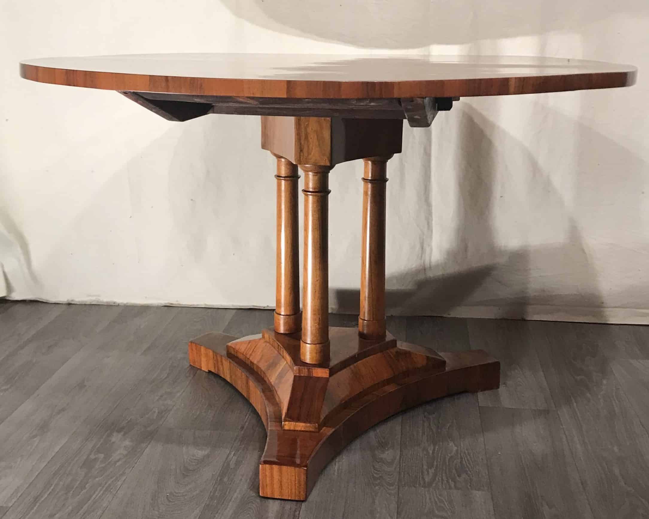 The Biedermeier table is in excellent refinished condition with a beautiful hand polished shellack finish. It measures Height: 29.93 in. (76 cm), Diameter: 45.28 in. (115 cm).