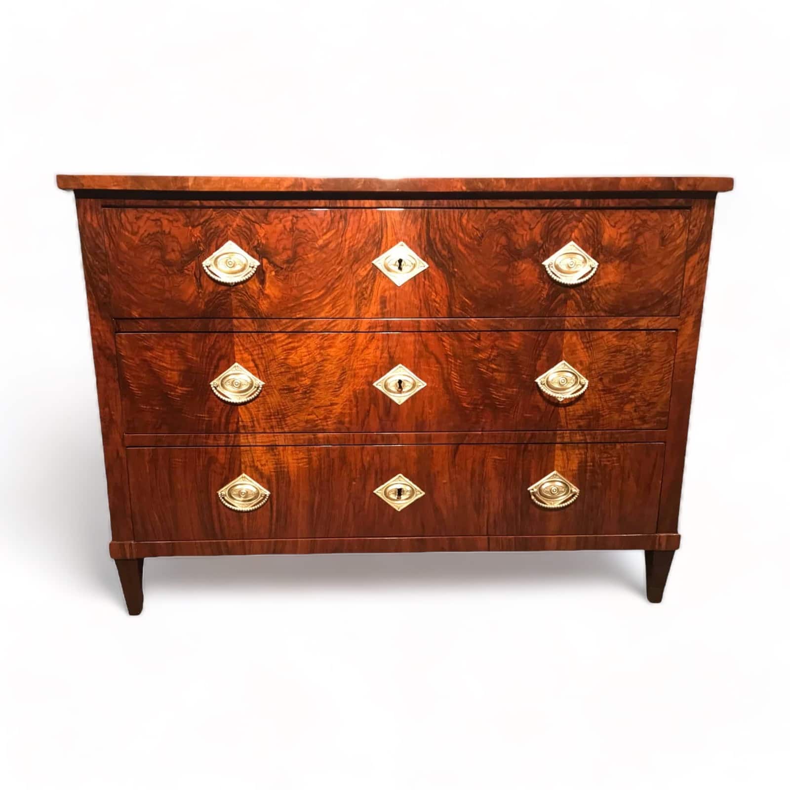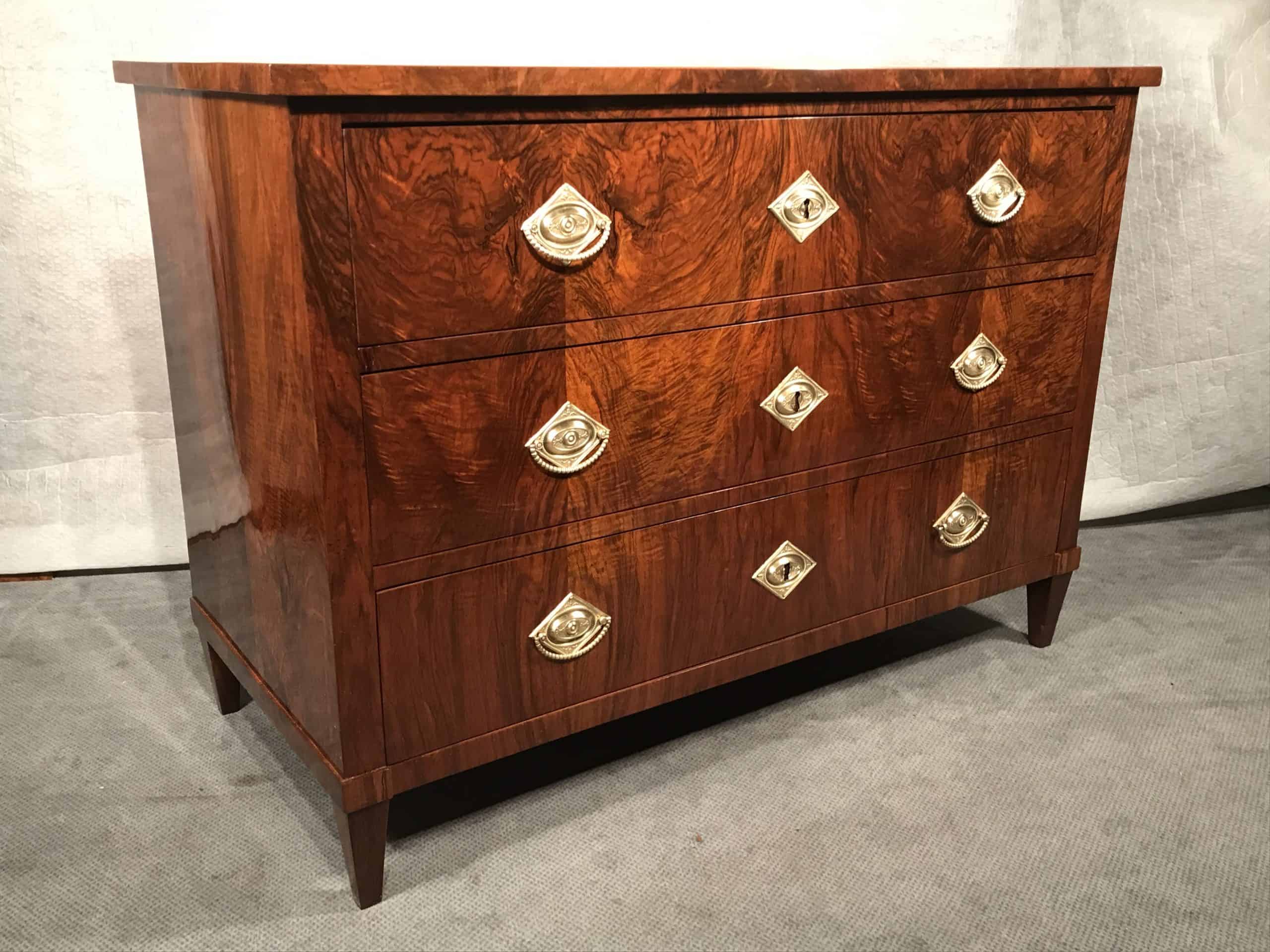 This original 1820’s antique Biedermeier walnut dresser comes from Southern Germany. The three drawer dresser stands out for its sleek design and the beautiful walnut veneer. It stands on four pointed feet. This piece works well in a modern or traditional interior.