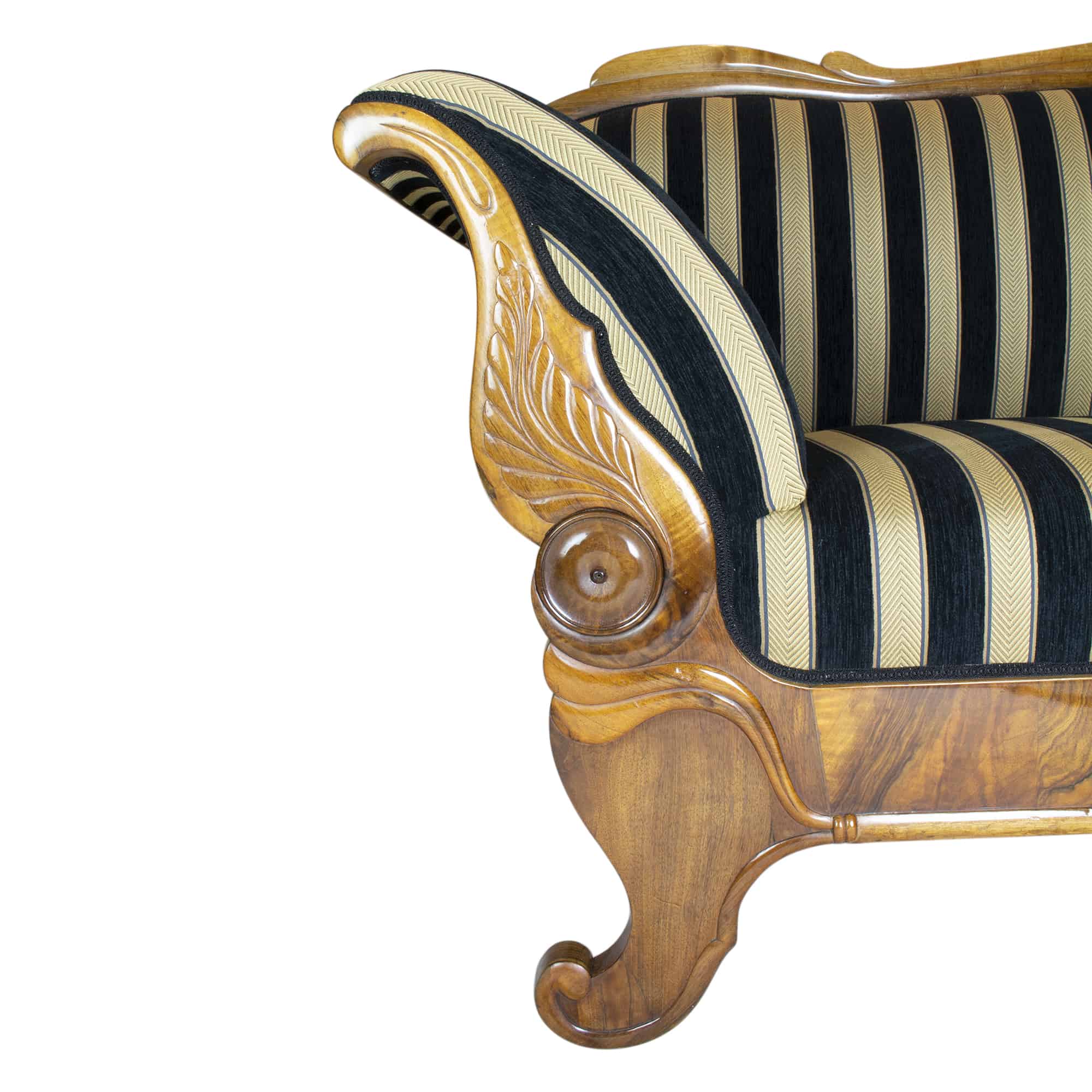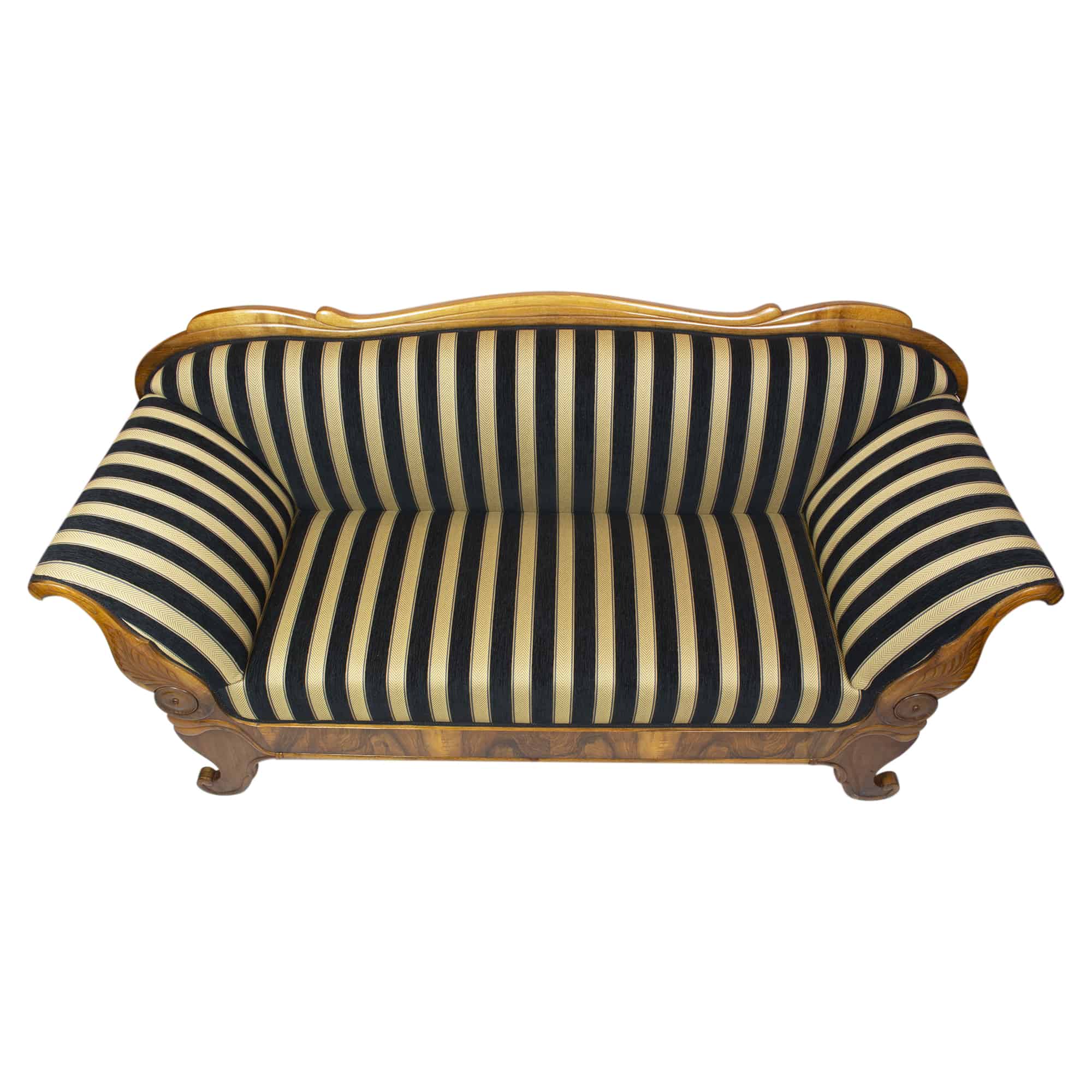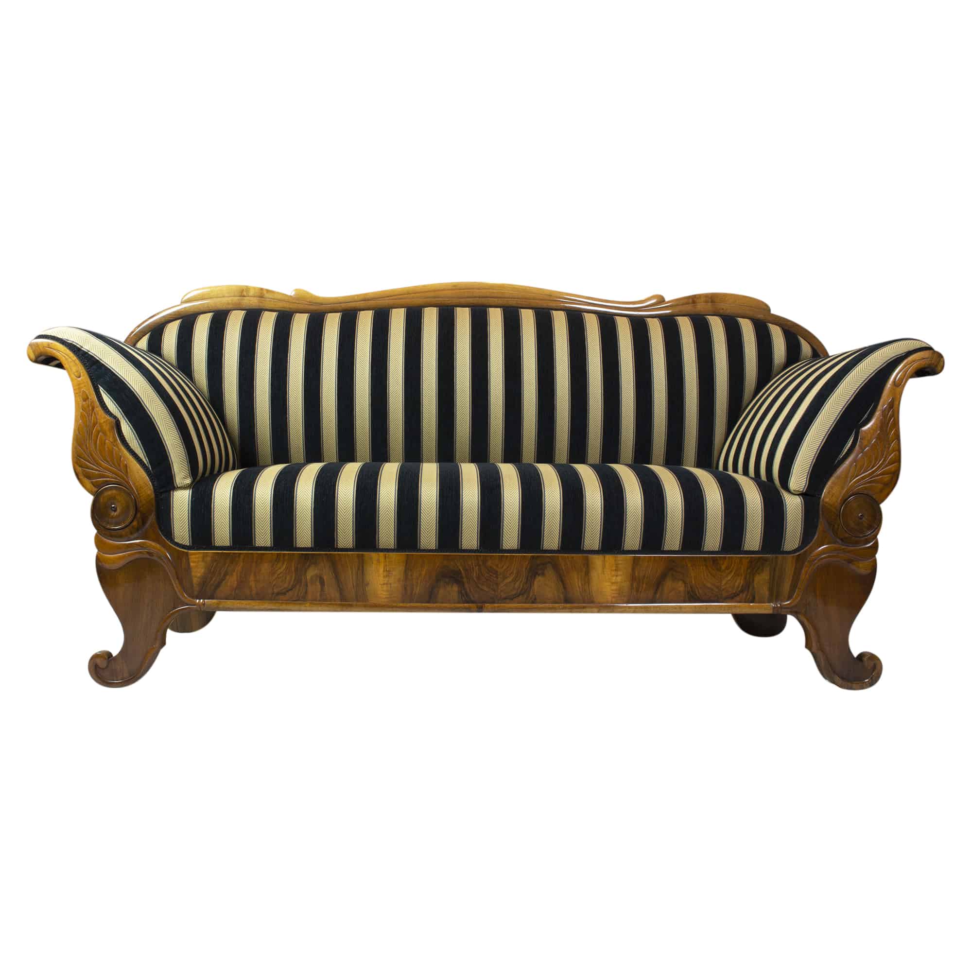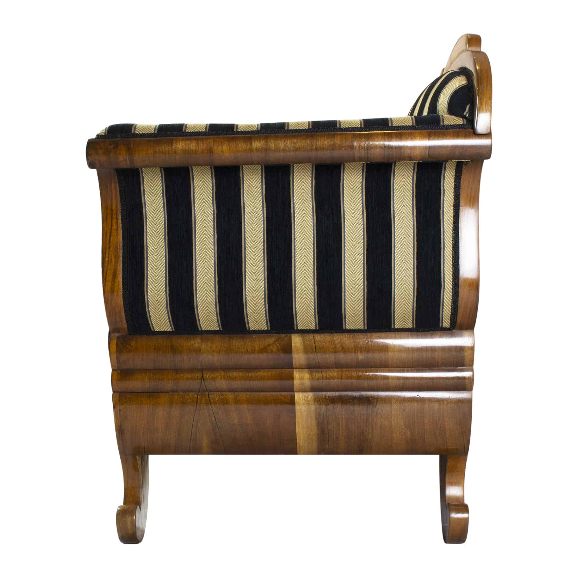 The Biedermeier walnut sofa dates back to the Biedermeier period around 1825. The walnut veneer frame is hand polished with shellac. The seat, back and armrests are completely reupholstered and covered with a beautiful stripped Biedermeier style fabric. The seating comfort is very good. The back of the sofa is removable.