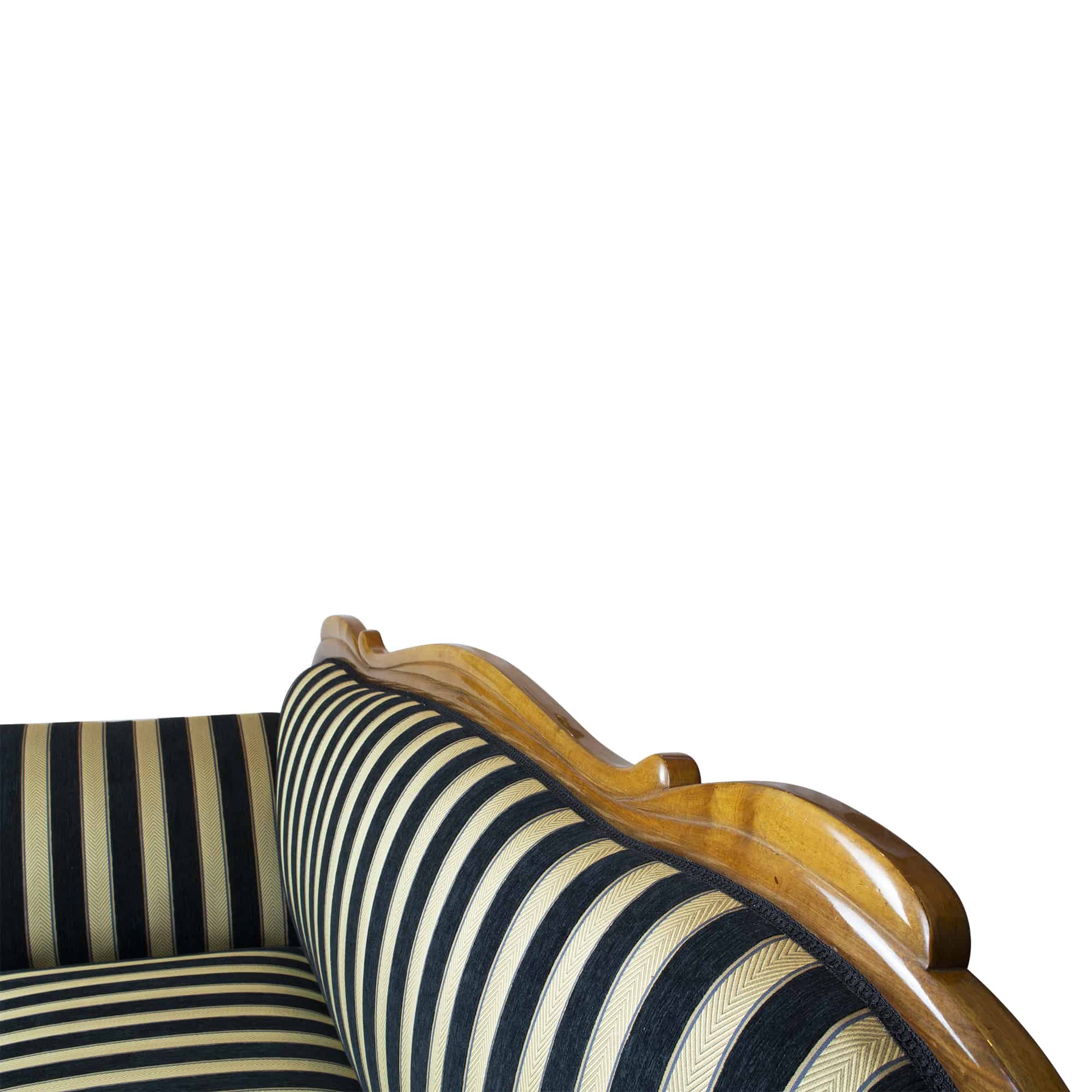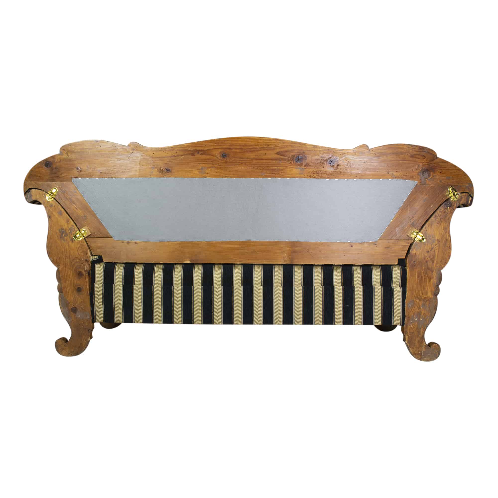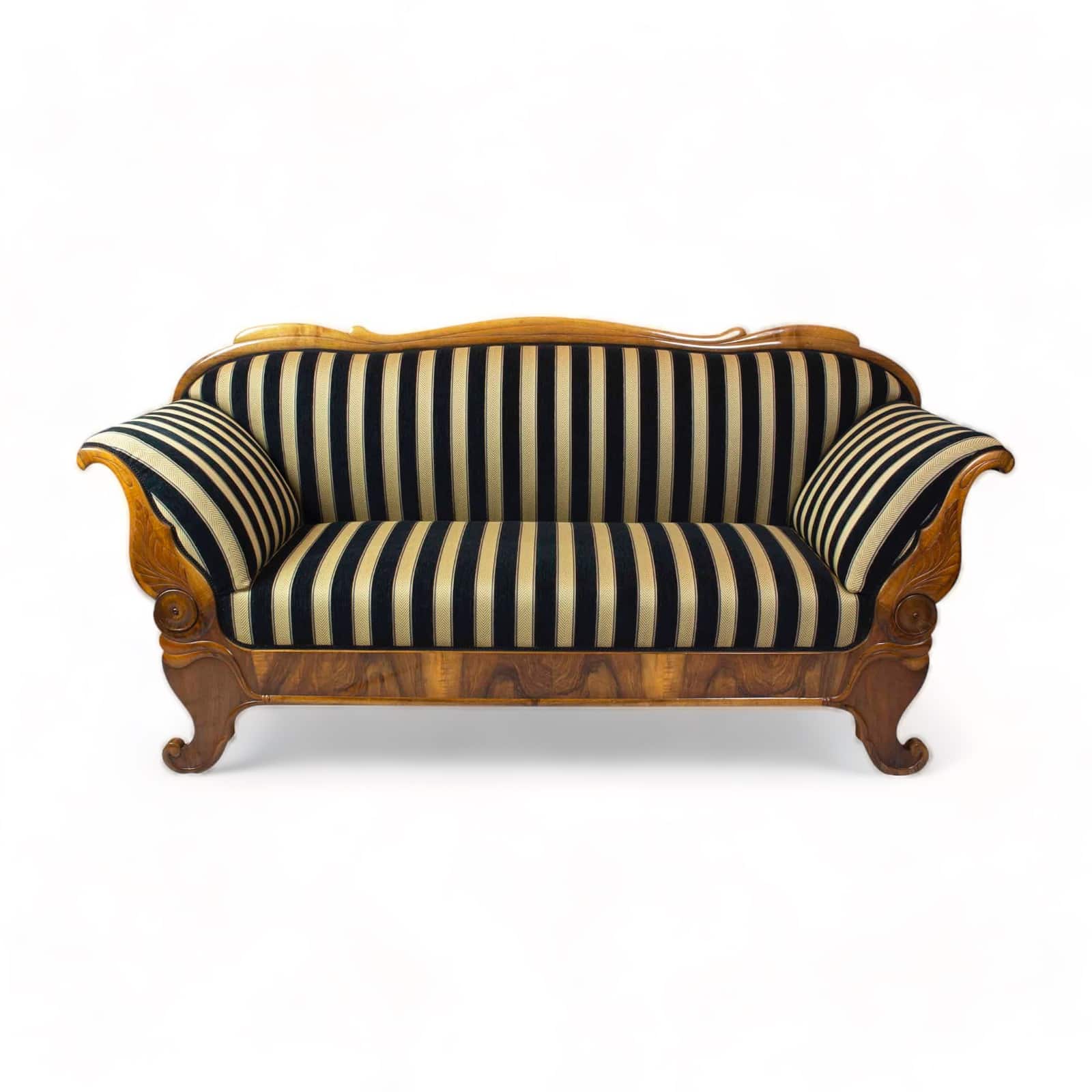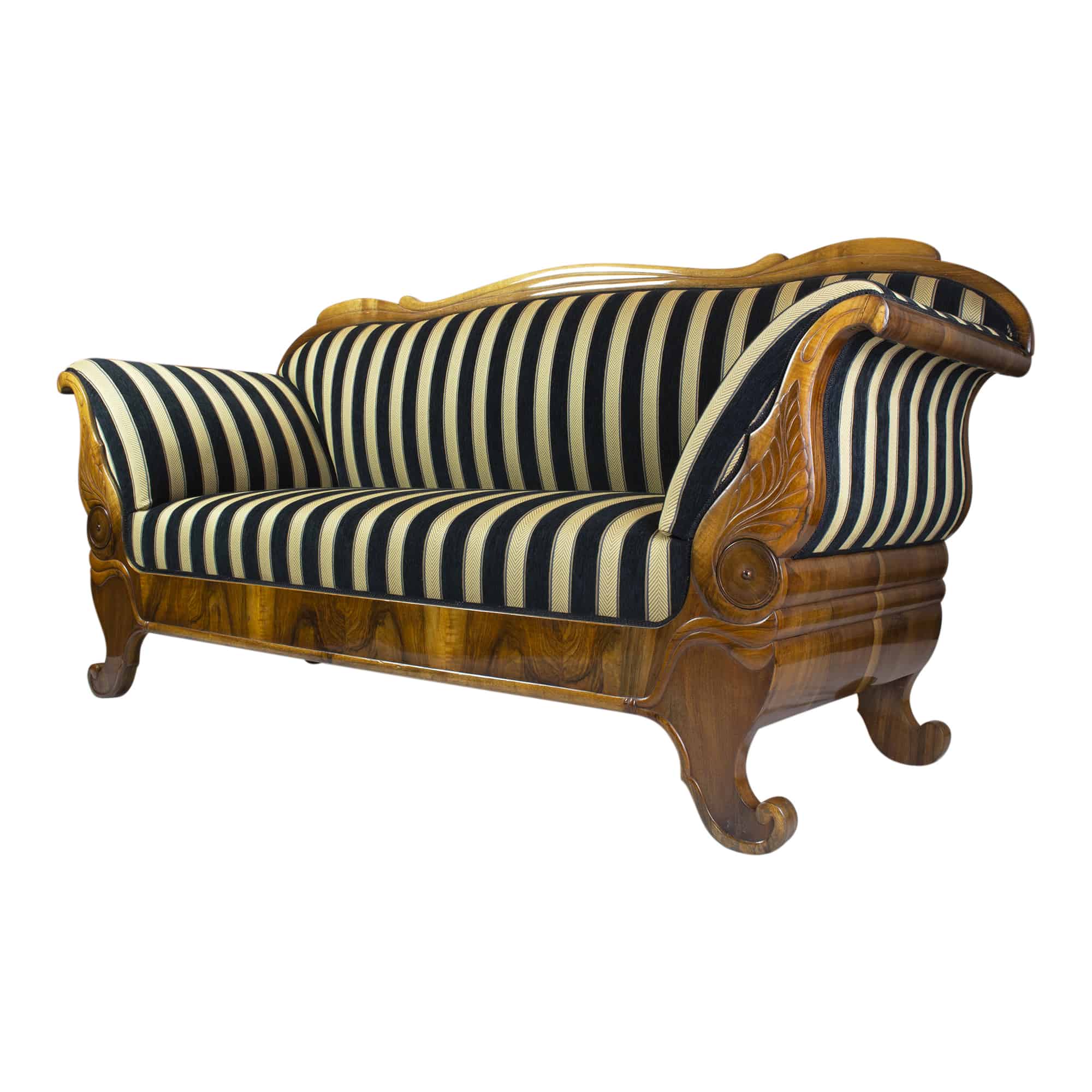 The Biedermeier walnut sofa dates back to the Biedermeier period around 1825. The walnut veneer frame is hand polished with shellac. The seat, back and armrests are completely reupholstered and covered with a beautiful stripped Biedermeier style fabric. The seating comfort is very good. The back of the sofa is removable.