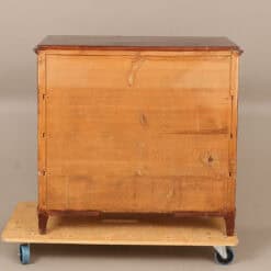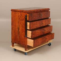 This Biedermeier Writing Desk showcases exceptional Swedish craftsmanship and elegant design. The piece features highly quilted golden birch veneers with a classic light honey French polish. This desk includes three main drawers and seven small upper drawers. Two side cupboards and one central cupboard provide excellent storage. Ormolu-style details and white knobs add refined character. The drop-down front creates a practical writing surface. The desk combines function with beautiful antique design. Carved detailing along the base adds depth and visual interest.