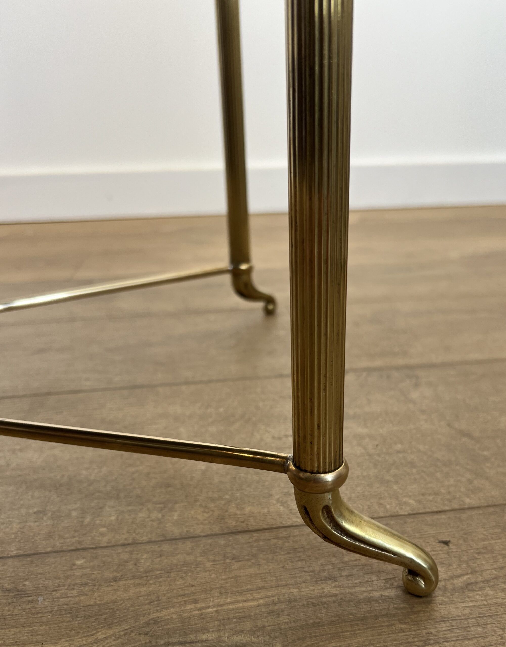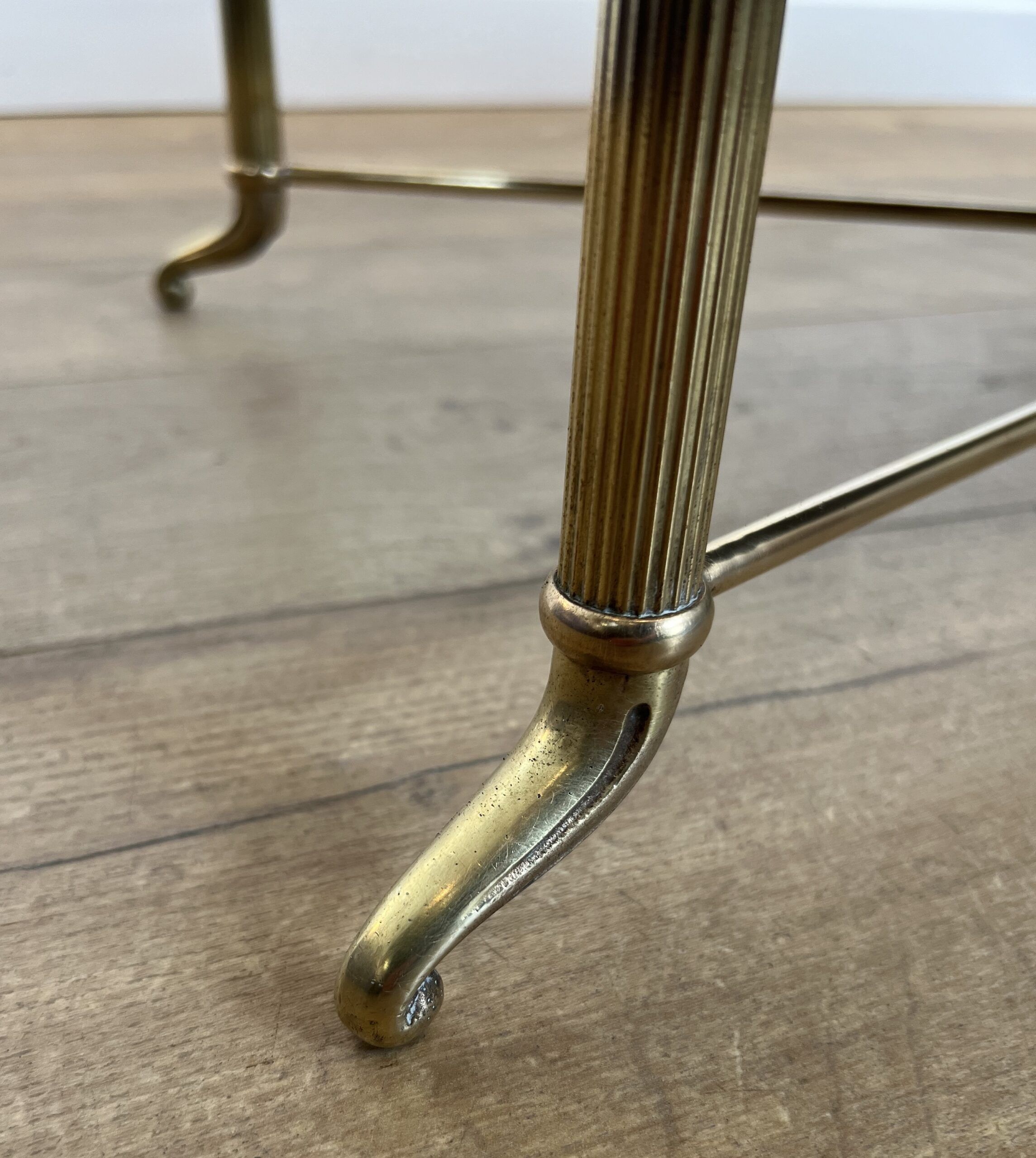 This elegant brass coffee table features a black lacquered glass top and is crafted in the iconic style of Maison Jansen, known for its luxurious and timeless design. The rectangular brass frame compliments the dark glass top, creating a sophisticated contrast that enhances any living space. This table’s refined aesthetic and versatile style make it a perfect addition to both classic and contemporary interiors. French work, circa 1940, the piece embodies the elegance and craftsmanship synonymous with Maison Jansen, making it an exceptional find for discerning collectors and decorators.