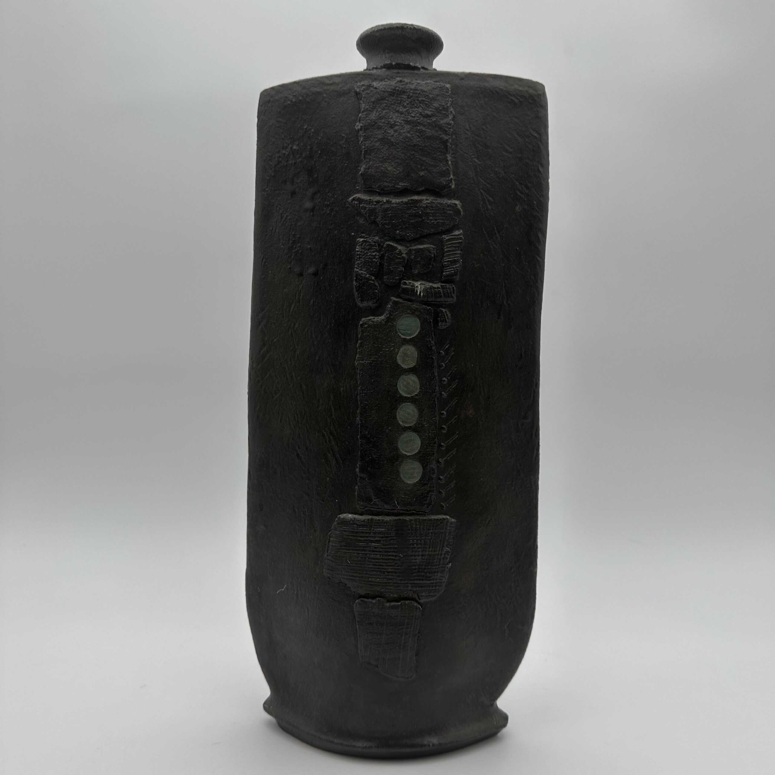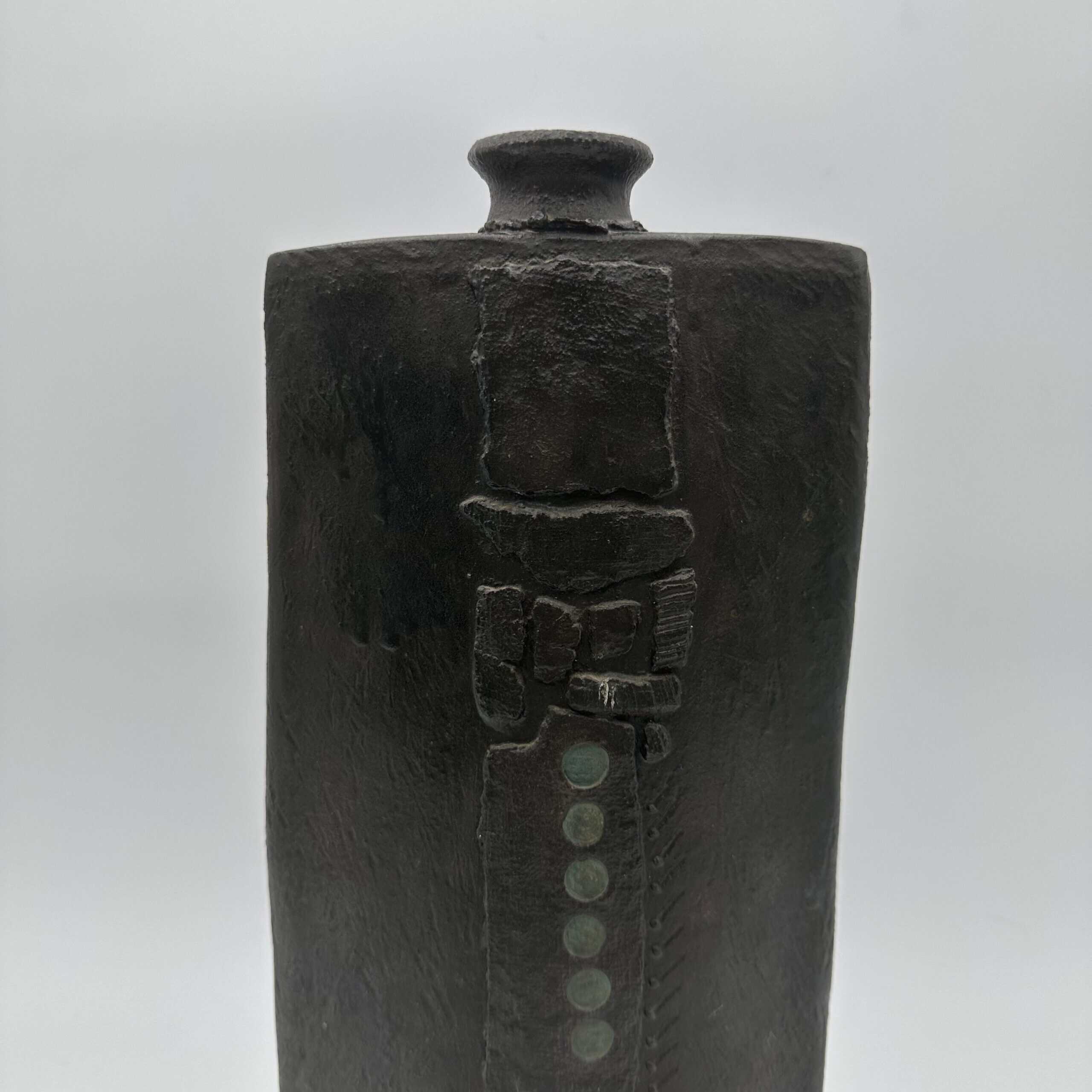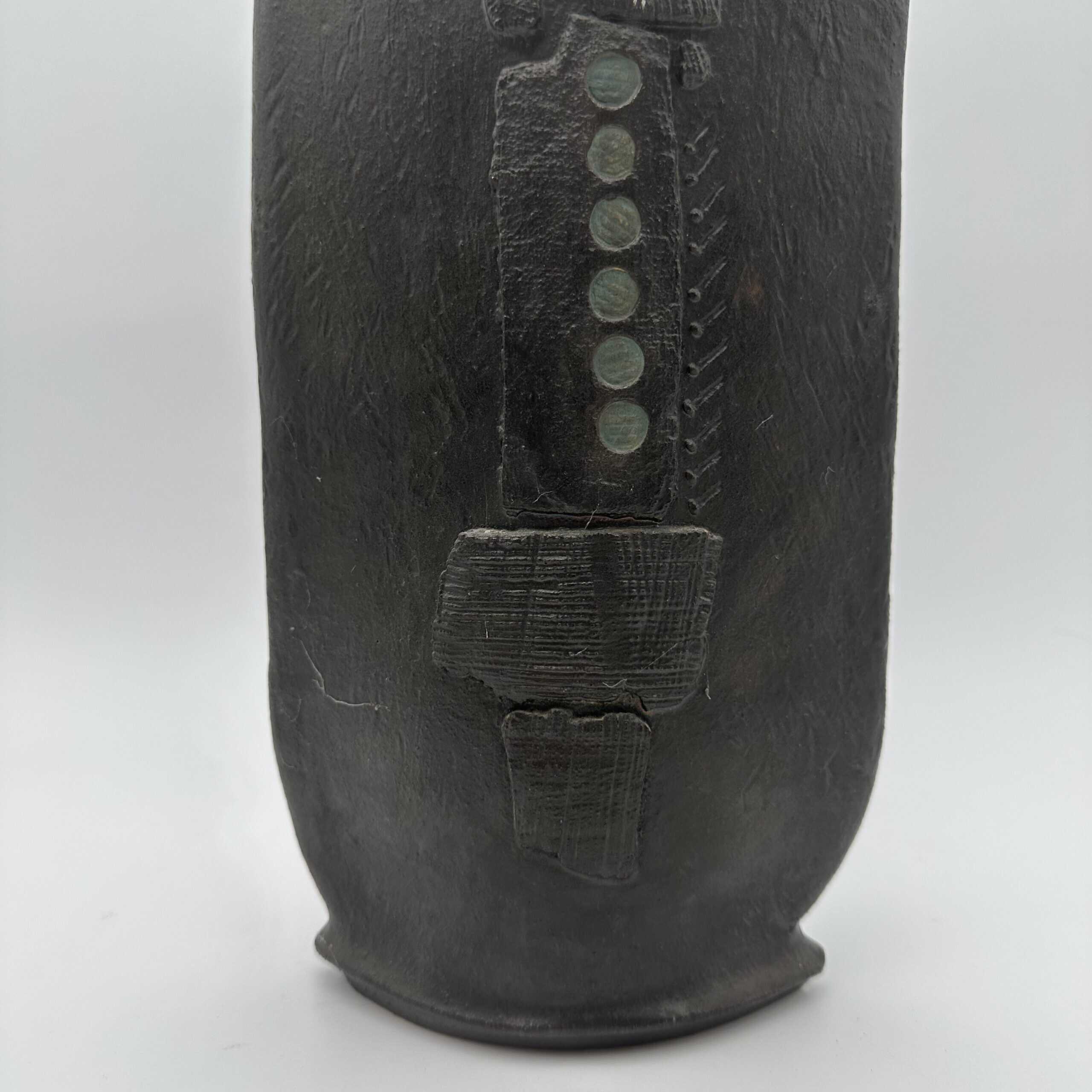 The surface shows a rough matte black glaze that absorbs light. A vertical relief dominates the front with striated textures and geometric blocks. Small circular indentations add rhythm and structure. This vase uses texture to create visual tension and depth.