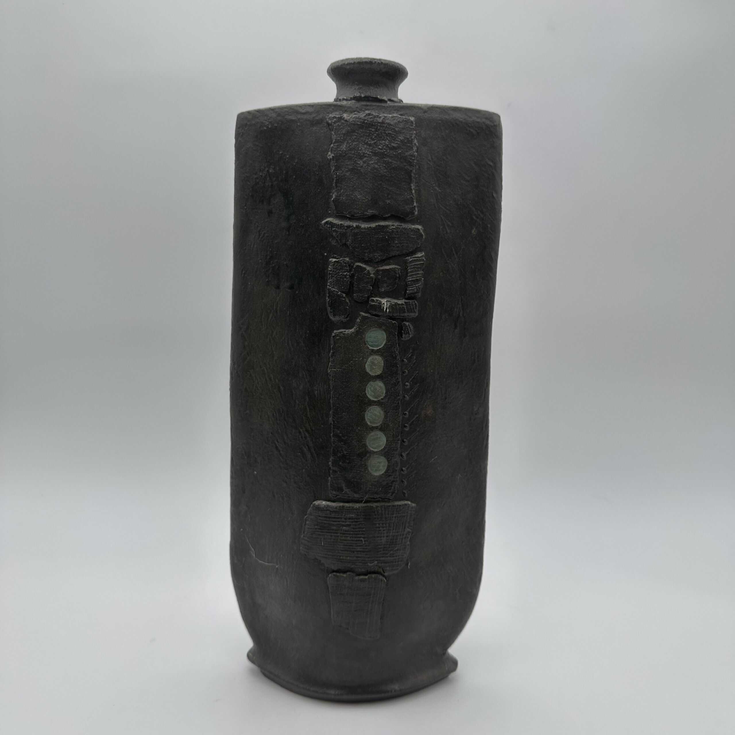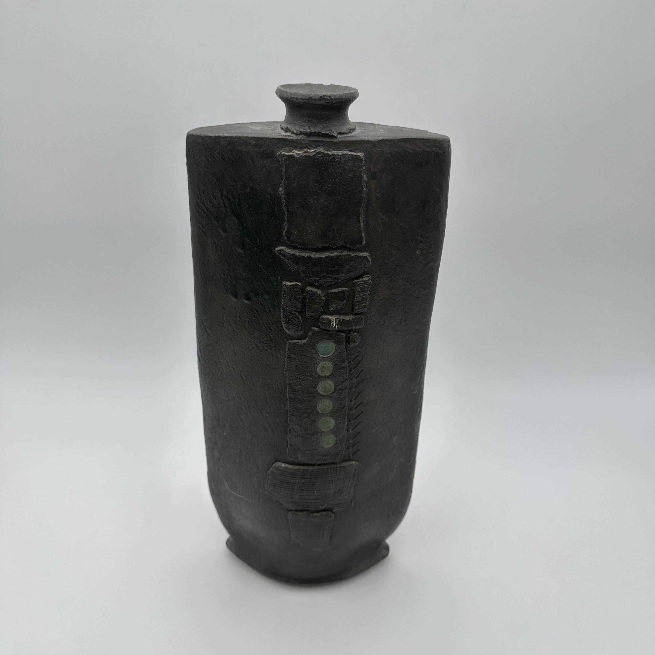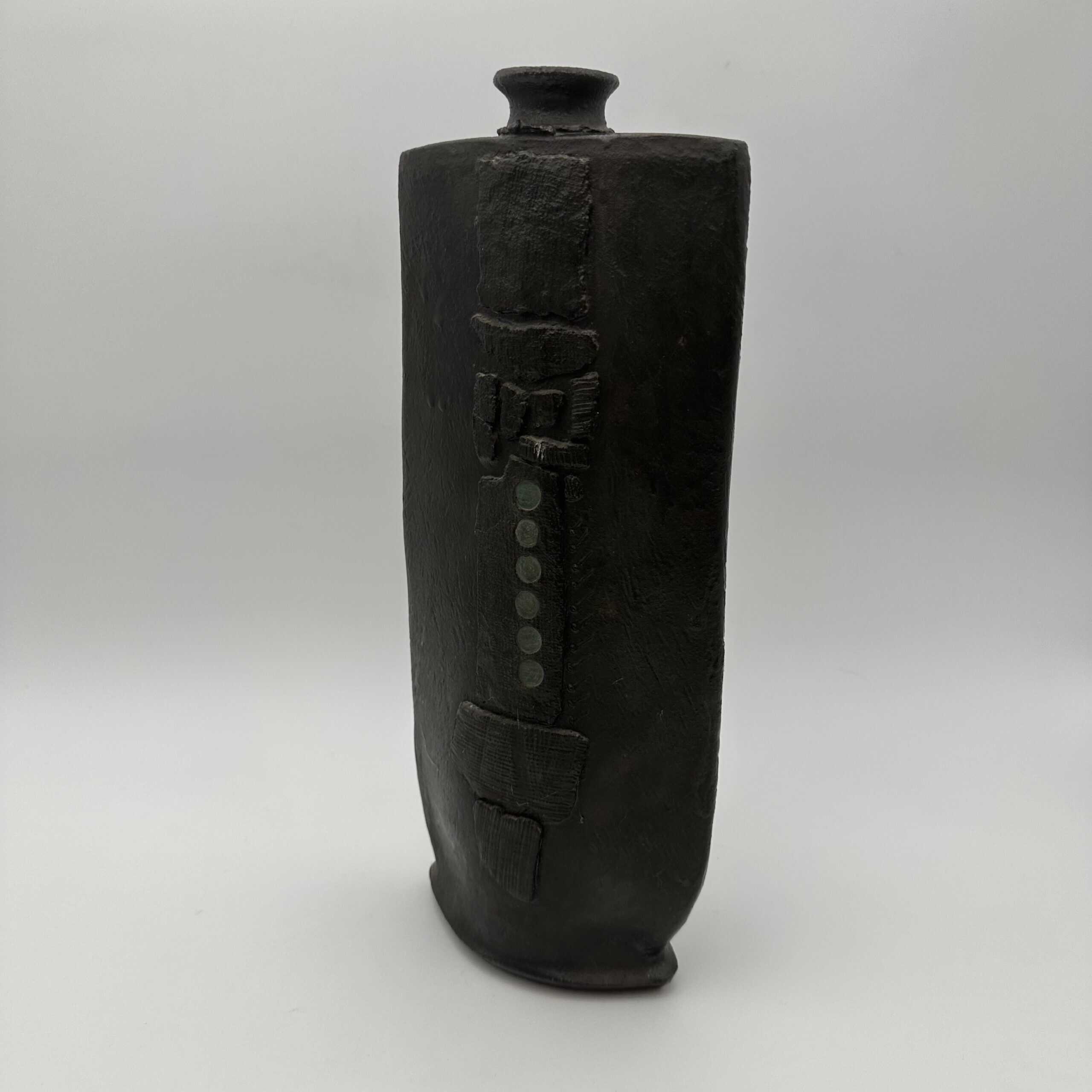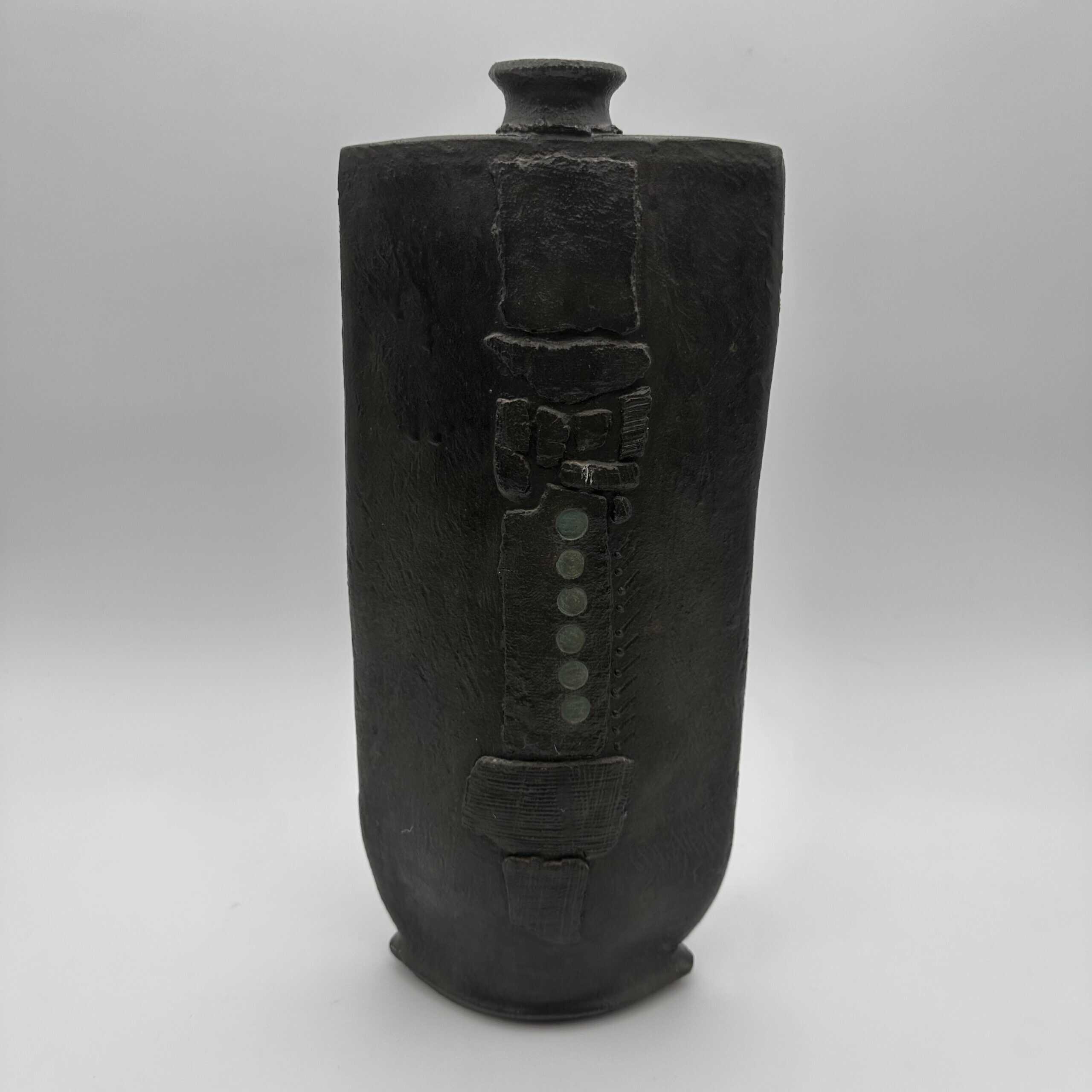 The surface shows a rough matte black glaze that absorbs light. A vertical relief dominates the front with striated textures and geometric blocks. Small circular indentations add rhythm and structure. This vase uses texture to create visual tension and depth.