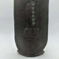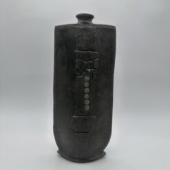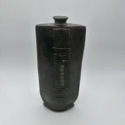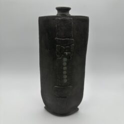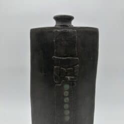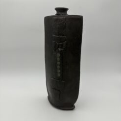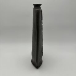 This Brutalist Black Ceramic Vase embodies the raw strength of 1960s and 1970s studio ceramics. The artist rejects utility and focuses on sculptural form. The design reflects brutalist principles and architectural influence. This vase features a flattened body with a narrow, constricted neck. The form suggests ancient steles and stone structures. The proportions create a strong vertical and architectural presence.
