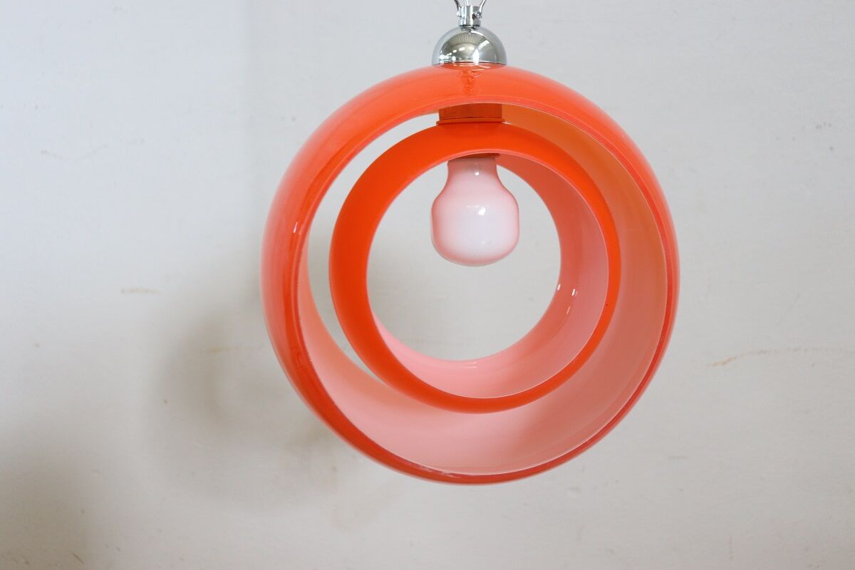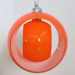 This Carlo Nason Pendant Lamp showcases the iconic “Eclisse” model designed in the 1960s for Mazzega. The piece features fine Murano glass crafted in vetro incamiciato. The outer surface shows a vivid orange tone, while the inner layer displays clean white glass.