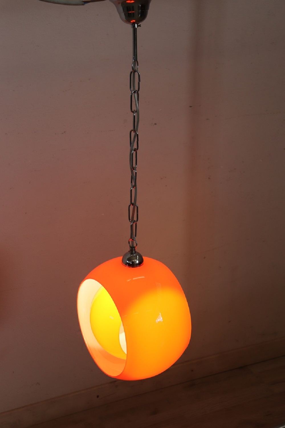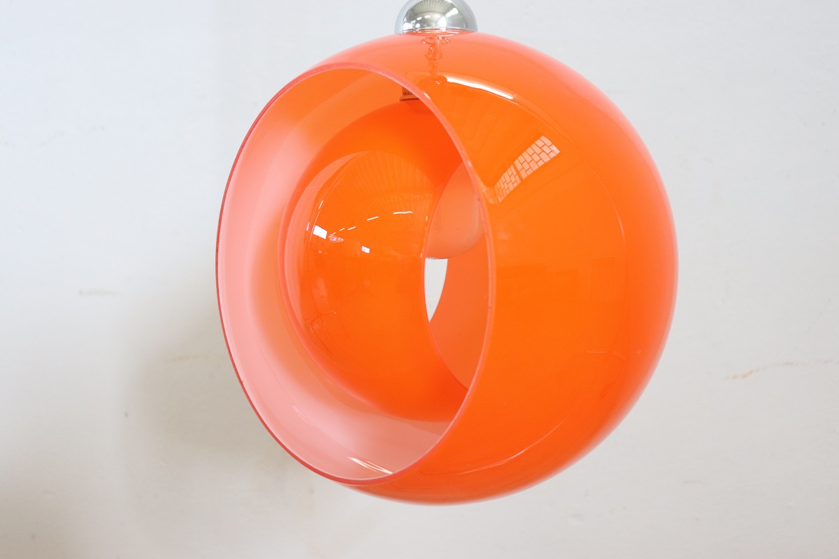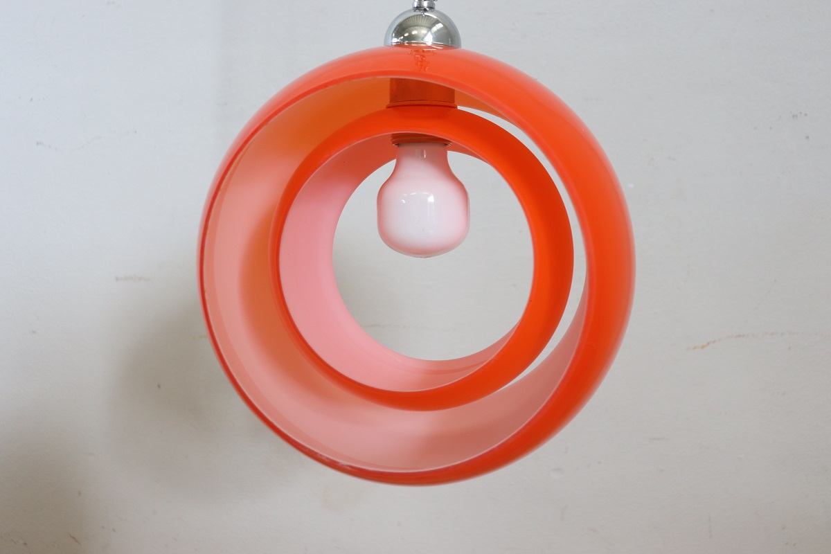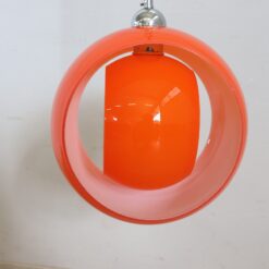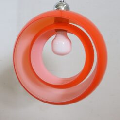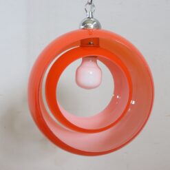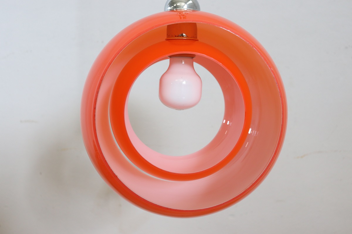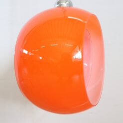 The futuristic shape reflects the strong space-age style of the period. Two circular glass elements sit one inside the other and rotate with ease. Their movement creates striking light patterns. The warm optical effect that forms when light meets the orange glass adds exceptional atmosphere.