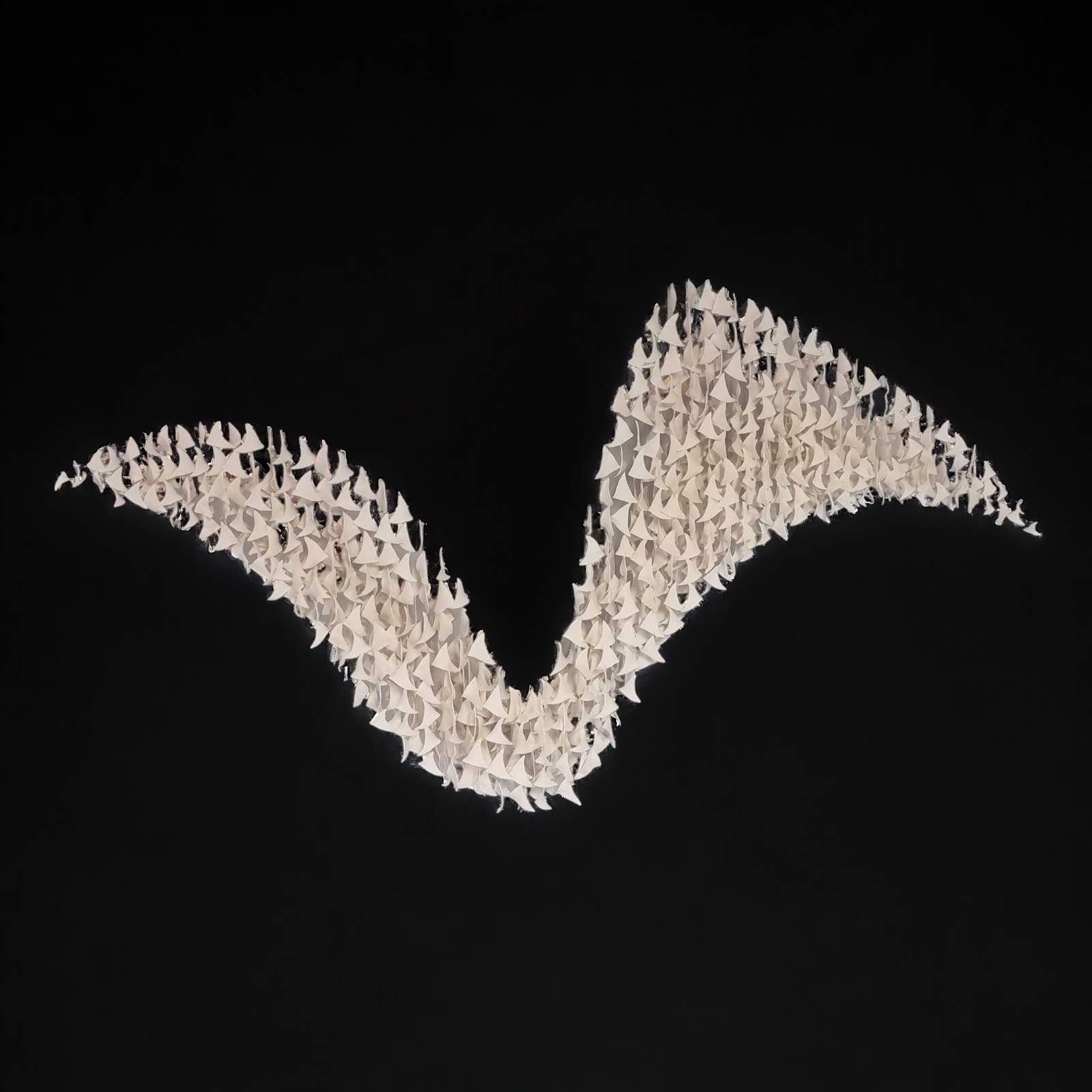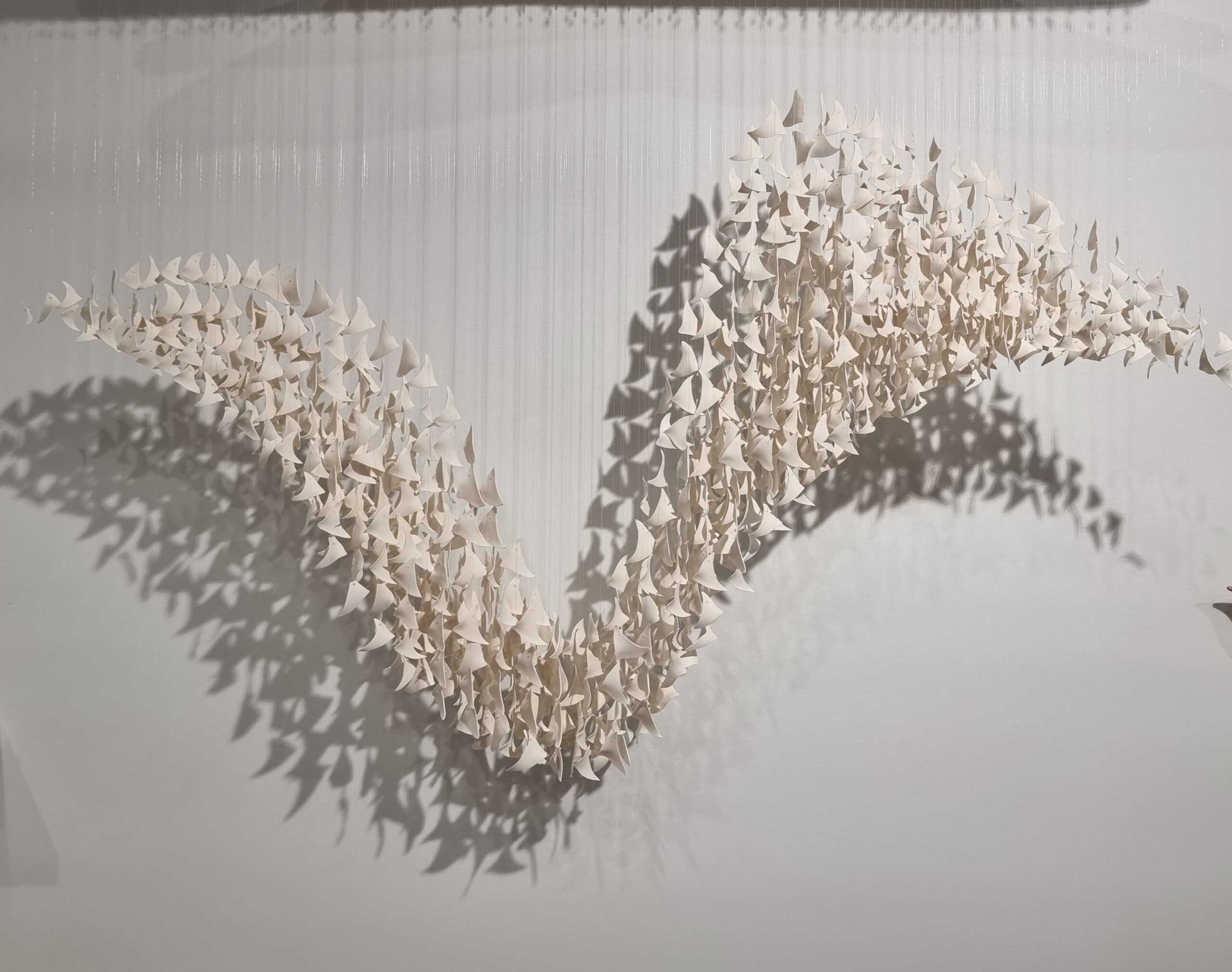 To create porcelain elements, I roll out a thin sheet with a thickness of 2 millimeters. The shapes are cut with a knife or cookie cutter. They are then reworked to refine the edges and achieve a more flexible form. They are pierced using a potter’s needle (for the suspension nylon thread to pass through). 2 firings are done, the first at 1000 degrees, the second at 1250 degrees, which provides both strength and the unique color of the porcelain. For stringing, I create a final dimension plan with each thread marked in its place to achieve a better result in the final form. Each element is threaded onto a nylon thread with a small transparent bead that allows for blocking. The threads are marked with a letter and a number to hang them at the right spot on the support with a small hook. This support can be directly attached to the ceiling or fixed to the wall using brackets. A hanging plan is provided for installation.