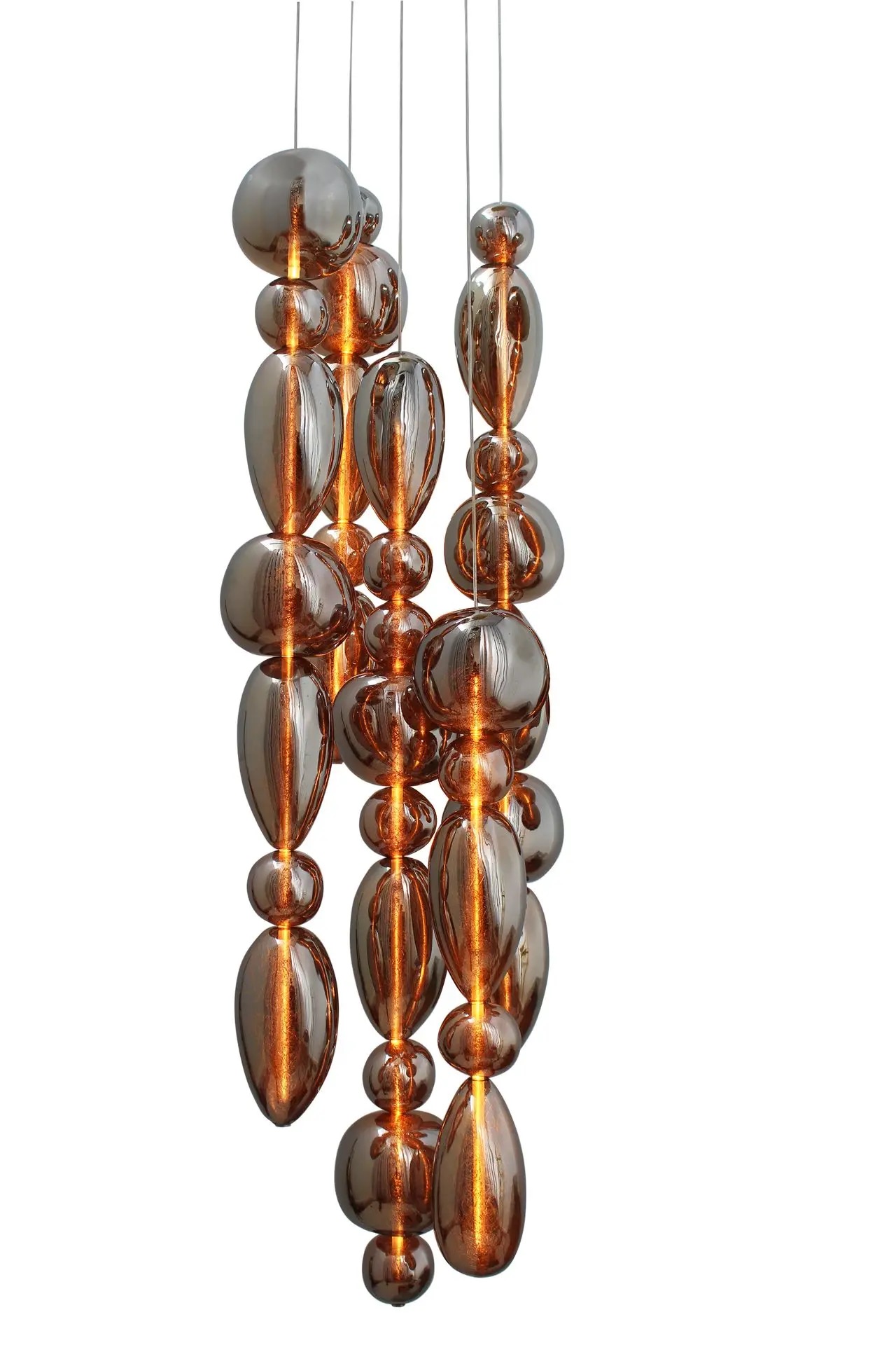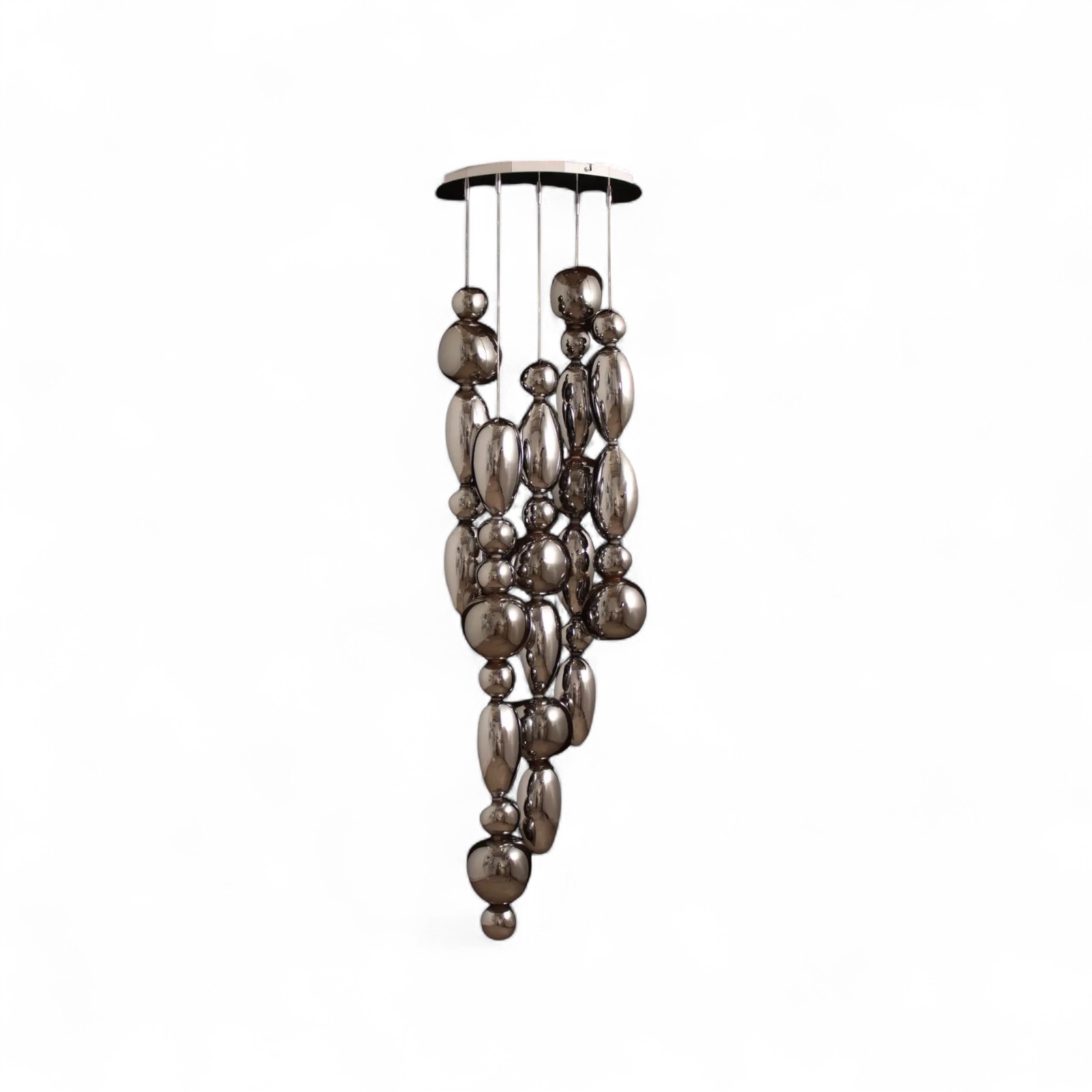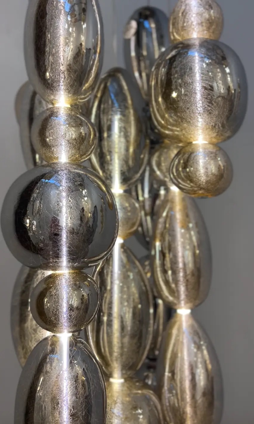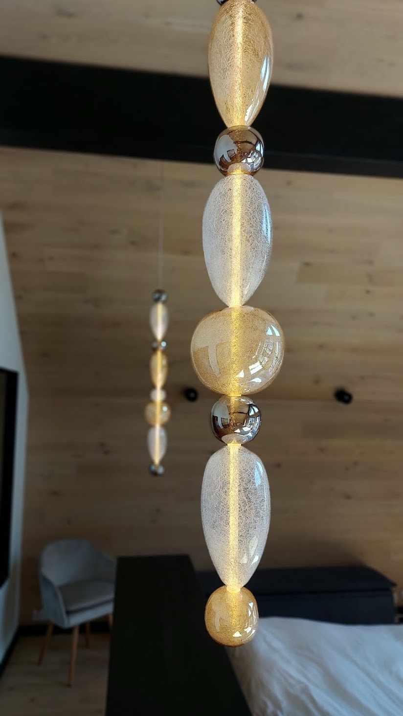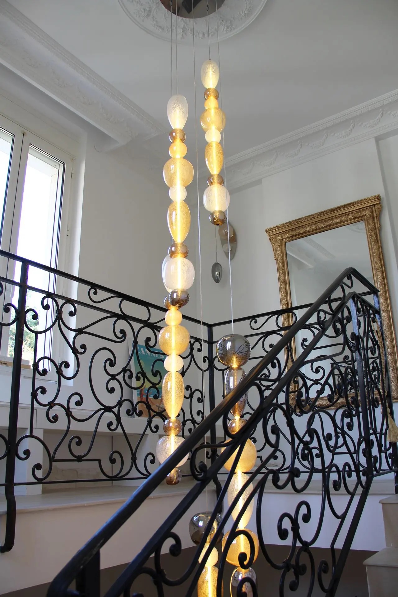 This stunning Chavana pendant light creation is a variant of the Vallons Obscurs Pebbles, maintaining the same surprising on/off light effect. Each glass pebble contains delicate glass filaments that appear and capture light in a mesmerizing way, offering both artistry and innovation in illumination.