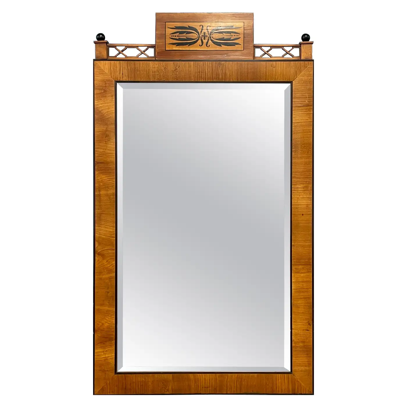 Enhance your space with this exquisite Biedermeier Mirror boasting a stunning cherry veneer. The mirror’s top features a captivating open-work gallery adorned with a rectangular decorative ornament showcasing intricate inlaid floral decor. The decoration’s dark color contrasts beautifully with the light veneer. Rest assured, the Biedermeier mirror glass is original, adding authenticity to its charm. In good original condition, this mirror is a testament to timeless beauty. Overall a wonderful piece of antique furniture that is ready to grace your beautiful home today!