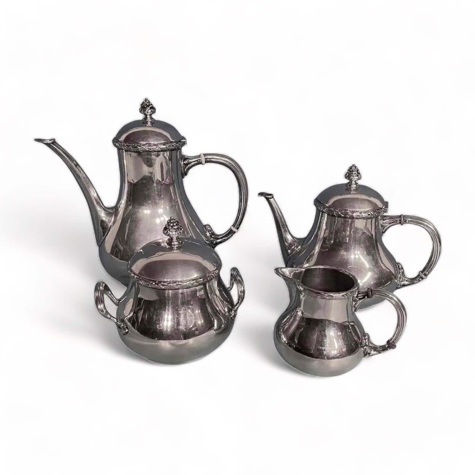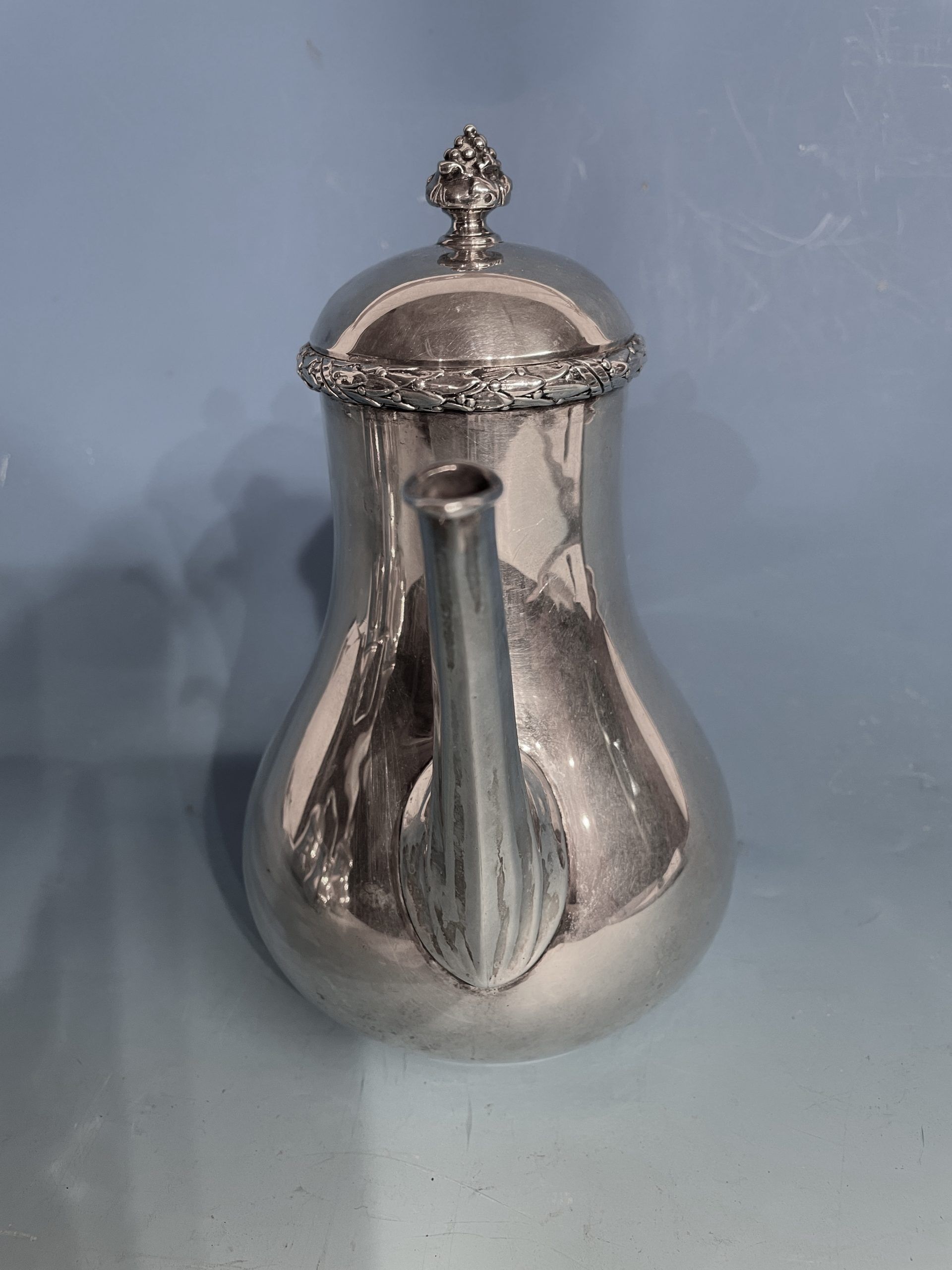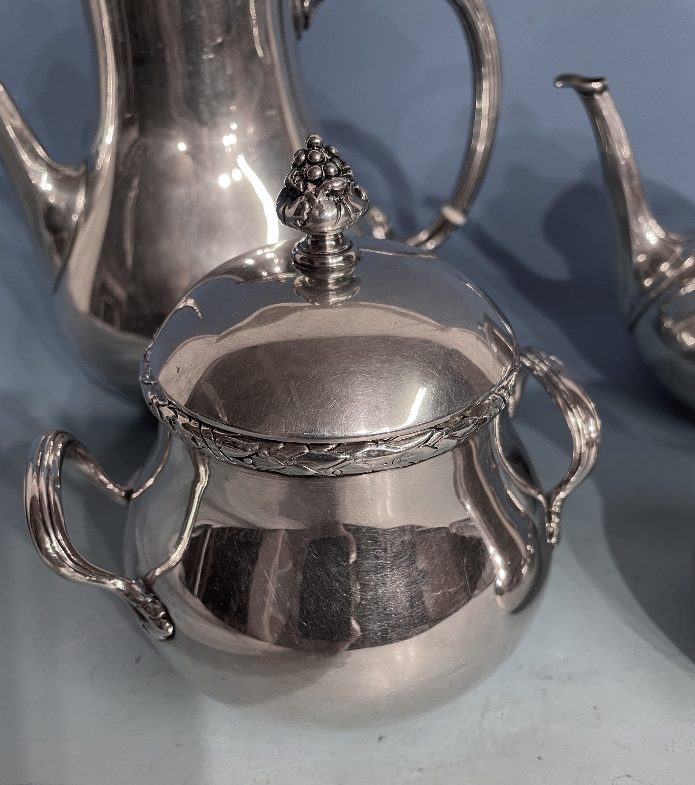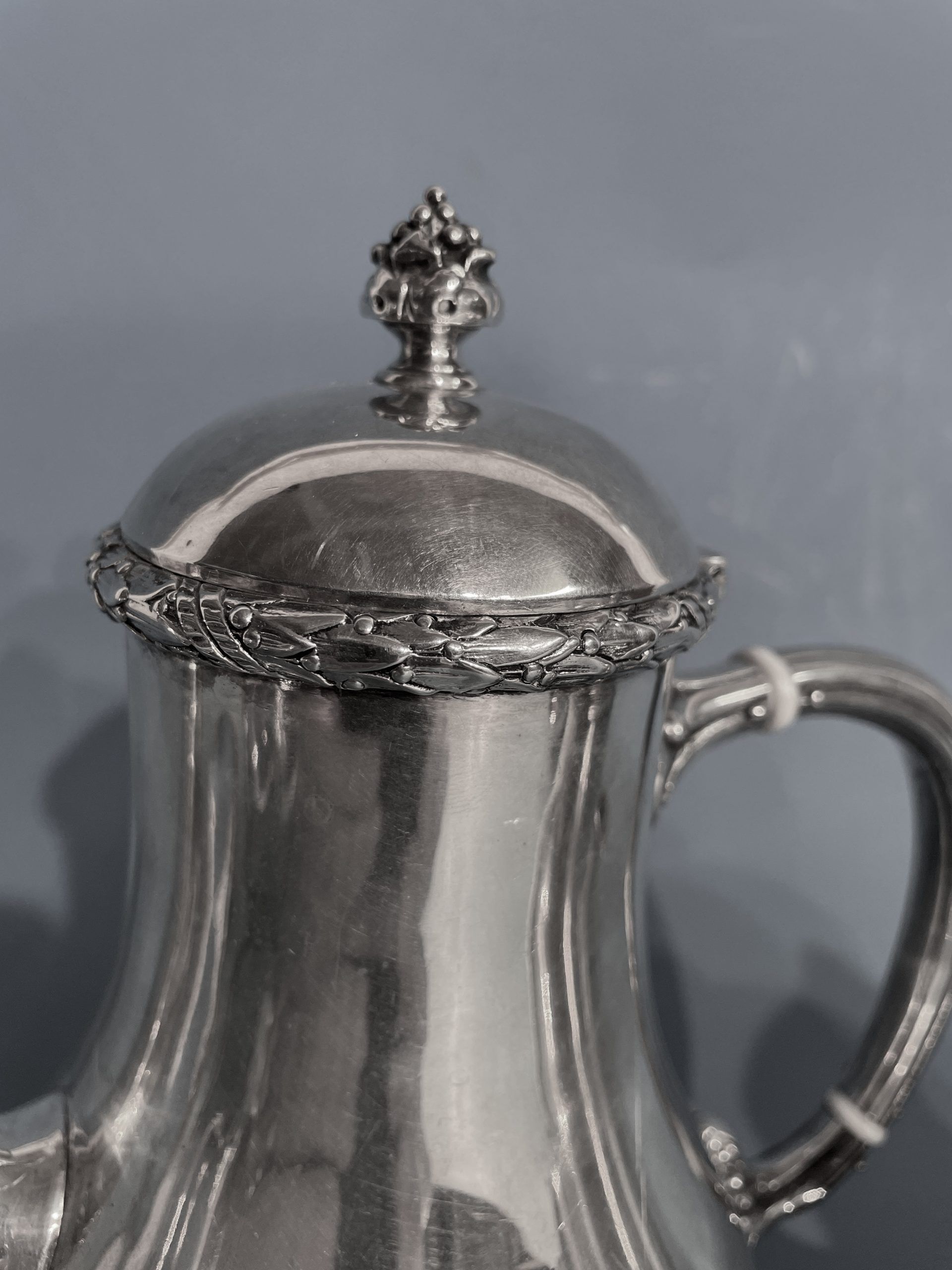 The antique coffee and tea set silver comes from Germany and dates back to 1890-1910. The pear shaped elegant coffee and tea set has beautiful repoussé details. The rim of the pots and sugar bowl are decorated with a laurel leave garland. At the base of the c-shaped handles are acanthus leaves. The knobs on the lids are mimicking grapes.