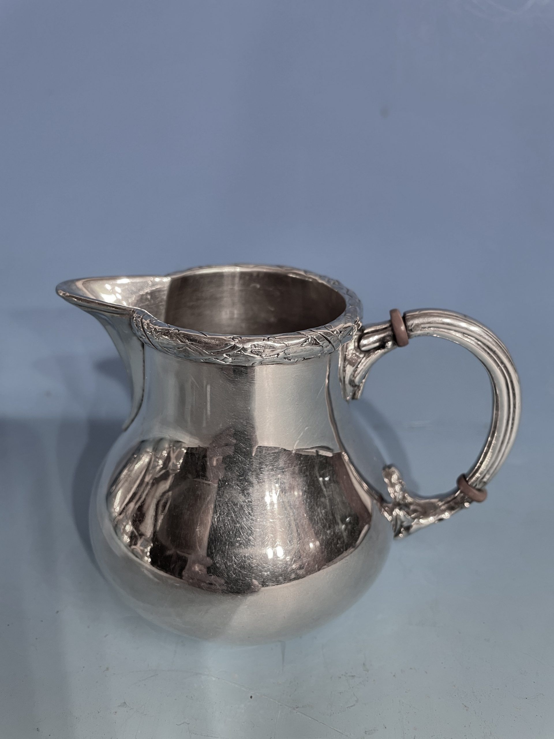 The set weighs 49.63 ounces (1,407 g). It is in very good condition. The cream pot has a small dent. Coffee pot: Height: 8 in. (20.32 cm), Width: 8.5 in. (21.59 cm), Depth: 5 in. (12.7 cm).