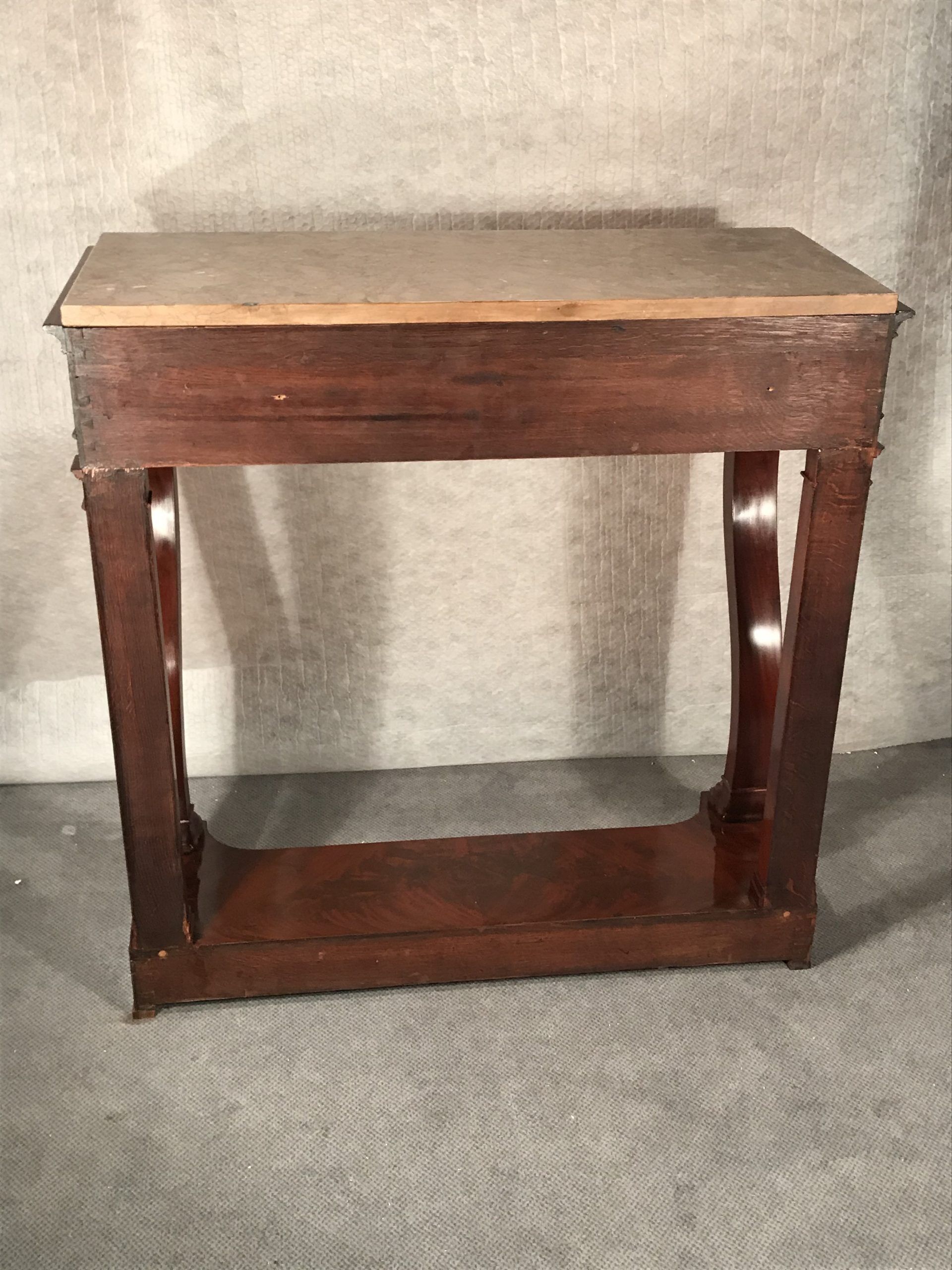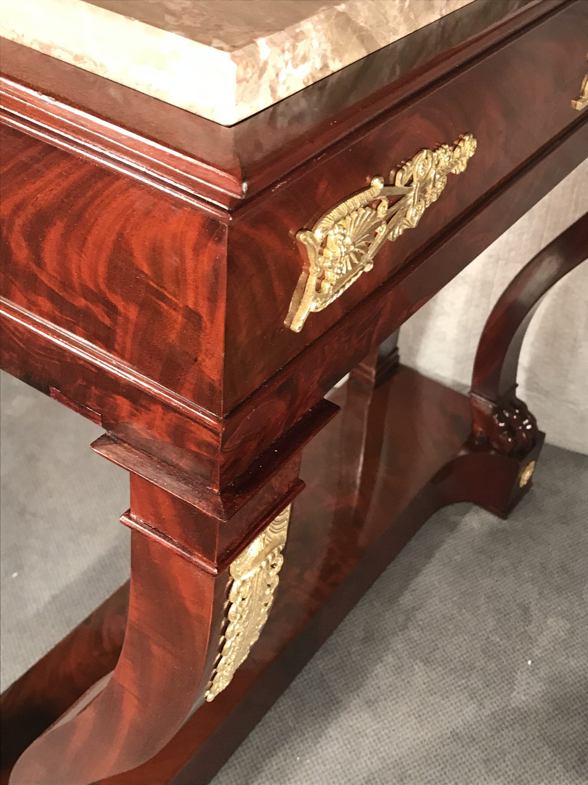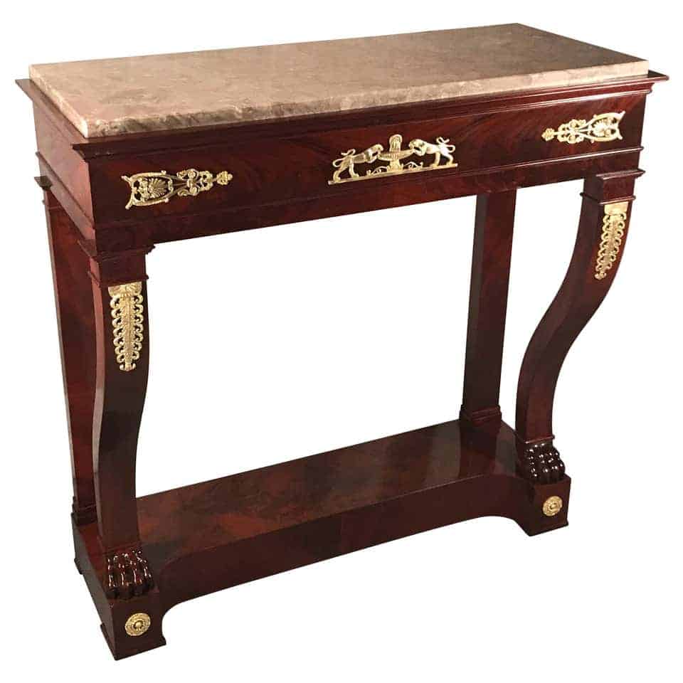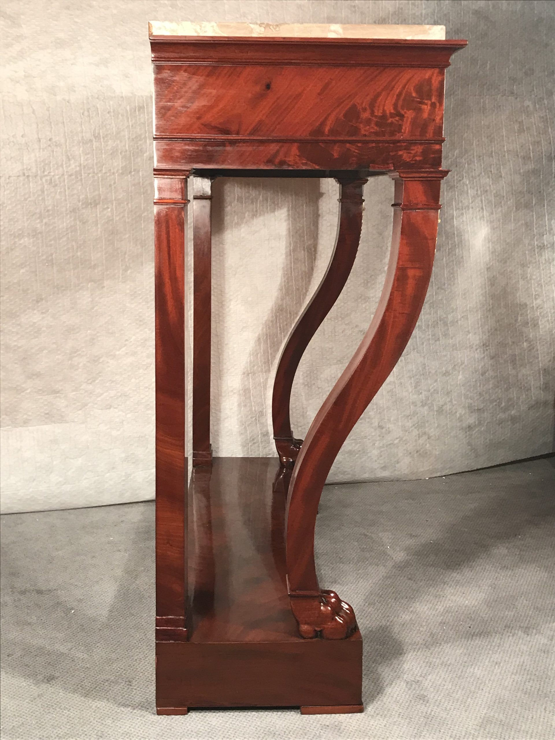 This exquisite console table with mahogany veneer dates back to around 1810-1820. It comes from France and is a beautiful example of a late Empire style which already has elements of the Restoration Period.