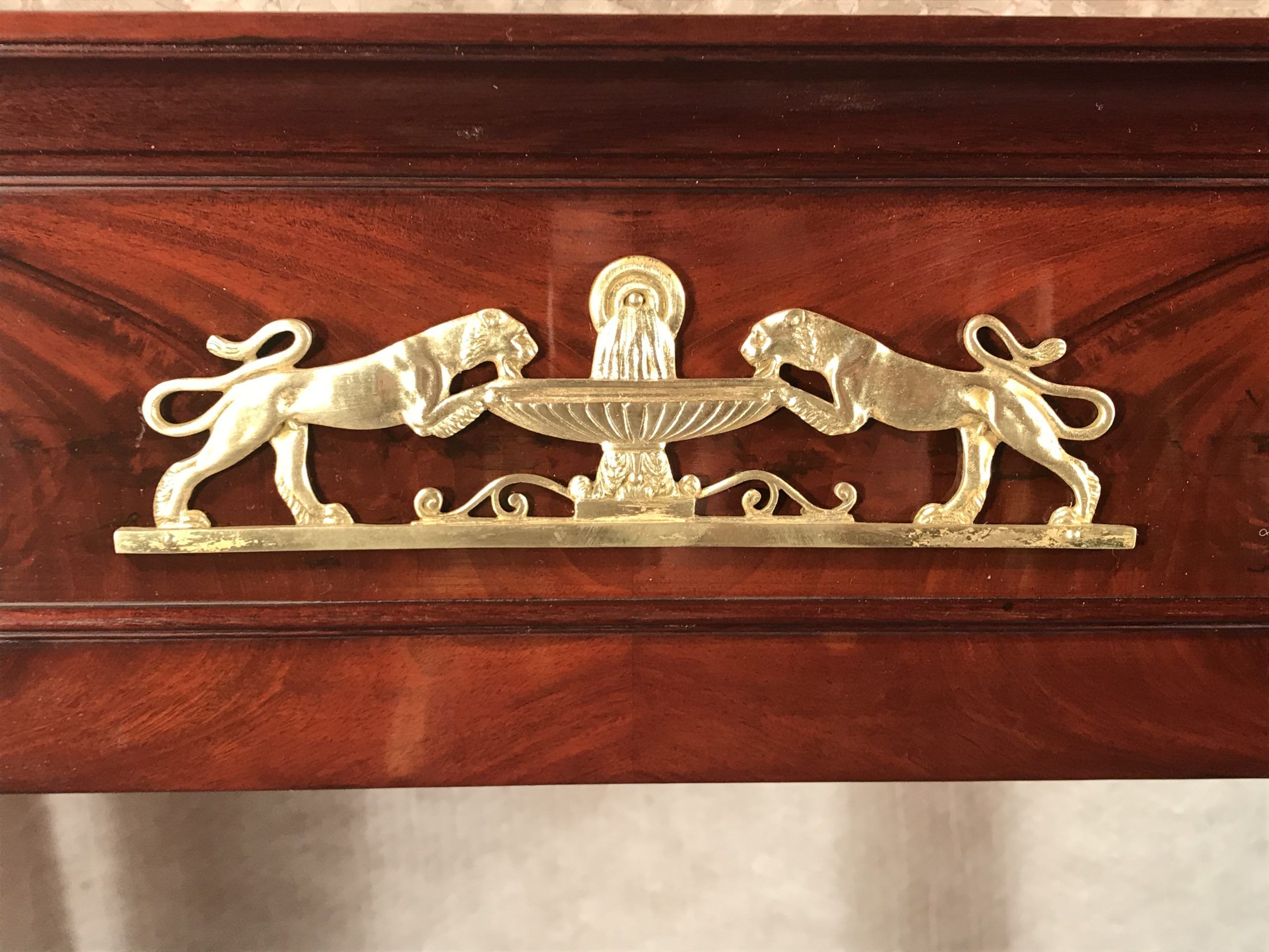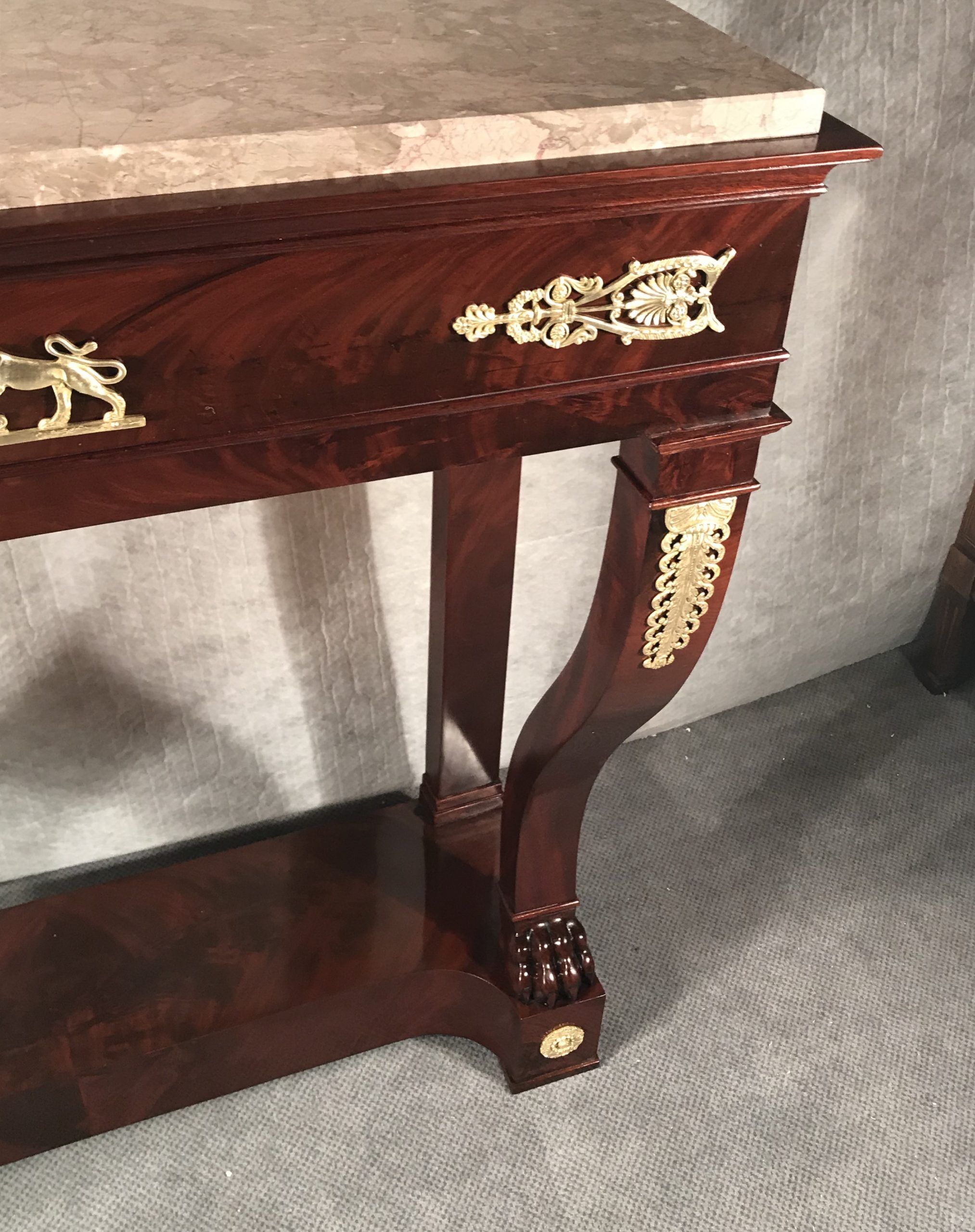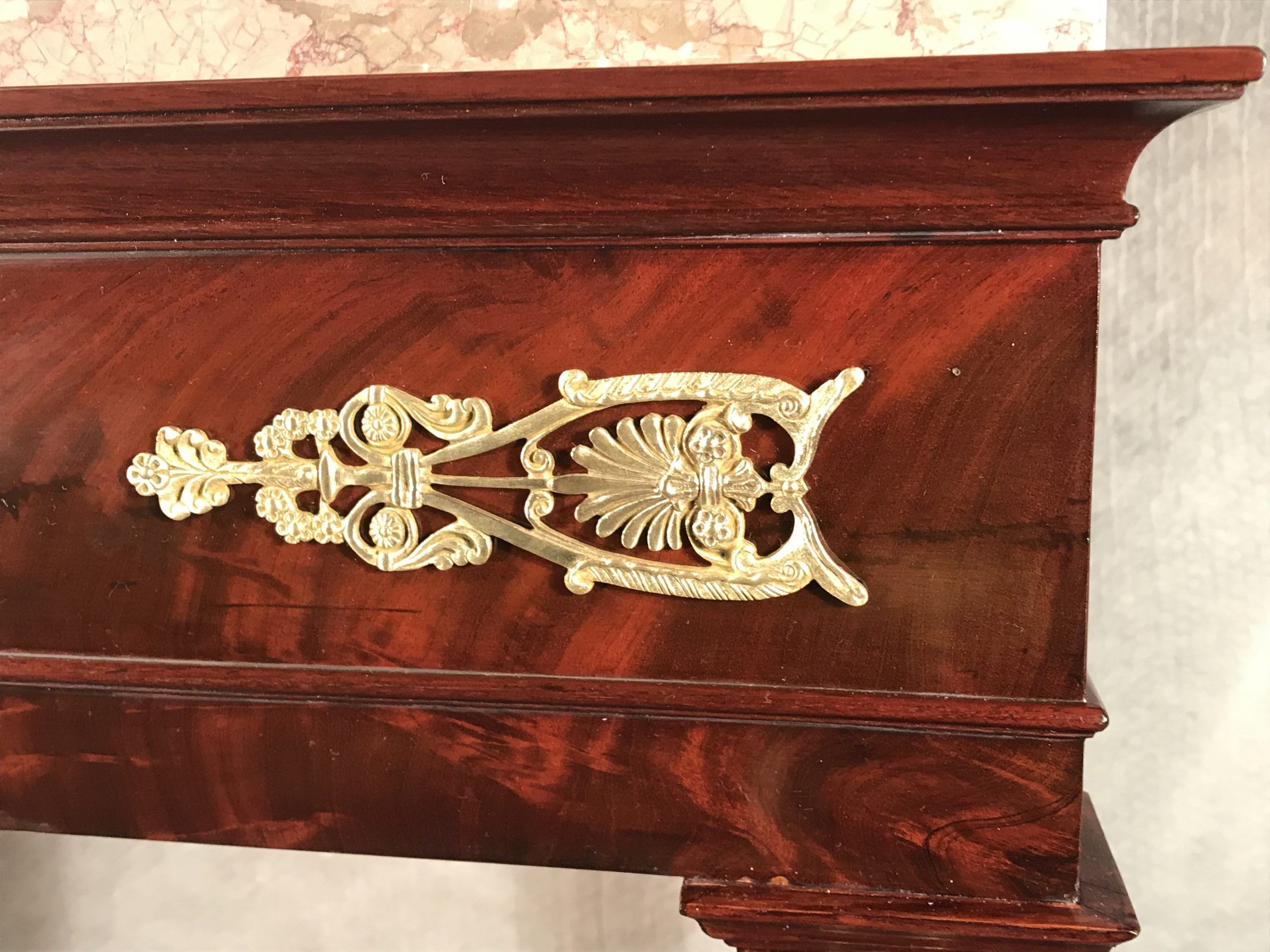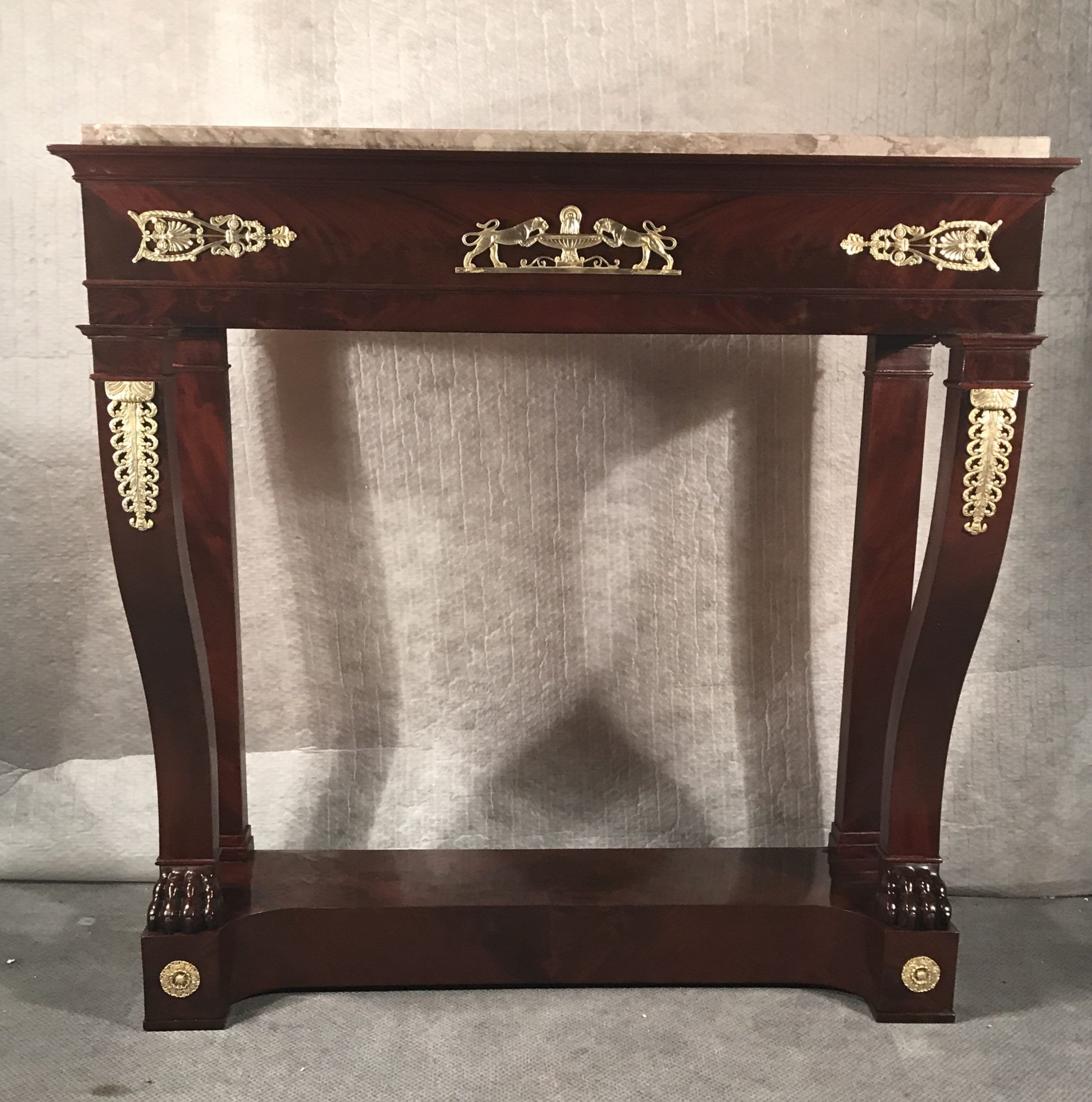 This exquisite console table with mahogany veneer dates back to around 1810-1820. It comes from France and is a beautiful example of a late Empire style which already has elements of the Restoration Period.