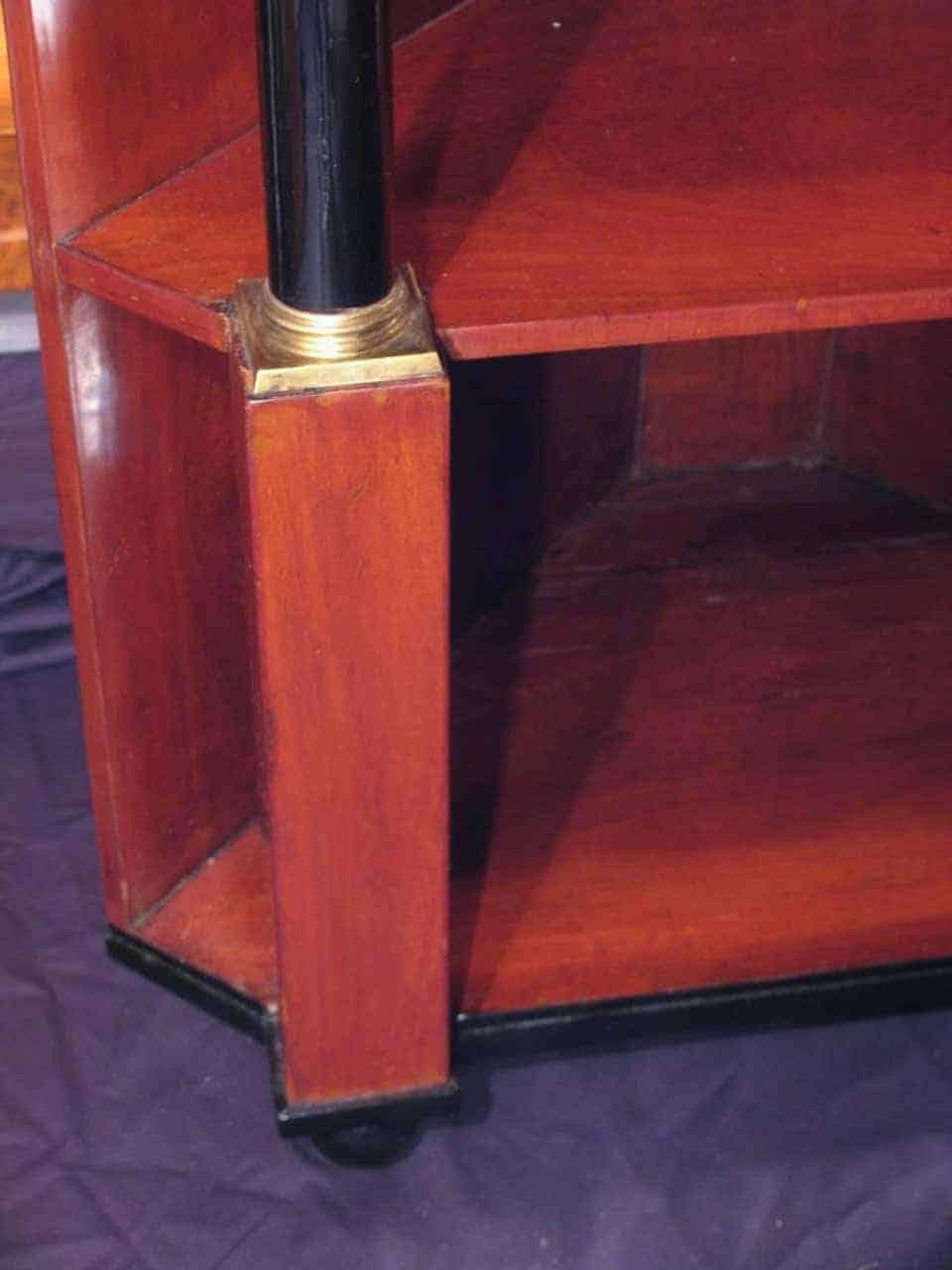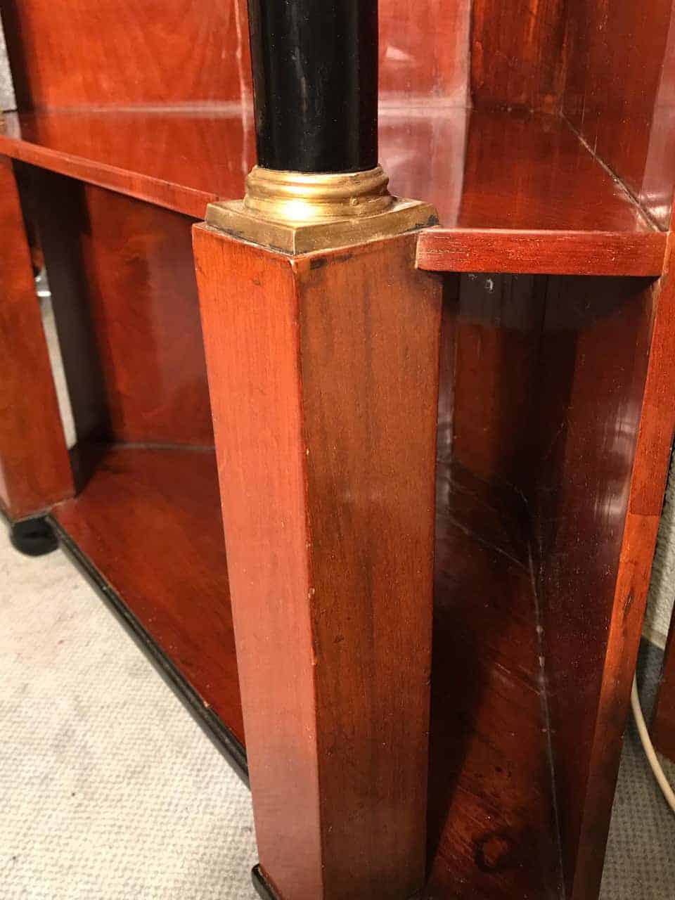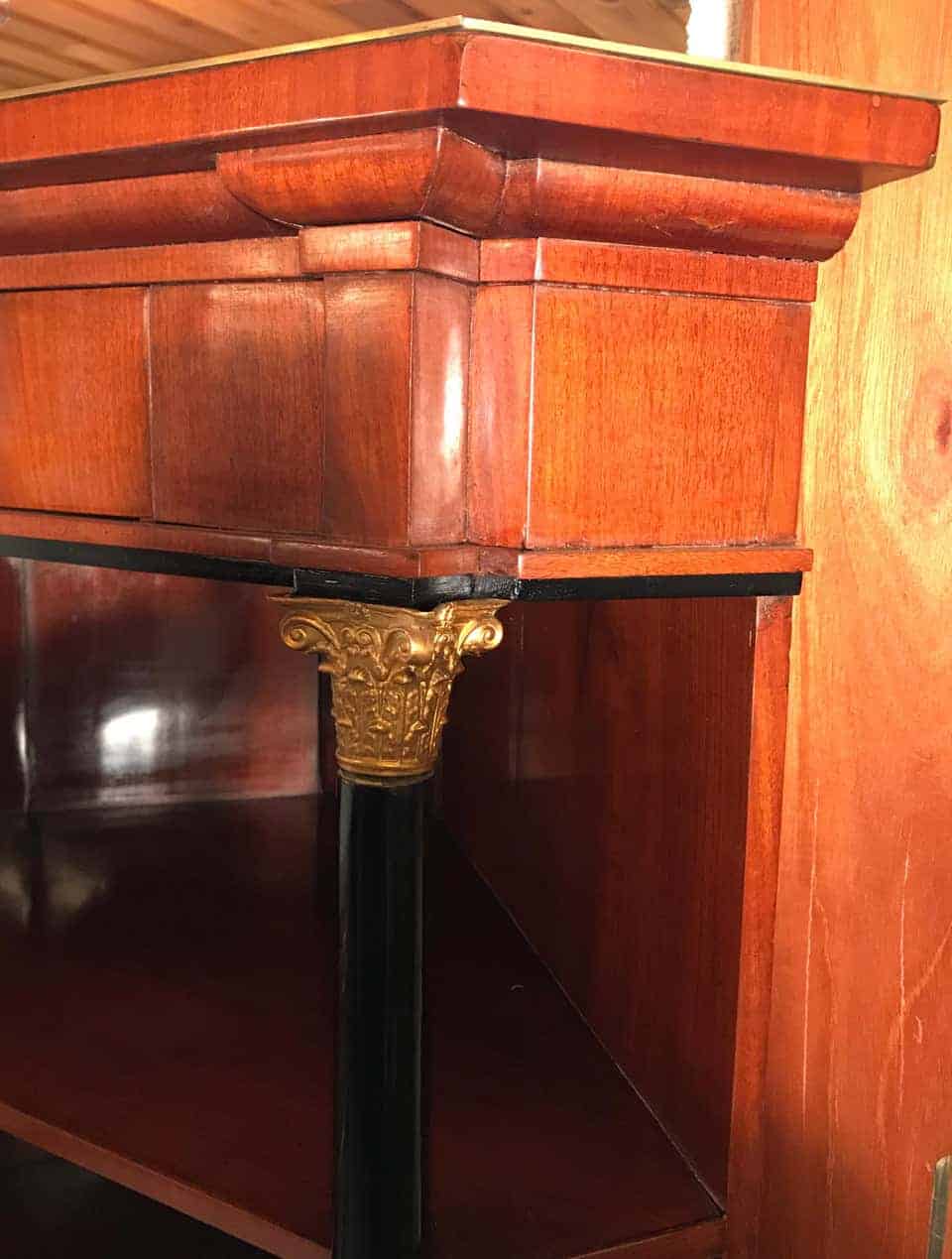 The cabinet has a beautiful mahogany veneer. Furthermore, ebonized columns with brass capitals and bases decorate the sides. Three open shelves and one drawer offer a lot of space to display books or decorative items.