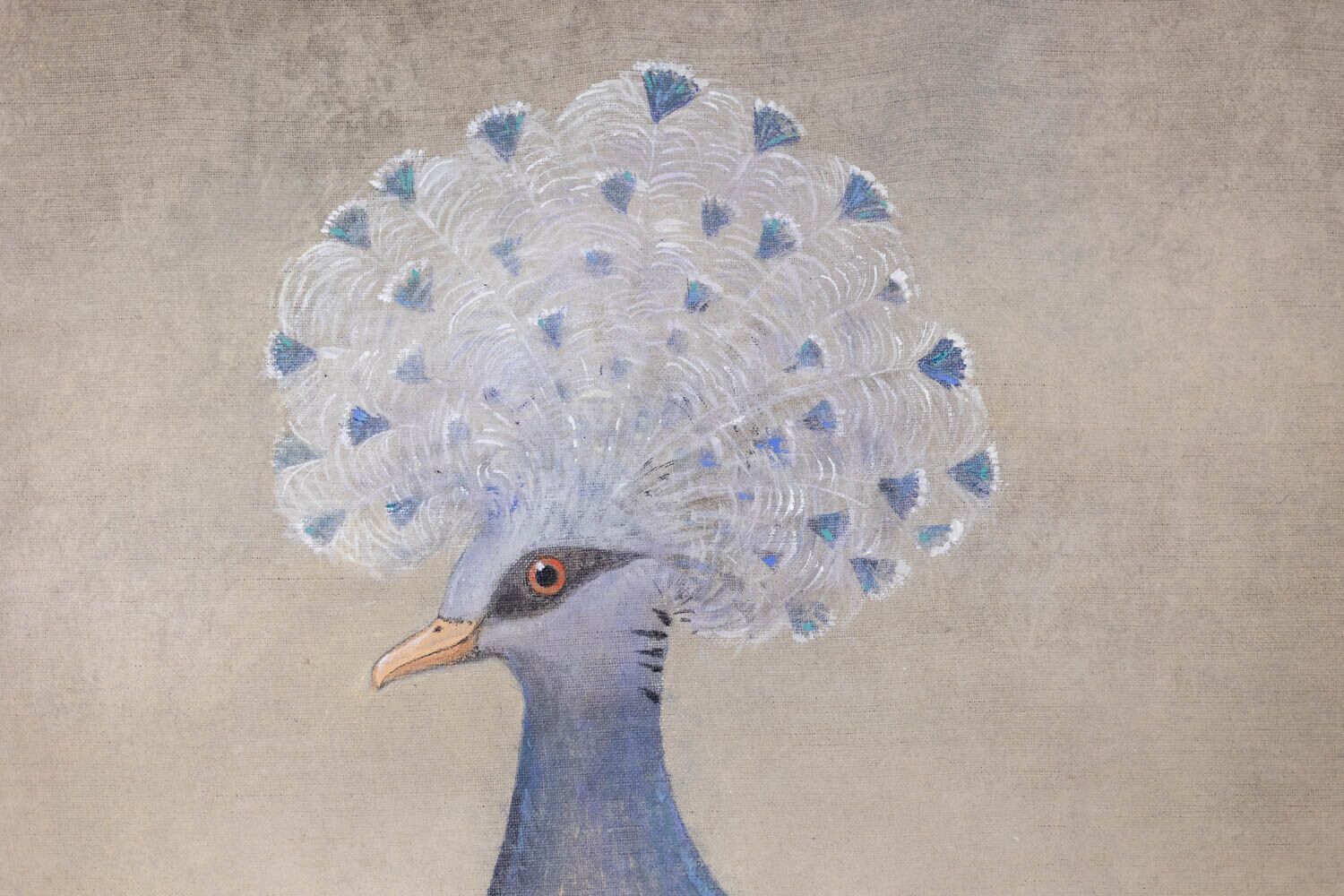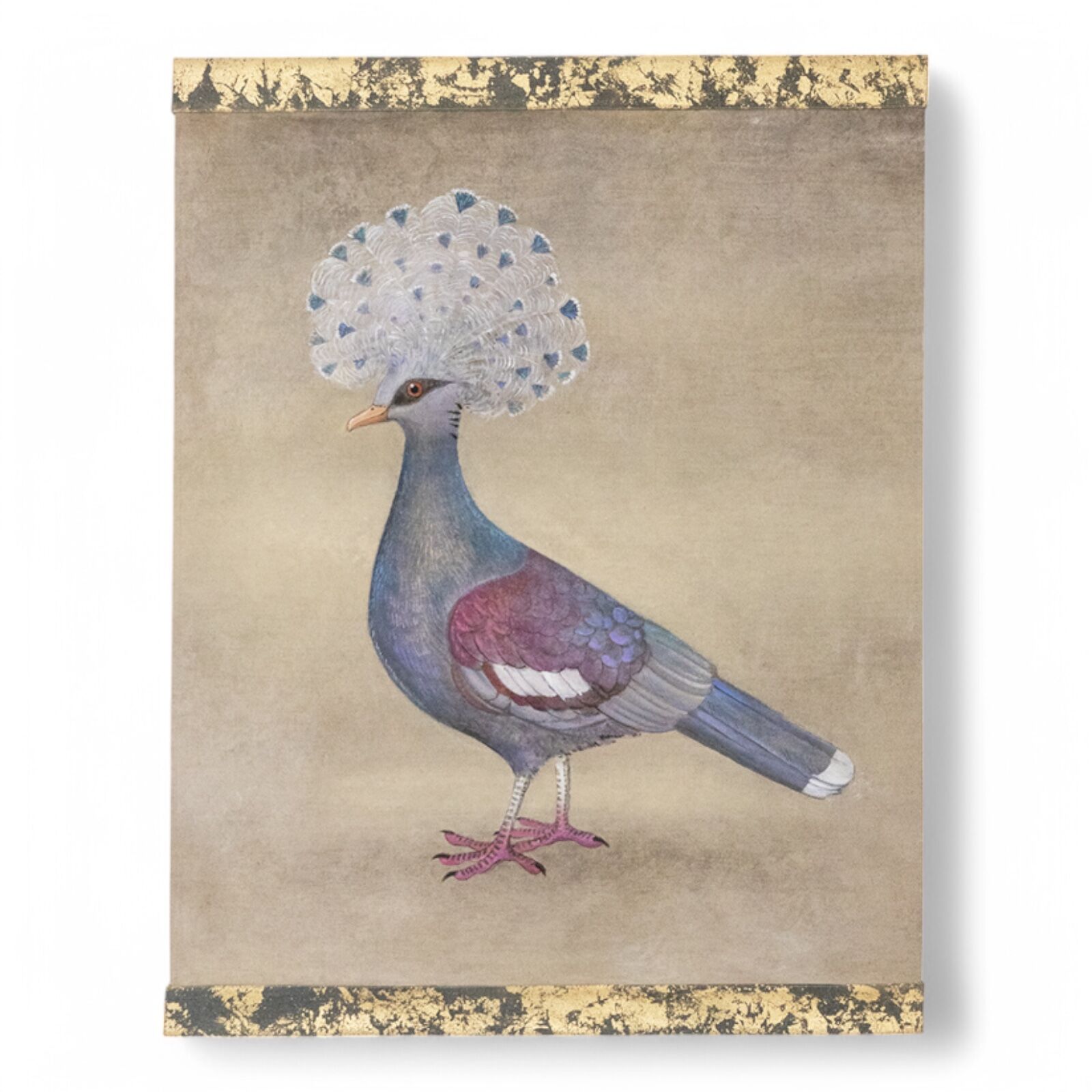 This crested pigeon painting, or decorative panel, features a crested pigeon set against a greige background. It is a contemporary work by French artists, crafted with care and attention to detail. The raw linen canvas is hand-painted using natural pigments, and the striking gold patterns are created with copper leaf. The canvas is stretched with two wooden rods, with a removable bottom rod, allowing it to be rolled for convenient transport.