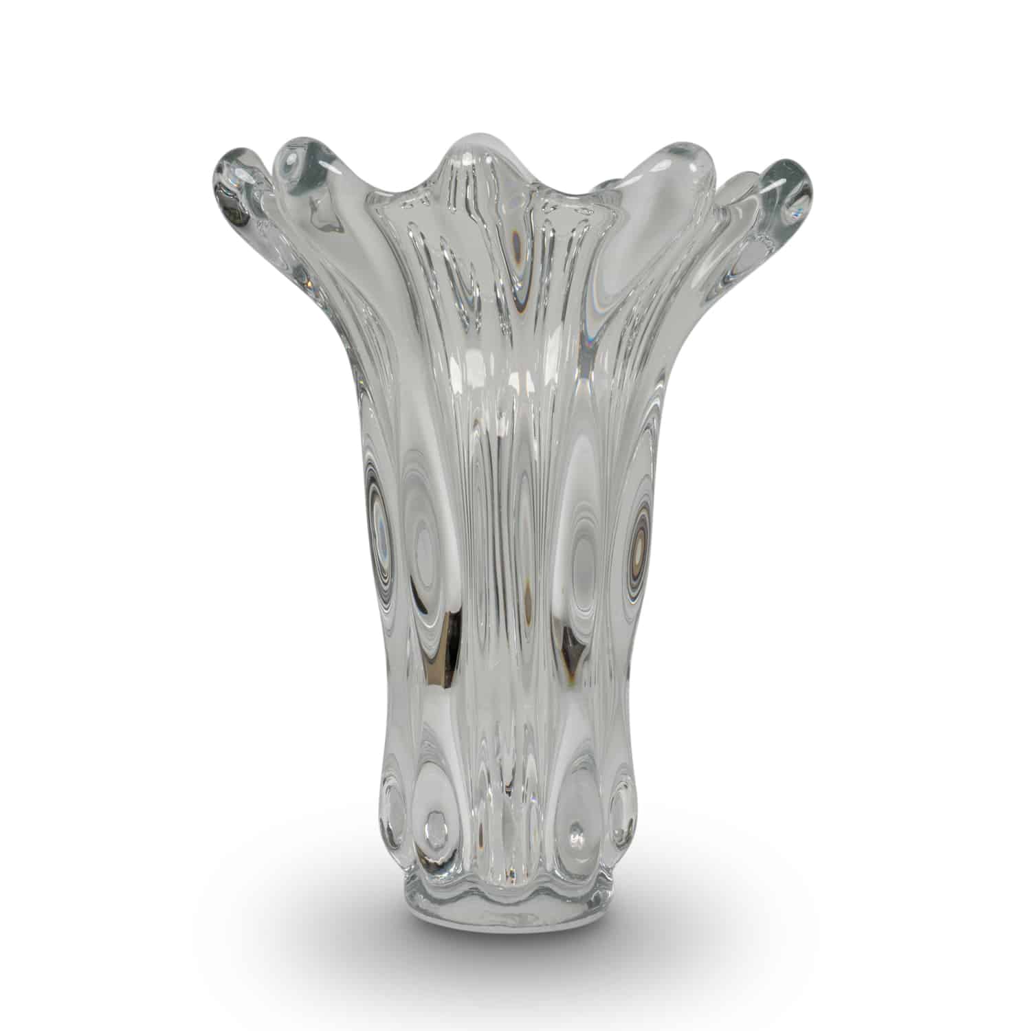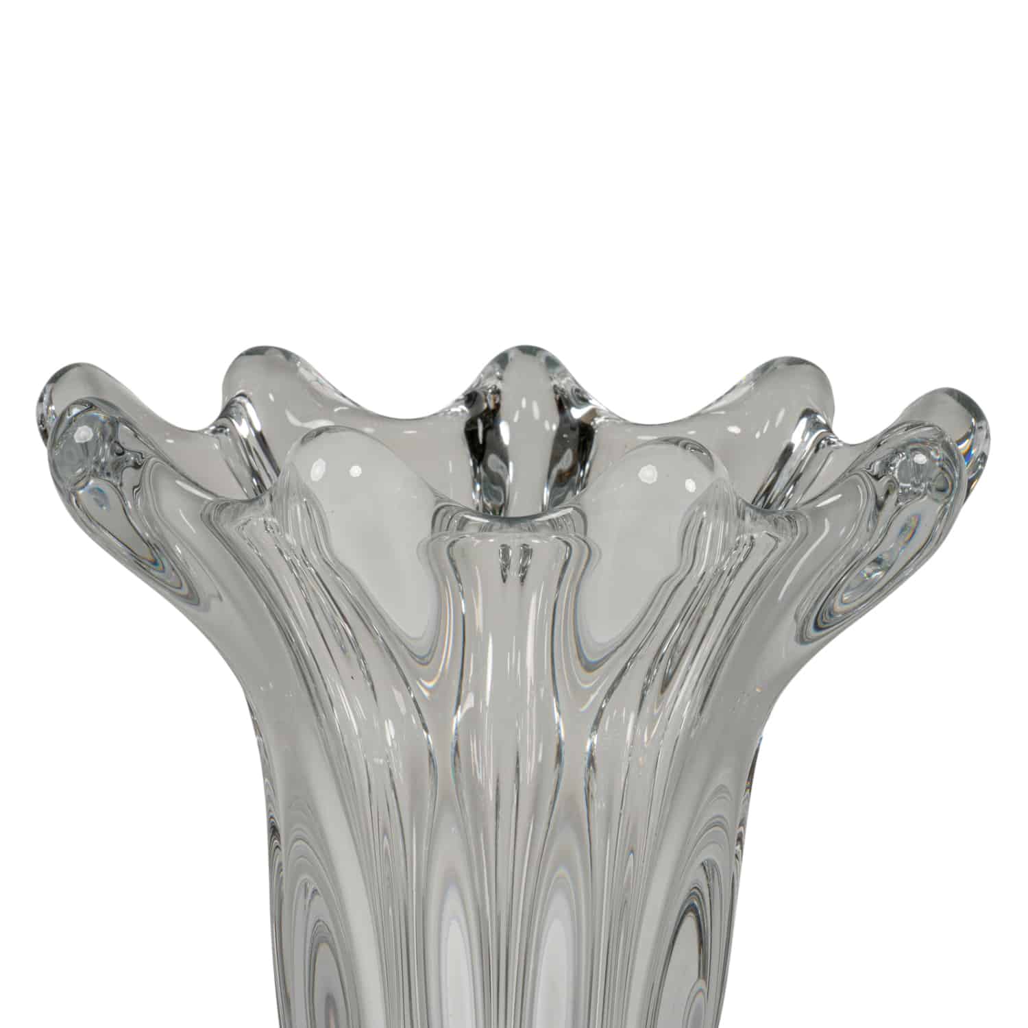 Indulge in the timeless charm of the 1920s with this exquisite crystal vase by Art Vannes. Crafted with meticulous artistry, the vase boasts a delicate corolla shape, a testament to the delicate beauty of nature. Embodying French craftsmanship, it carries the signature of Art Vannes, a mark of authenticity. Hand-blown with precision, this piece captures the essence of art deco design. The vase’s glass curves and opens gracefully at the top, creating a beautiful shape. Overall a wonderful piece of vintage lighting that is ready for your home today.