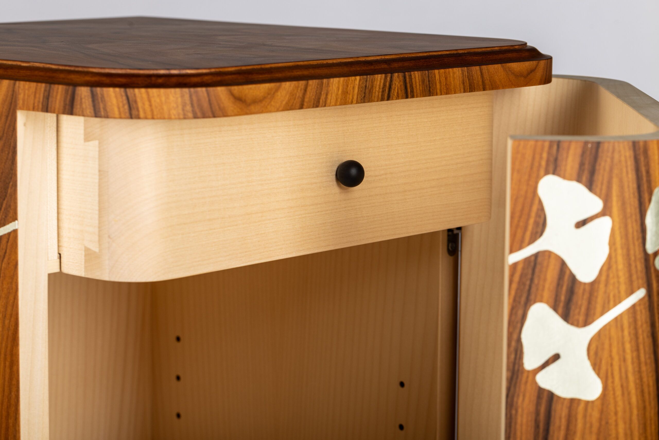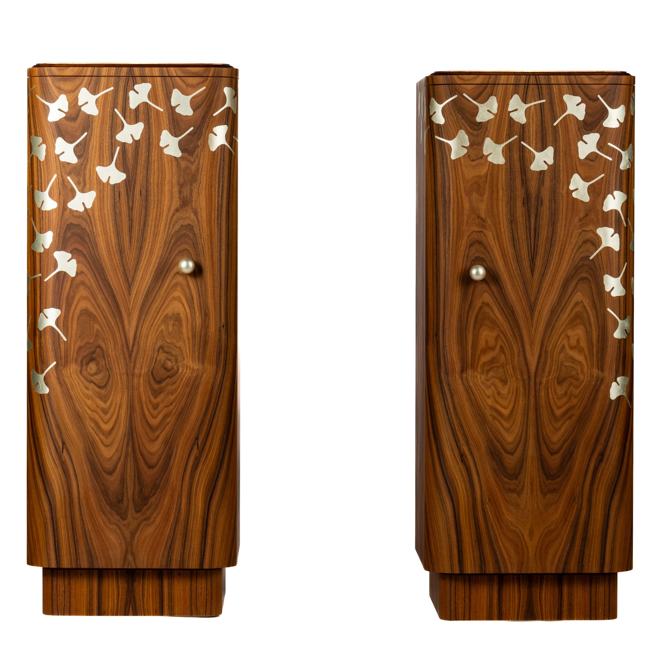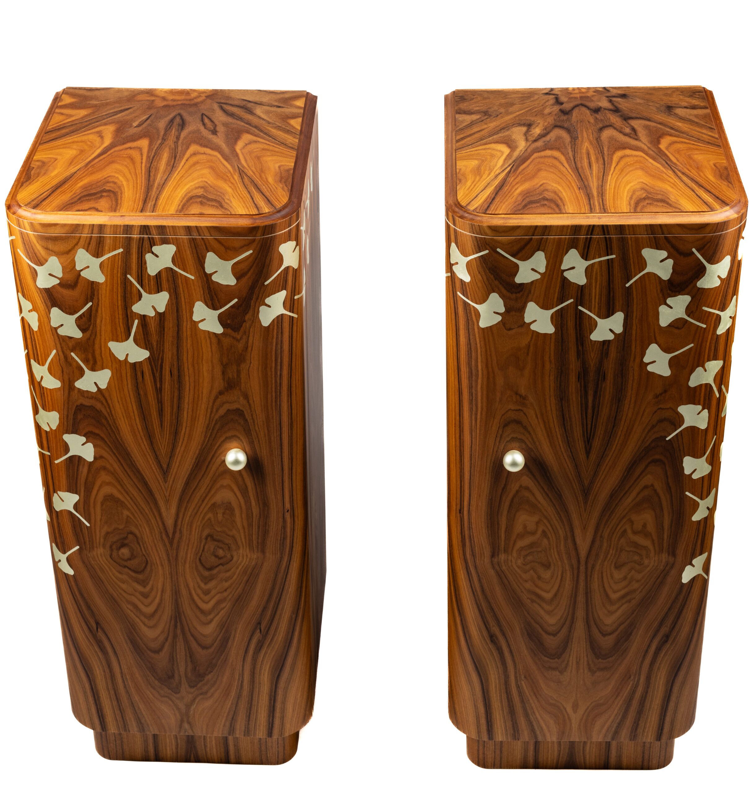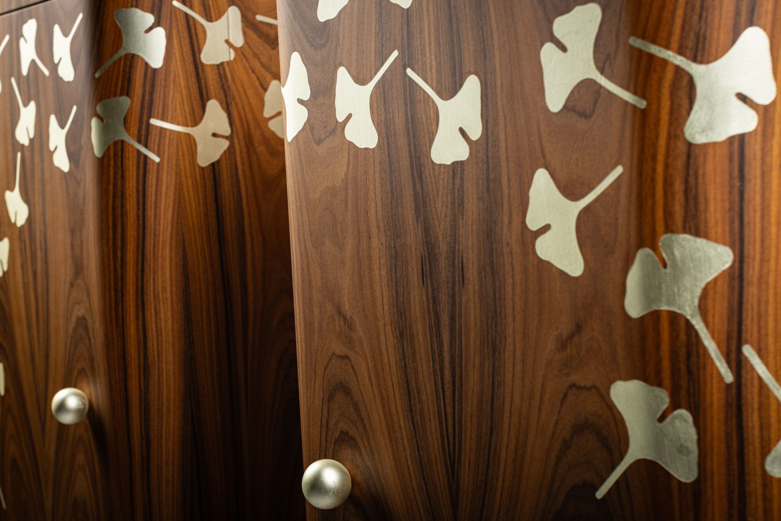 This bespoke Art Deco inspired furniture set, crafted for a couple of collectors, is a unique blend of Art Deco inspiration and personalized design. Called “Concordance” for its harmonious shapes, materials, and overall aesthetic, the pieces were created to complement and elevate the collectors’ existing collection. The two side pieces are positioned beside a Napoleon III console, forming a stunning arch with ginkgo leaves that symbolize nature and elegance.