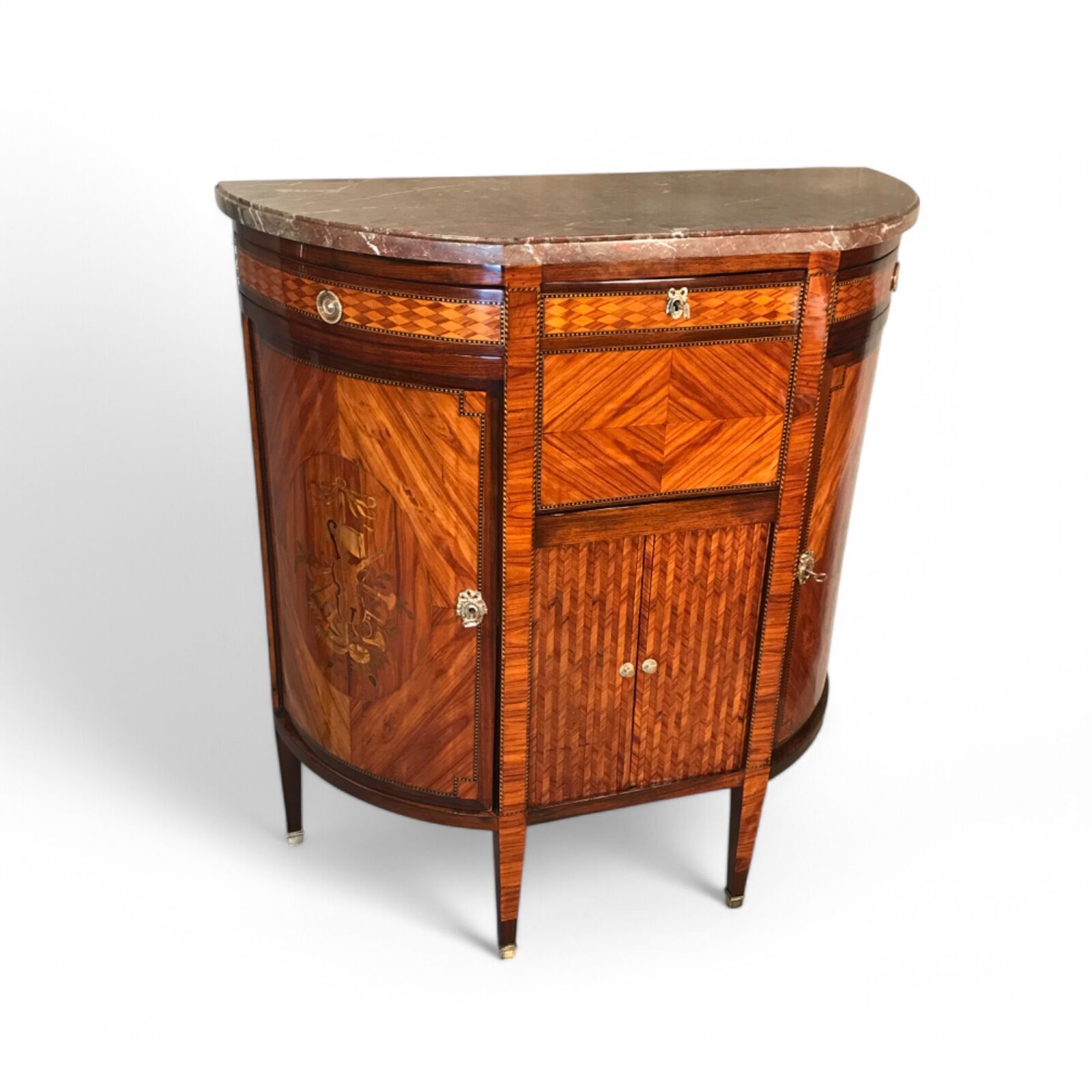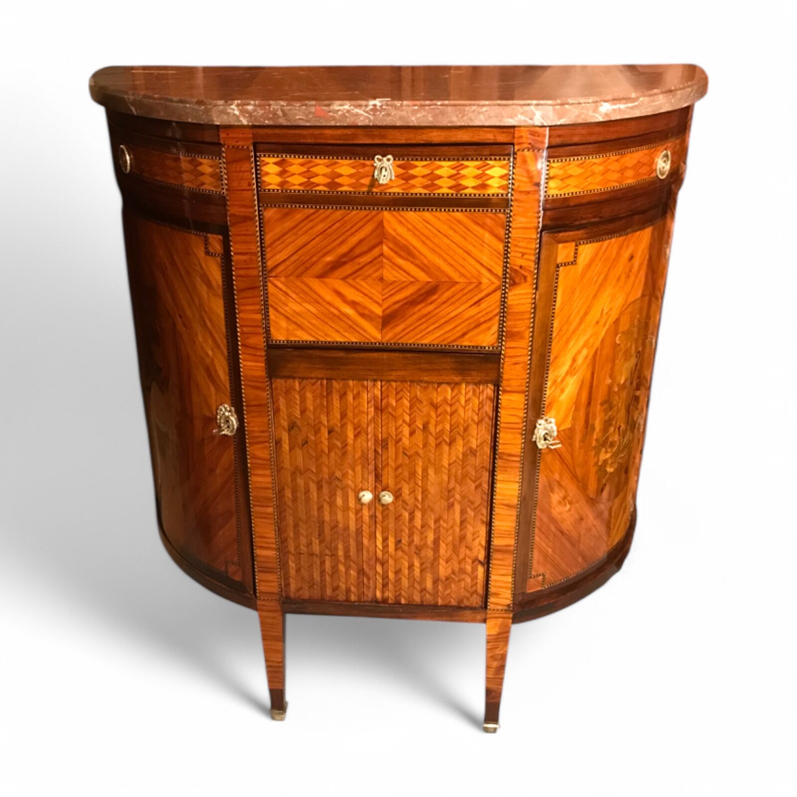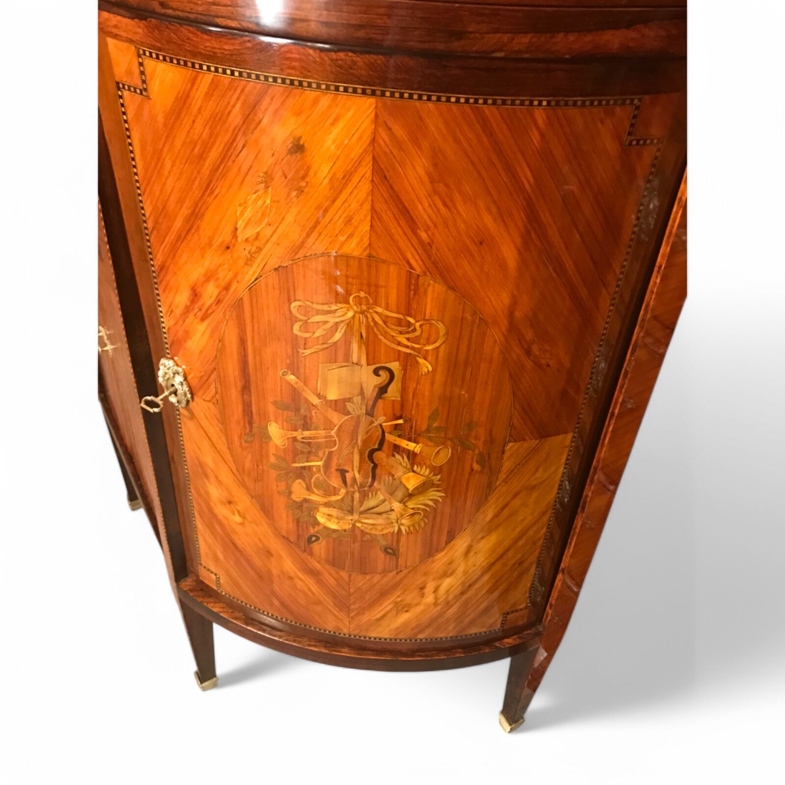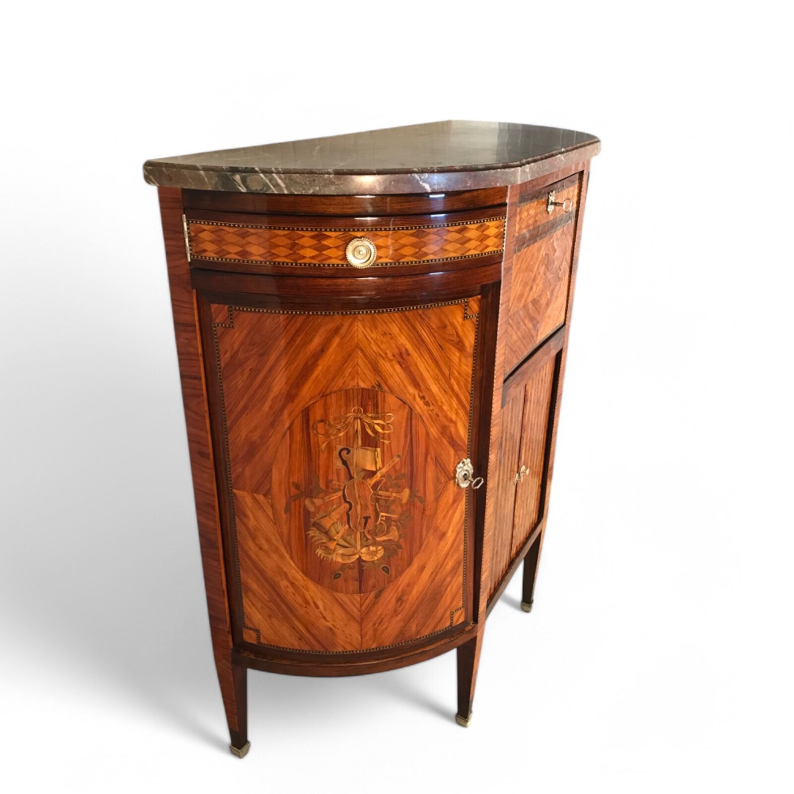On either side, two beautifully adorned doors display delicate marquetry scenes of musical instruments, adding to its artistic charm. Above these doors, two discreet drawers open sideways, enhancing both functionality and uniqueness of this demilune cabinet.