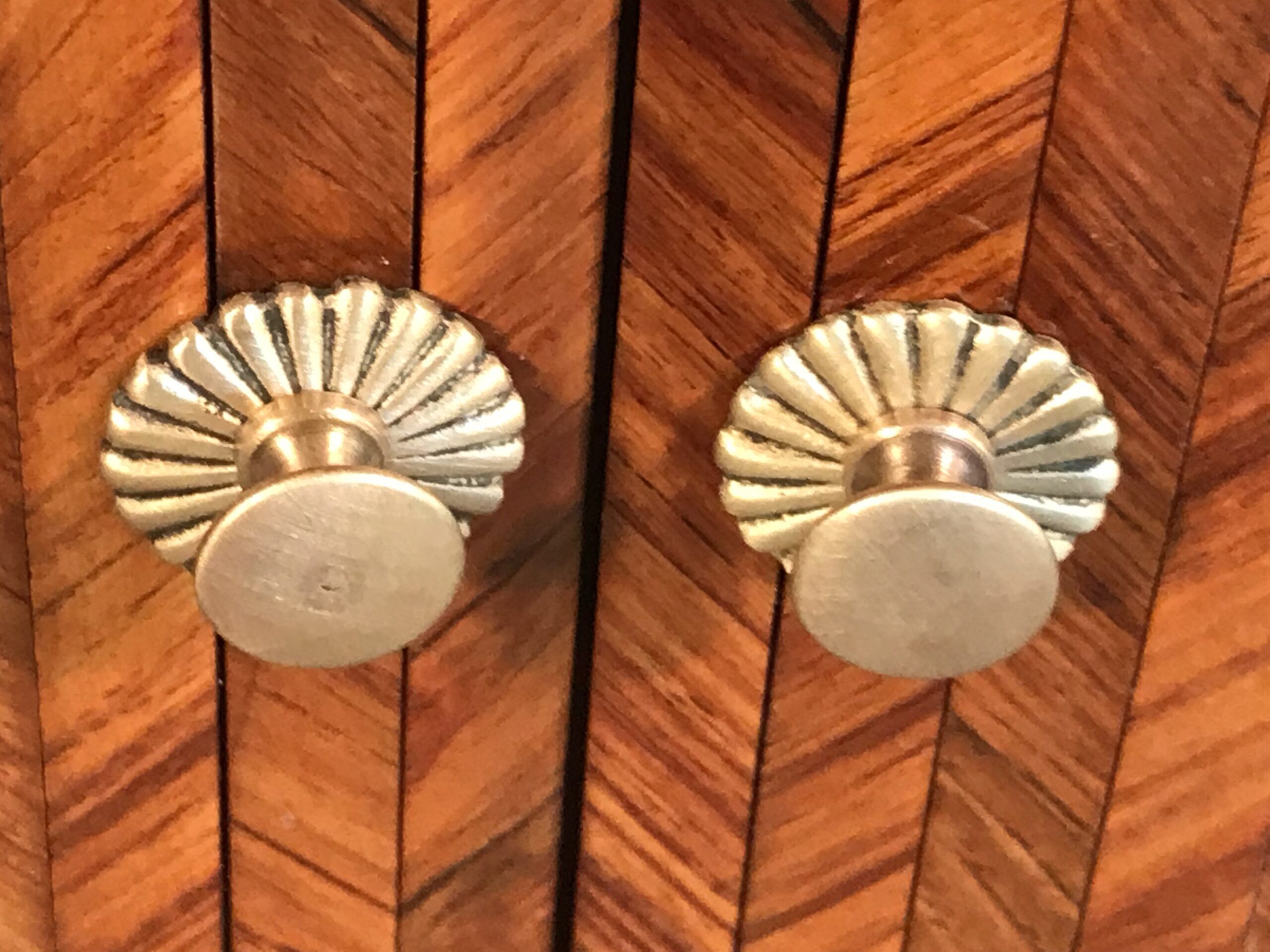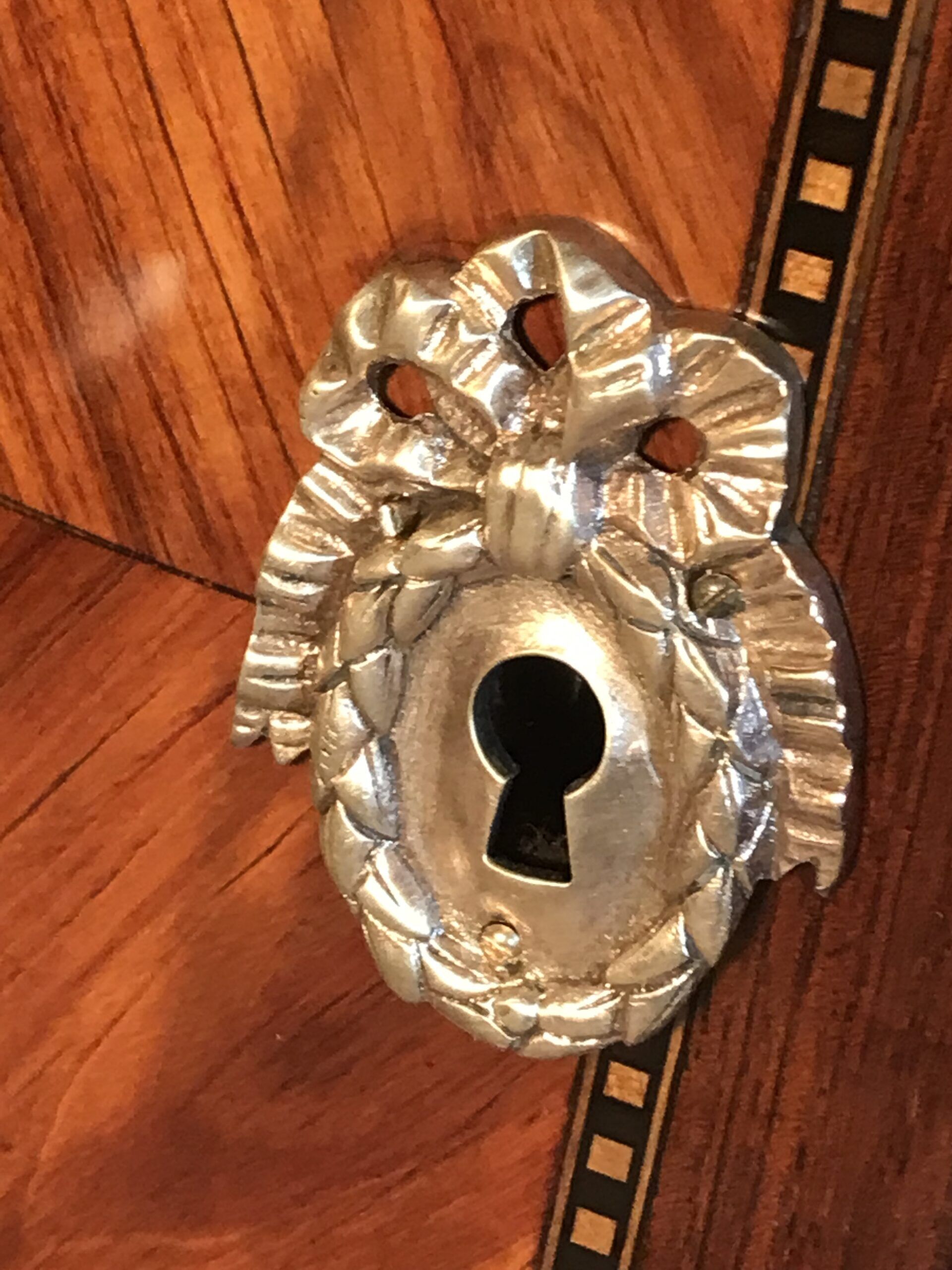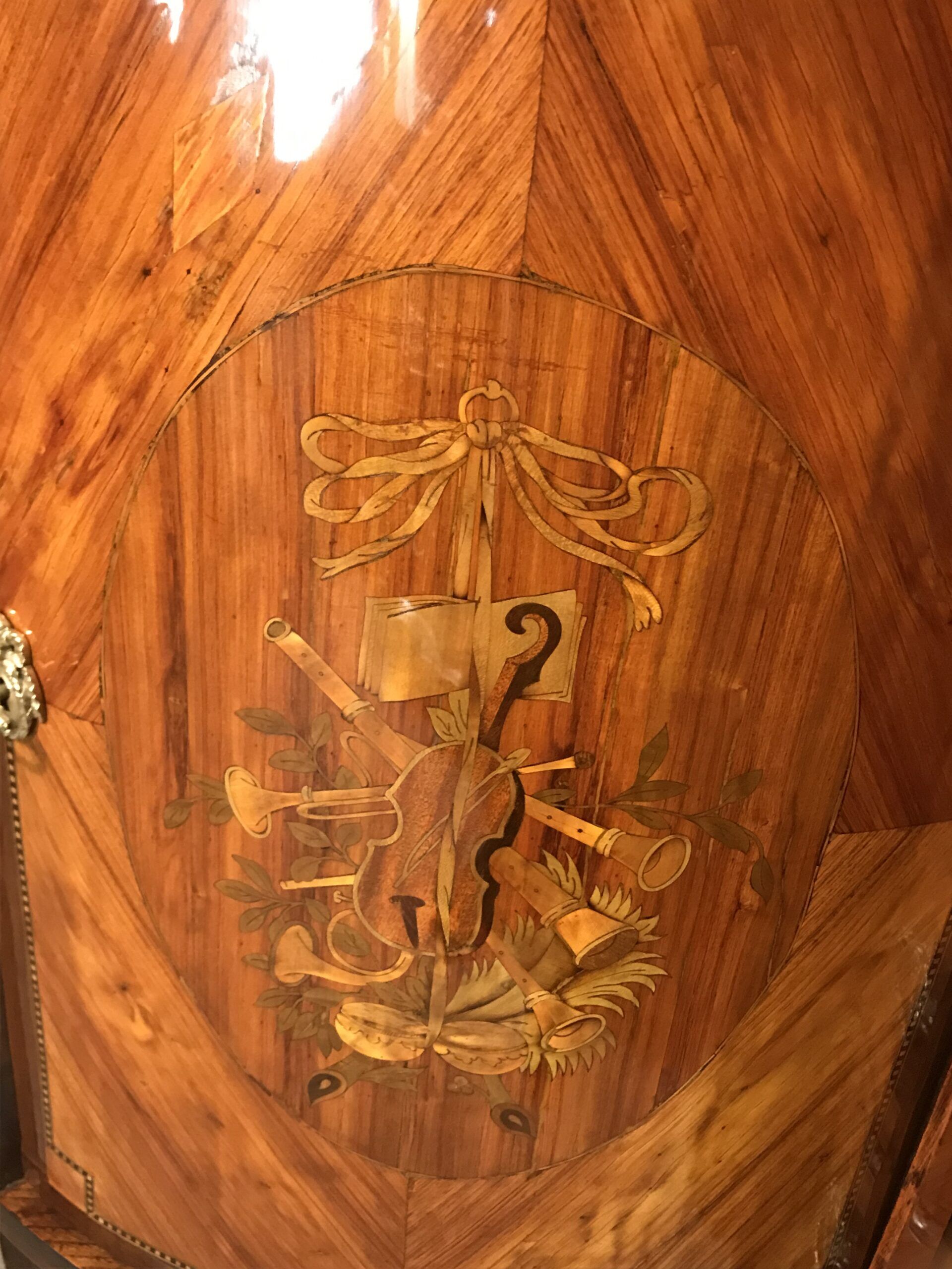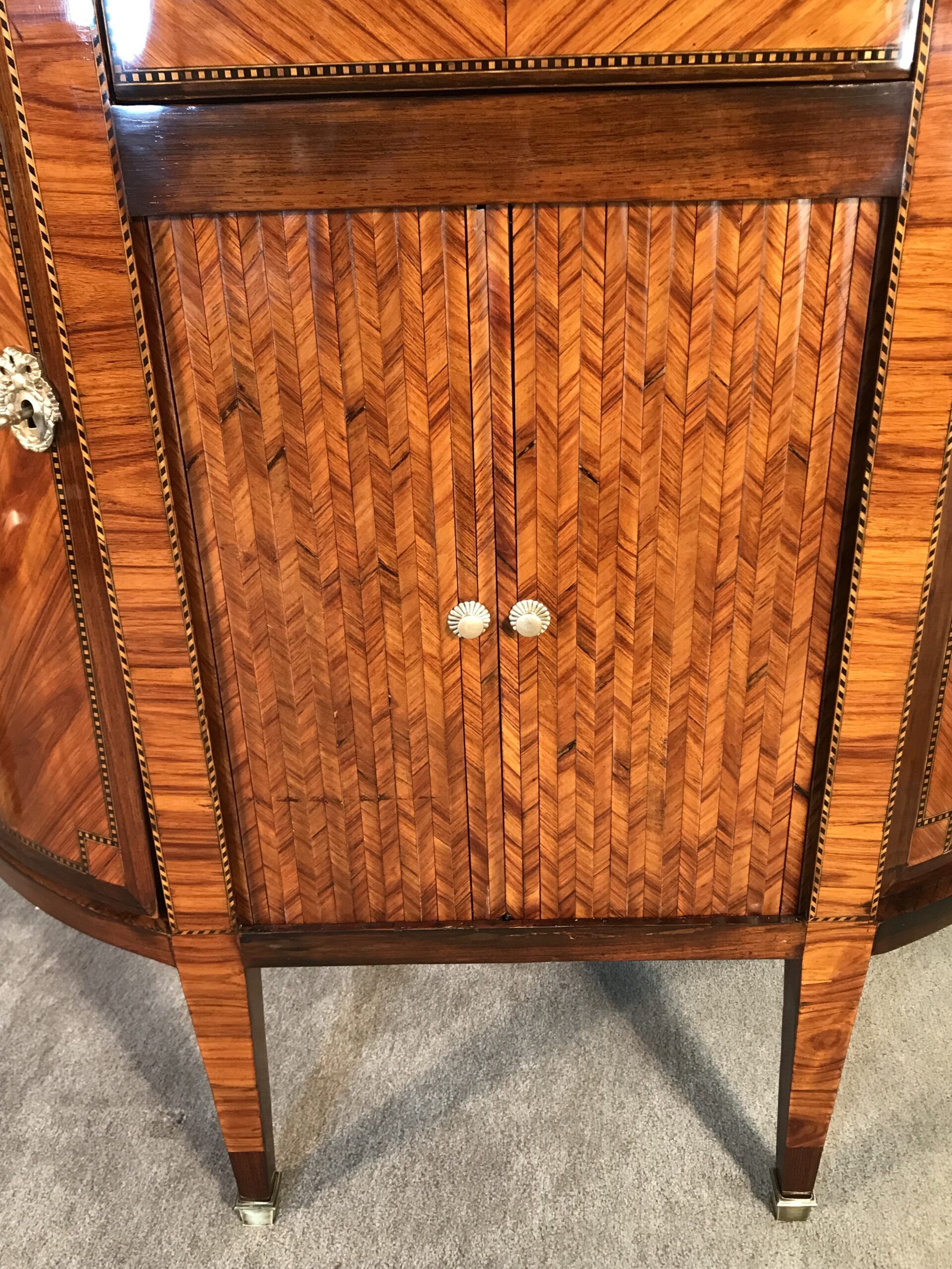 On either side, two beautifully adorned doors display delicate marquetry scenes of musical instruments, adding to its artistic charm. Above these doors, two discreet drawers open sideways, enhancing both functionality and uniqueness of this demilune cabinet.