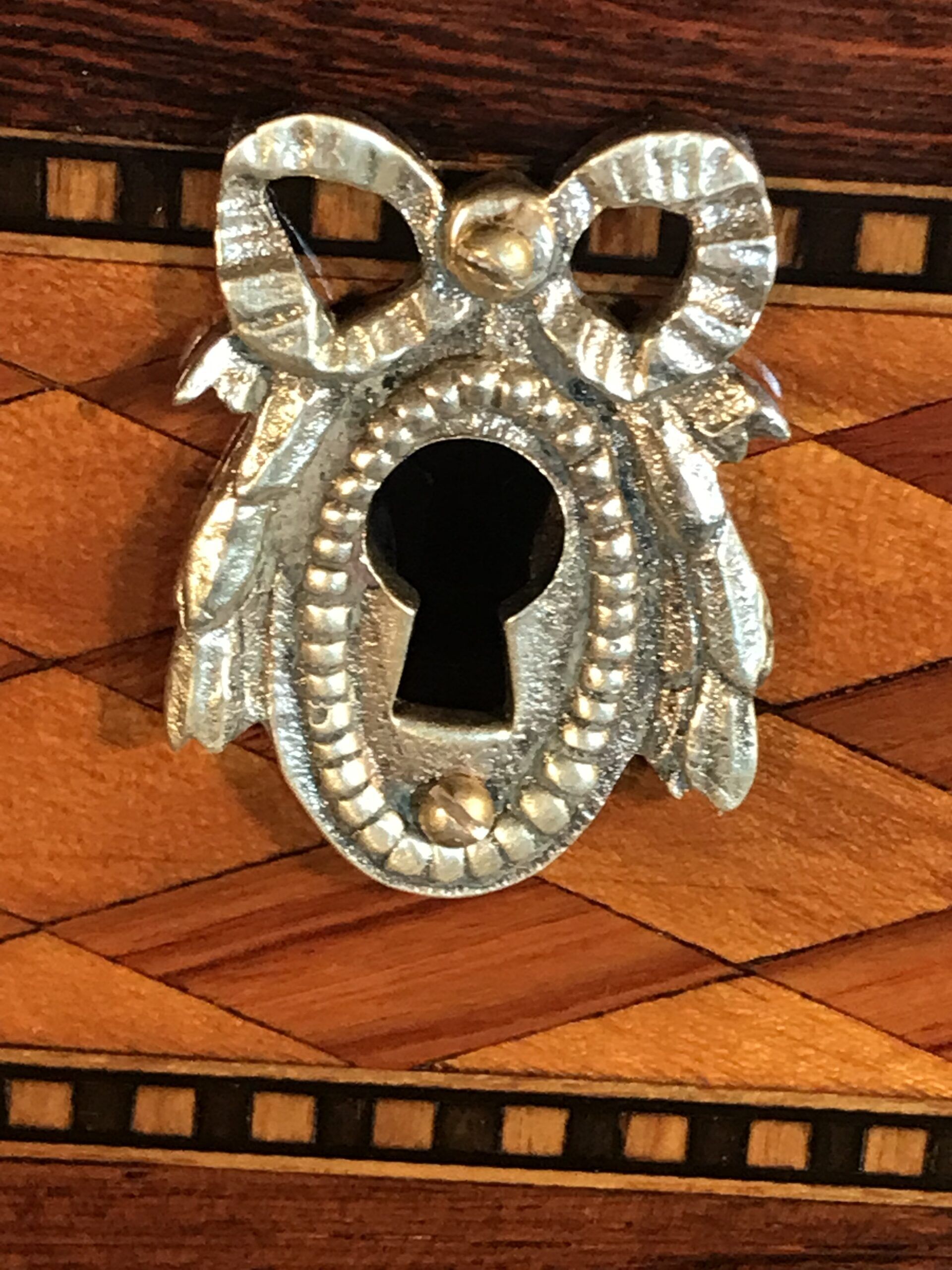 The lower section features jalousie doors with a fishbone veneer décor, offering storage with a shelf and two drawers. The upper middle section reveals a writing flap with a leather top, opening to a refined writing compartment with two drawers and open shelves—perfect for organizing letters or small treasures.