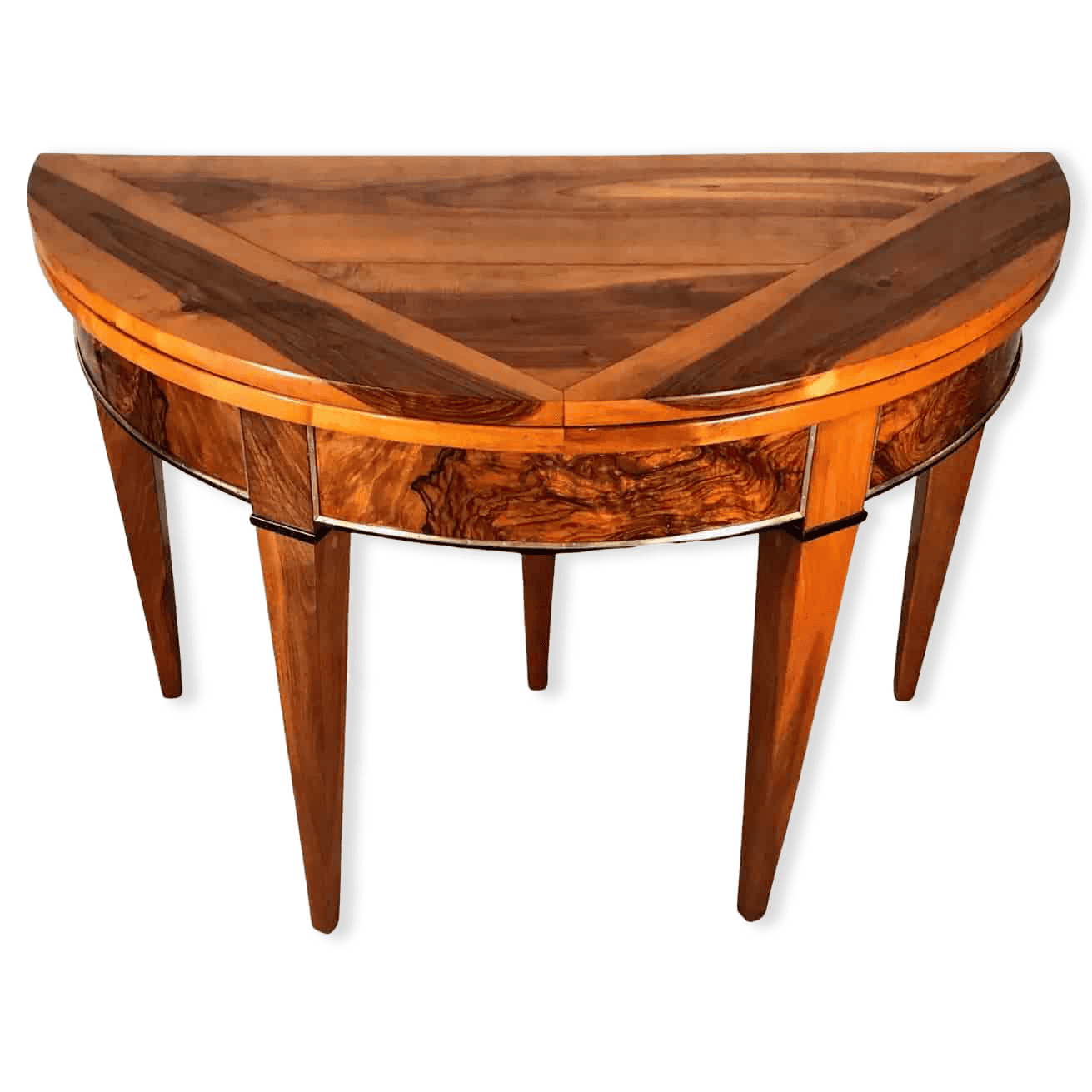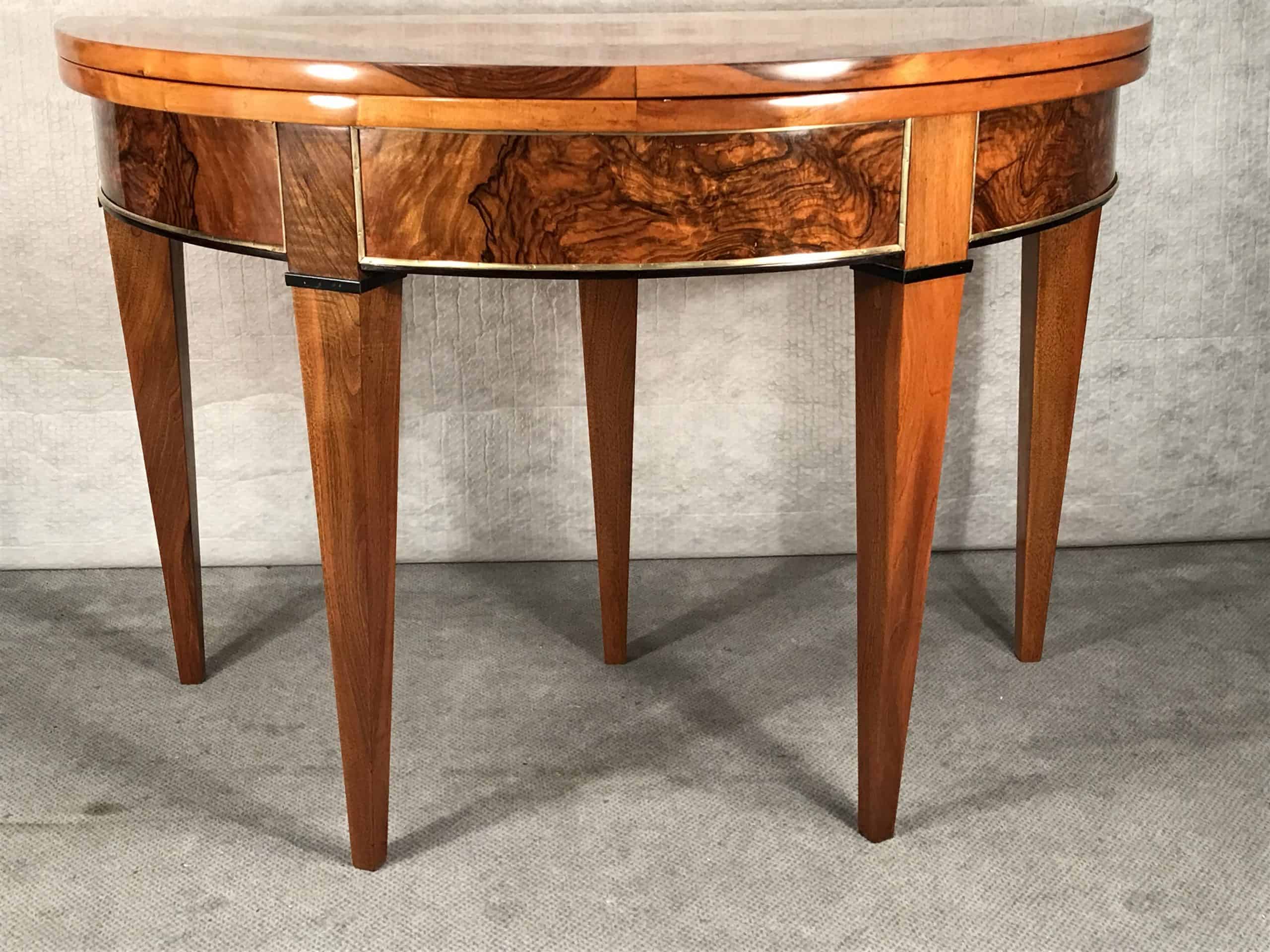 This beautiful Biedermeier Demilune table dates back to the beginning of the 19th century and comes from south west Germany, an area very close to France. It has a gorgeous walnut veneer pattern on the inside and outside of the top. You can use this table as a console table, a game table or additional dining table. The apron has a very pretty root veneer which is framed with brass bands.