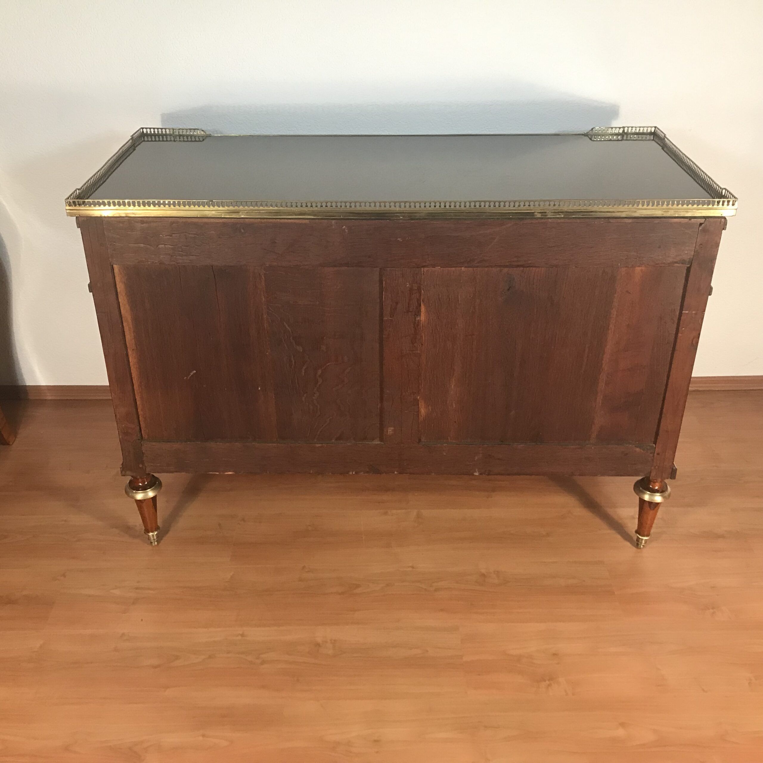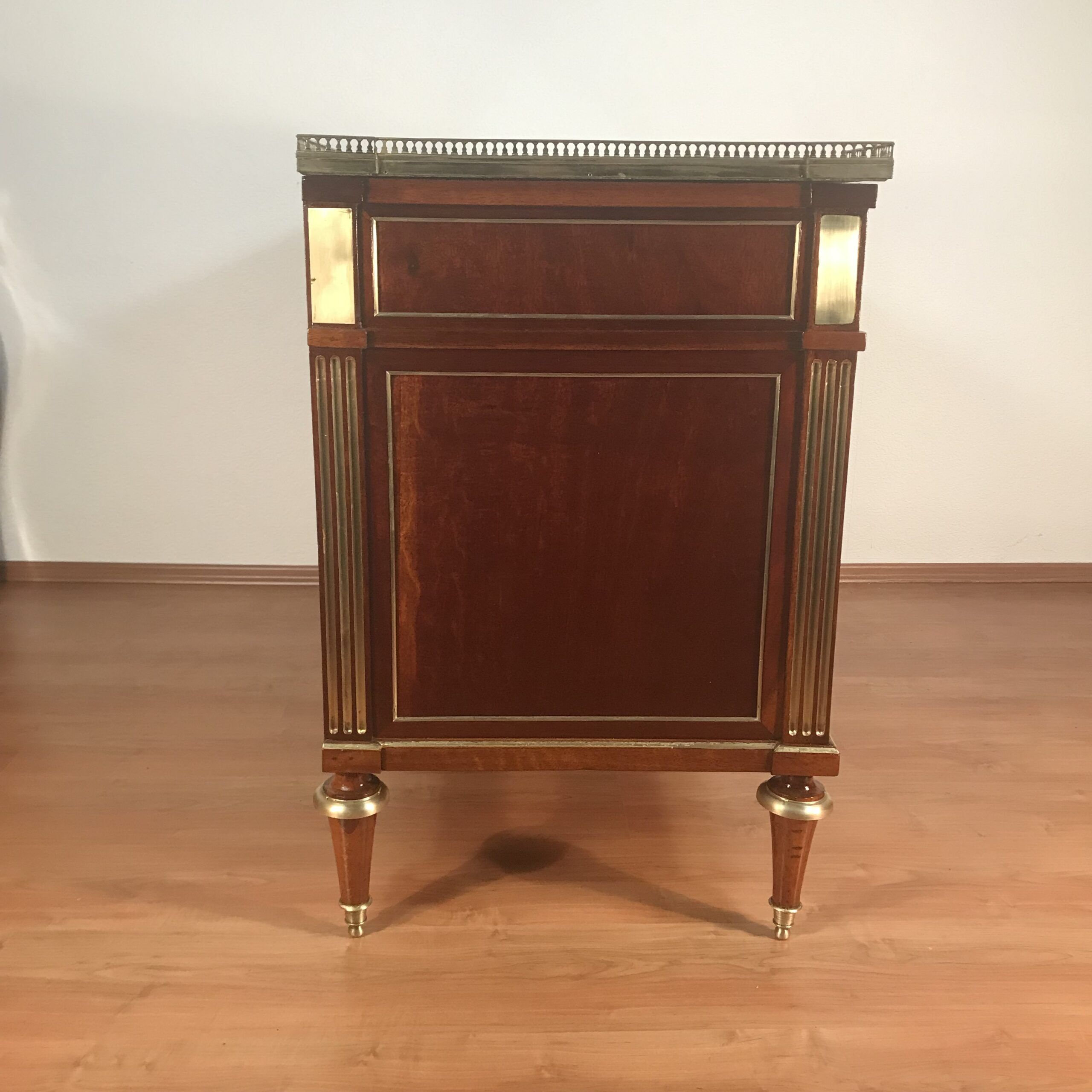 Elegant French Louis XVI chest of drawers dating to circa 1790, crafted in rich mahogany and topped with a marble top. A refined open work brass gallery frames the top, adding both decorative detail and historical authenticity.