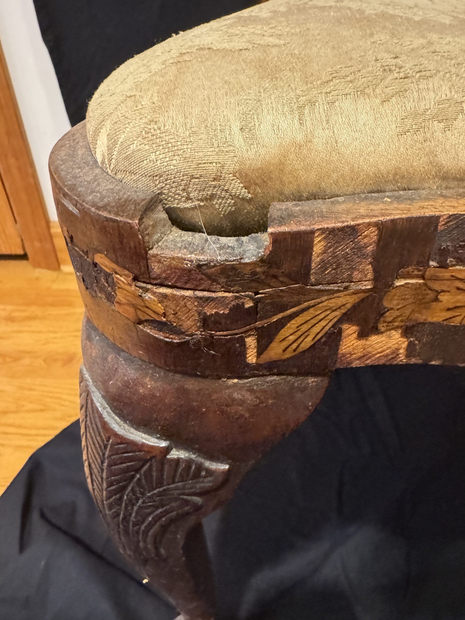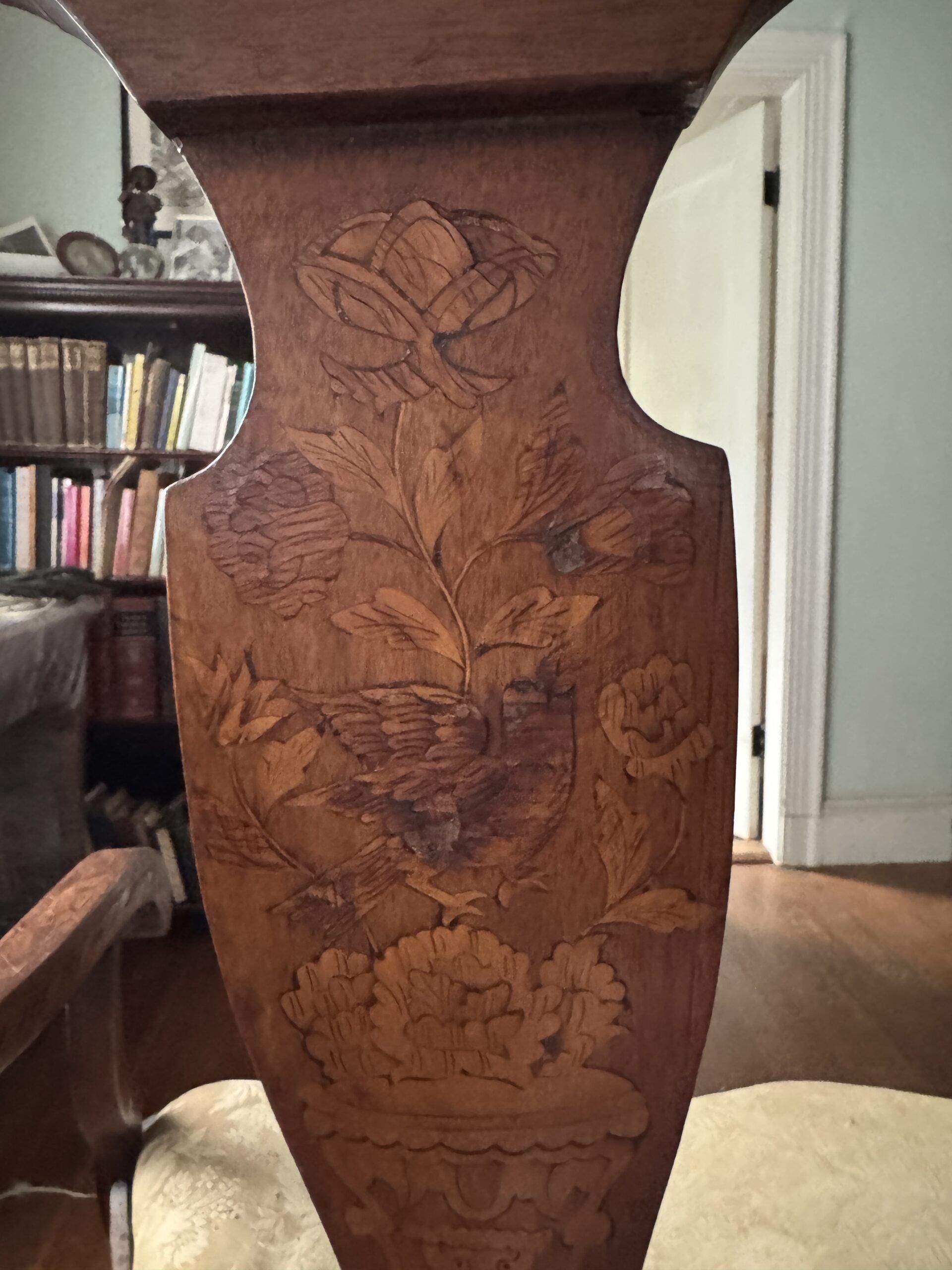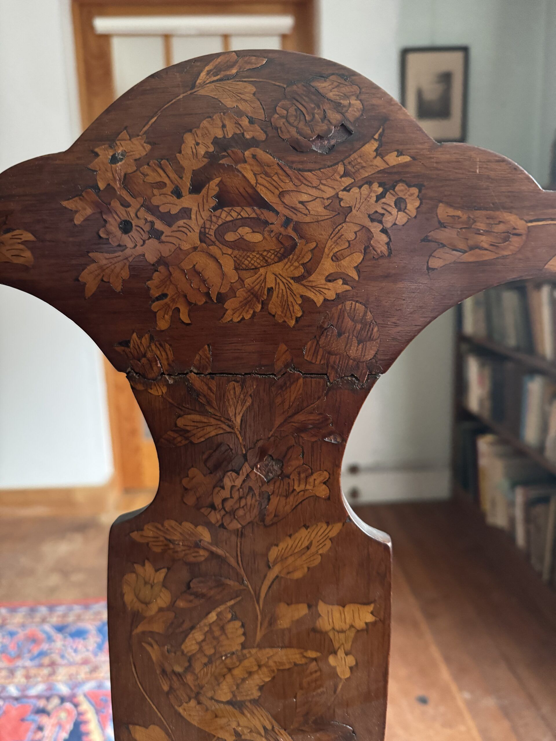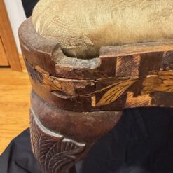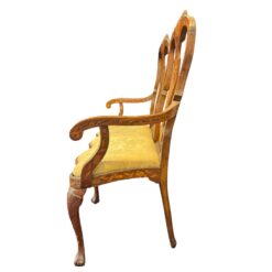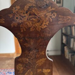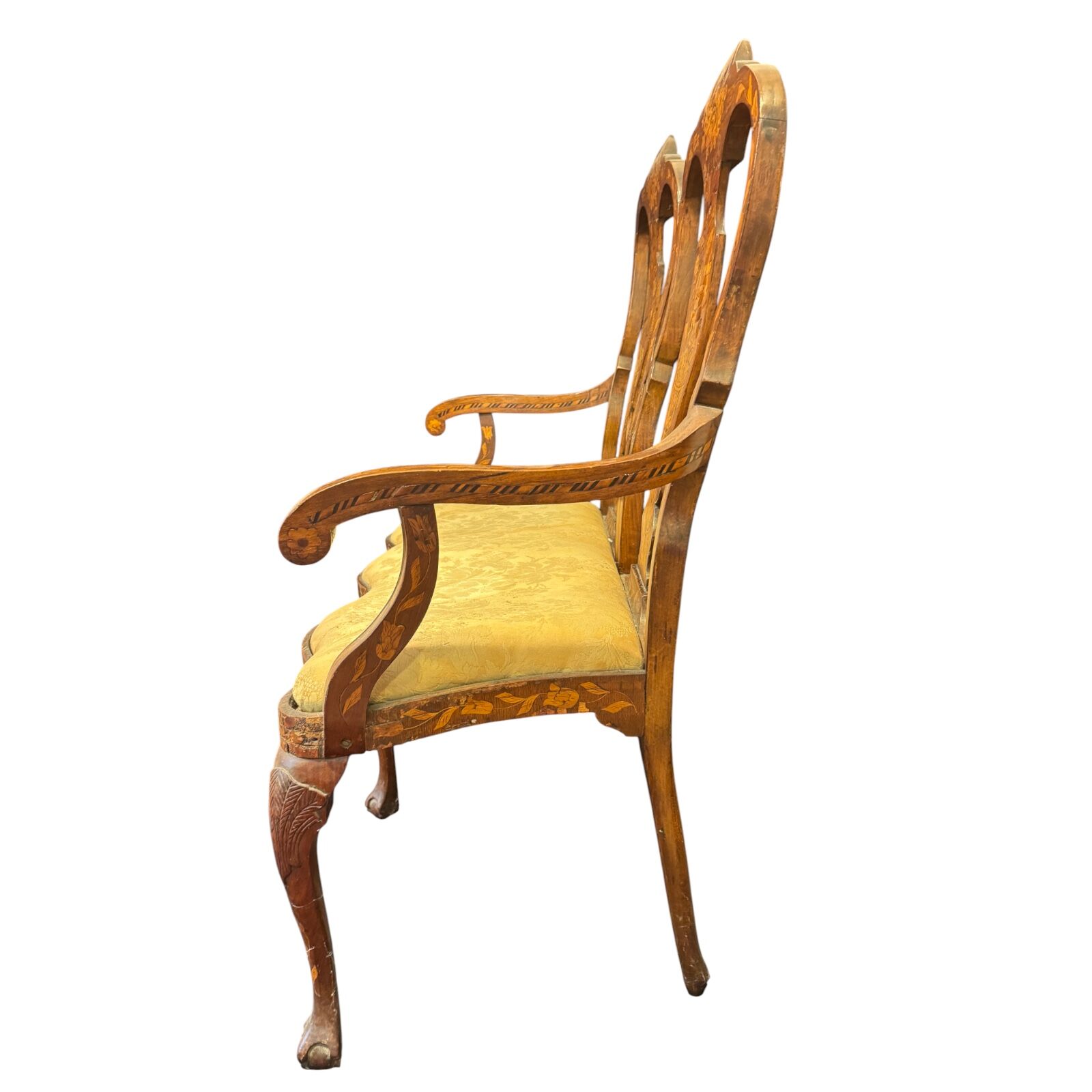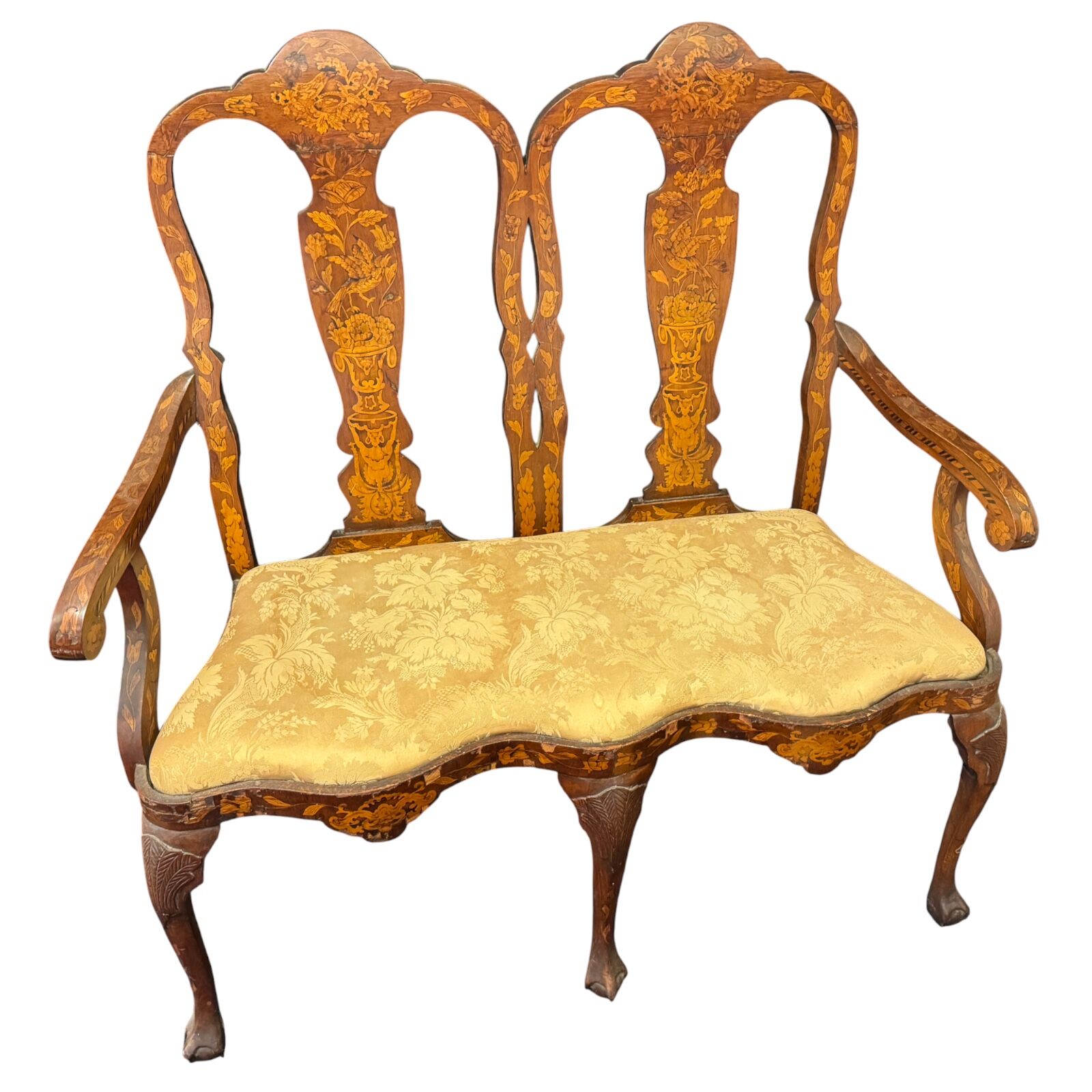 Elegant Dutch Baroque style marquetry two-seater bench, designed to complement side chairs of the same period. The bench features a shaped crest rail above a wide back splat richly inlaid with floral motifs, birds, urns, and foliage. The drop-in seat provides comfort while showcasing the decorative artistry of Baroque craftsmanship. Supported on heavily carved legs, the bench terminates in bold ball-and-claw front feet. Offered in fair condition, with restoration recommended to bring out the full beauty of this finely detailed antique piece.