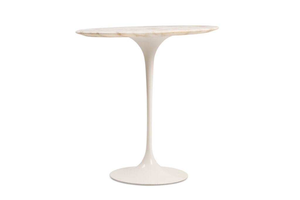 Elegant “Tulip” oval side table designed by Eero Saarinen for Knoll International, featuring a refined Calacatta marble top with delicate natural veining in soft shades of beige. The sculptural white epoxy-lacquered cast aluminum pedestal base reflects Saarinen’s revolutionary approach to modern furniture design.