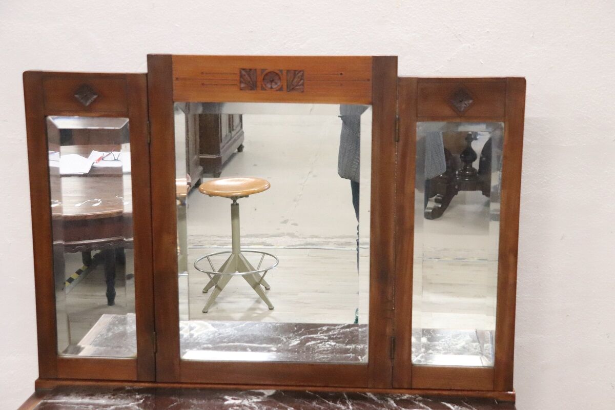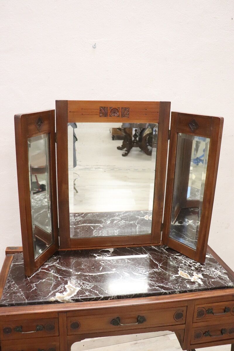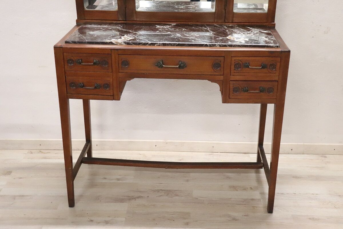 This refined Italian dressing table from the early 20th century is crafted from cherry wood and topped with luxurious dark marble, combining timeless elegance with practical functionality. The piece is adorned with delicate floral carvings and features original finely chiseled bronze handles, showcasing exquisite Italian craftsmanship.
